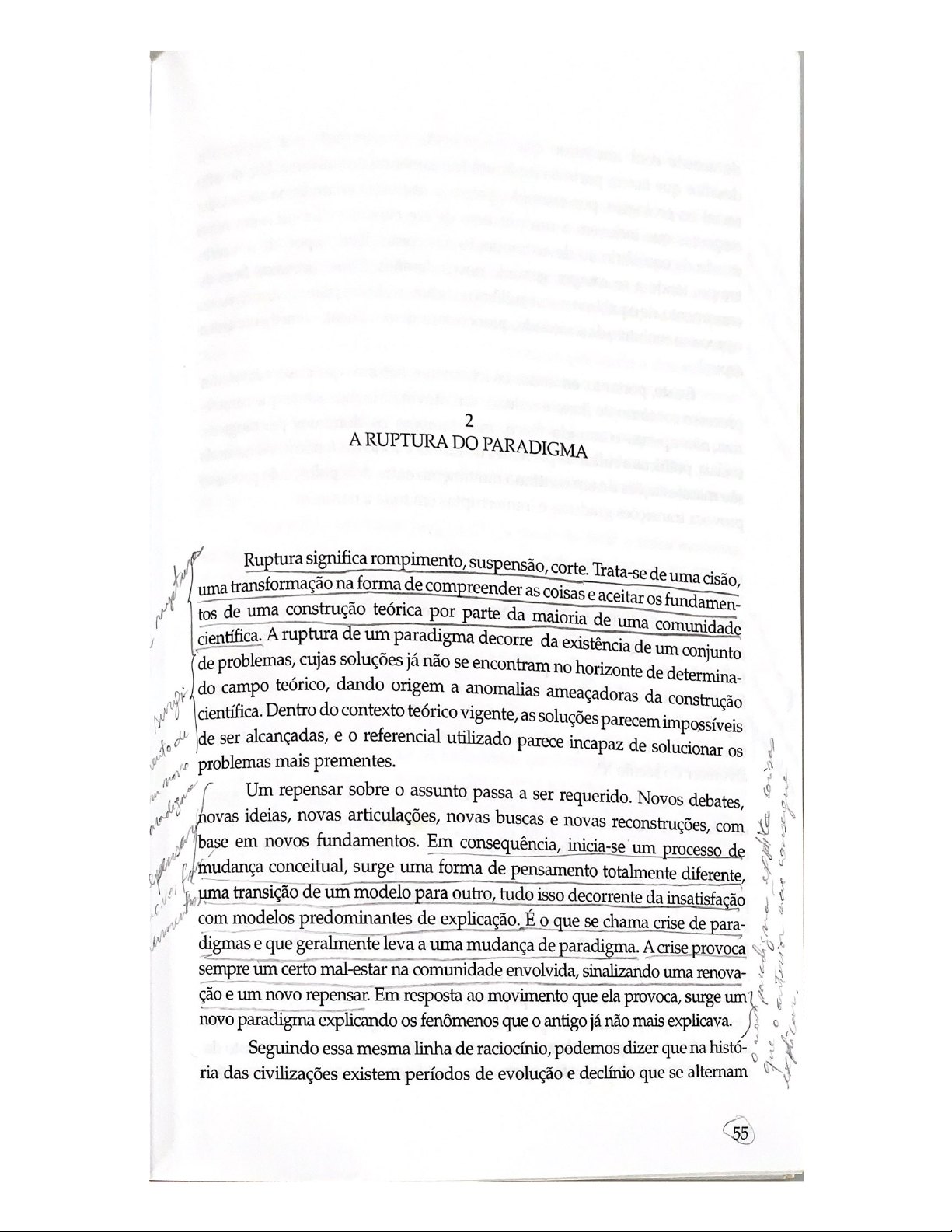 2 A RUPTURA DO PARADIGMA Ruptura significa rompimento, suspensão, corte. Trata-se de uma uma transformação na de compreender as coisas e forma aceitar os fundamen- cisão, tos de uma construção teórica por parte da maioria de uma comunidade científica. A ruptura de um paradigma decorre da existência de um conjunto de problemas, cujas soluções já não se encontram no horizonte de determina- do campo teórico, dando origem a anomalias ameaçadoras da construção científica. Dentro do contexto teórico vigente, as soluções parecem impossíveis de ser alcançadas, e o referencial utilizado parece incapaz de solucionar os problemas mais prementes. Um repensar sobre o assunto passa a ser requerido. Novos debates, novas ideias, novas articulações, novas buscas e novas reconstruções, com base em novos fundamentos. Em consequência, inicia-se um processo de mudança conceitual, surge uma forma de pensamento totalmente diferente, uma transição de um modelo para outro, tudo isso decorrente da insatisfação com modelos predominantes de explicação. É o que se chama crise de para- digmas e que geralmente leva a uma mudança de paradigma. A crise provoca sempre um certo mal-estar na comunidade envolvida, sinalizando uma renova- ção e um novo repensar. Em resposta ao movimento que ela provoca, surge um novo paradigma explicando os fenômenos que o antigo já não mais explicava. Seguindo essa mesma linha de raciocínio, podemos dizer que na histó- ria das civilizações existem períodos de evolução e declínio que se alternam 55por Ma do Rit de permanente estado de mudança, no qual, de formas mais e estruturas mais complexas. das coisas. Este, depois à teoria evolucionista das espécies, os novos conceitos da de desafios. Essas sucessivas indicavam a superação do modelo newtoniano e uma comple- ajustes criativos do maior do que Descartes e Newton haviam imaginado. A Pó xidade da termodinâmica relacionada à dissipação de energia sob a forma da calor introduziu na física a ideia de processos irreversíveis, ou seja, que a fenômenos naturais que de energia mecânica dissipa-se em calor e não pode ser completamente recupe- Ed um movimento incessante Essa lei deu origem ao princípio da entropia que mede a desordem de (Ni também os domínios ao explicar que este tem tendência a crescer ou permane- téc mas Ed no mundo. Todos os mesmo 1996). Por exemplo, se um corpo quente for colocado sociais, movimento entre dois polos, cer contato com um corpo frio, o calor tende a fluir de um corpo quente para cujo são ininterruptas em toda a em frio, reduzindo assim a temperatura no sistema. Gell-Mann (1996, p. 229) provoca um esclarece que "a desordem tende a aumentar num sistema por causa da entropia. De acordo com Heisenberg (1987), a partir de 1900, a física moderna, Novos fatos, novas em especial a teoria quântica descoberta por Planck, introduziu o conceito de Ap século XIX, a visão mecanicista do A partir átomos de energia ou quantum, dando origem à mecânica quântica e à teoria za que se CO rente do quântica dos corpos. Esta teoria levantou uma série de questões, não apenas ciências a perder o seu poder de influência concernentes, aos problemas estritamente físicos, mas também relacionadas Me todas as ocorrência dos fenômenos naturais. Iniciava-se, pe assim, método das ciências naturais exatas e à natureza da matéria. Essas questões fundamenta mundo moderno e o contemporâneo, levaram o físico a reconsiderar também os problemas filosóficos que pareciam Ide entre uma ruptura história o começo de outra, a partir das descobertas estar definitivamente resolvidos na física clássica. Os físicos passaram então a bo alvorecer do século XX. discutir, entre outros aspectos filosóficos, questões relacionadas à essência da As teorias relacionadas com a evolução biológica das matéria, procurando entender os fenômenos que a envolvem, a possibilidade II, de reduzi-los a elementos mais simples e torná-los inteligíveis. Discutiam-se ros do século XIX, inicialmente propostas por Lamarck, segundo também os problemas de natureza epistemológica, verificando até onde é pa os seres vivos teriam evoluído partindo de formas mais primitivas re possível objetivar as nossas observações da natureza ou a experiência senso- simples sob a influência do meio ambiente, e que décadas depois foram rial, independentemente da participação do observador. C propostas por Charles Darwin, fizeram com que os cientistas abandonassem Com as novas descobertas, os físicos foram além do desenvolvimento a ideia cartesiana de que o mundo era uma máquina perfeita construída por da física atômica, buscando encontrar soluções para os problemas enfrentados Deus. Darwin, em sua publicação A origem das espécies, em 1859, trouxe um pela humanidade e que, à primeira vista, interessavam apenas aos filósofos ou da novo modo de pensar o mundo vivente ao introduzir um novo paradigma historiadores da ciência. Em suas reflexões começaram a deparar com princí- liv evolutivo na ciência. Estudando populações, ele demonstrou, segundo Prigo- pios orientadores que possibilitavam novas percepções e conexões valiosas a pu gine (1996), que podemos compreender como as variações individuais sujeitas respeito dos problemas da atualidade. si às pressões de seleção produzem um redirecionamento, um deslocamento da Mas foi Einstein, em 1905, quem fez a primeira grande investida contra m evolução. universo passou então a ser descrito como um sistema em o paradigma da ciência moderna, um ataque tão grande que ele próprio O de E- 56 57de admitir. Todo esse inicialmente não era capaz movimento revolucionaram o pensamento artigos que moderno. dois da da simultaneidade de Portanto, as medições que envolvem espaço e relatividade acontecimentos distintas. são básicos para a teoria de conceber a radiação que caracterizaria absoluto. Esses conceitos maneira