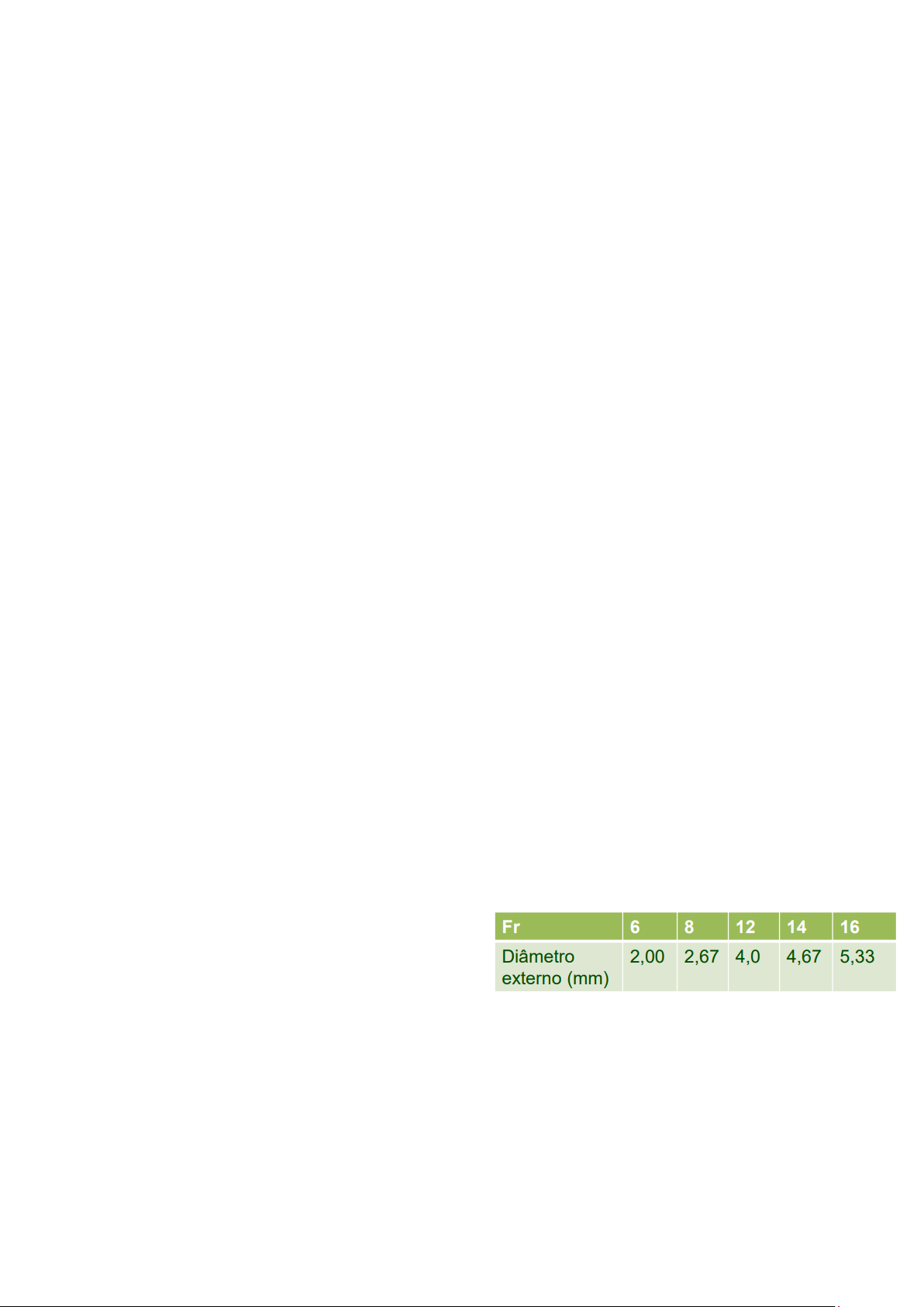 BTO – CASO 08 DRENOS, CÂNULAS E SONDAS Atualmente, tem-se a racionalização do uso desses dispositivos, ou seja, busca-se colocar o menos possível, apenas quando realmente necessário, devido aos riscos de contaminação. Cada dispositivo possui suas características particulares que conferem eficácia em seu uso para o quadro. 1 – DRENOS Ocorre, em sua maioria, no momento da cirurgia, de preferência por um acesso separado da incisão cirúrgica, evitando trajeto sinuoso. Além de precisar ser removido o mais rápido possível, sempre dando preferência a sistemas fechados e introduzidos no espaço vazio, para drenagem de líquido, ar ou outras secreções presentes no espaço cavitário. Podem ser retirados, por exemplo, sangue e secreções decorrentes de procedimentos cirúrgicos, traumas ou infecções, assim como secreções do trato digestivo. É importante saber que o acúmulo de líquidos no sítio cirúrgico serve como meio de cultura, além de aumentar a pressão local e atrapalhar o processo cicatricial, pós cirúrgico ou não, podendo até alcançar uma síndrome compartimental e perda do membro. Tem-se que o gradiente de pressão do dreno deve ser levado em consideração, em relação ao seu tipo:. ABERTO: não há coleta do material drenado, ele sai do dreno diretamente para um sistema contaminado ou meio externo. FECHADO: o material drenado pode ser coletado, pois não há contaminação pelo meio externo, por ser um circuito acoplado ao reservatório estéril. Possibilita, além de análise, quantificação do volume A) TIPOS DE DRENAGEM GRAVITACIONAL: há gradiente decorrente da pressão natural, pelas forças da gravidade, devendo a extremidade externa permanecer mais baixa que o local drenado como, por exemplo, SVD. Muitas vezes, é associado ao sistema de capilaridade, em que a secreção naturalmente escorre pelo dreno. SUCÇÃO (À VÁCUO): há pressão negativa no limite externo, muitas vezes acoplado a um coletor sanfonado que, ao ser comprimido, gera um vácuo de aspiração contínua. B) FIXAÇÃO Pode ser feita por meio de fios de sutura, grampos ou outros métodos que o prendam. Principalmente nas porções internas, pode haver reação de corpo estranho ou tecido cicatricial em volta, devendo haver inspeção adequada quanto ao sítio cirúrgico envolvido, o volume necessário, as características do conteúdo, permeabilidade e tração do dreno e da própria fixação, além do transporte no qual o paciente será submetido, dependendo da mobilização segura do paciente no leito. C) CARACTERÍSTICAS DO DRENO TUBULAR MATERIAL: deve ser de material maleável, atóxico e inerte, para que não sofra reação com as substâncias drenadas, evitando danificação. A maioria é de látex, mais poroso, favorecendo a formação de fibrina e biofilme, podendo ser substituído por drenos de silicone para alérgicos que, ainda que não sejam tão rígidos, tem pouca propensão à contaminação. Podem ser também de polietileno que, ainda que sejam rígidos, são fenestrados e possibilitam a visualização da secreção, ou até de PVC, quando fixos, úteis por não colabarem vasos. TAMANHO: os drenos tubulares são calculados por Fr (French), que equivalem, cada, à 0,333ml, em seus diferentes diâmetros. D) CARACTERÍSTICAS DO DRENO LAMINAR MATERIAIS: Os drenos laminares podem ser achatados fixos ou maleáveis, sobretudo feitos de borracha sintética, com exceção do dreno de Penrose, que é feito de látex. Existem alguns outros feitos de silicone, que acabam por se manifestar de forma transparente e radiopaca, formando linhas paralelas pelo trajeto E) OUTROS DRENOS DE TÓRAX: geralmente é siliconizado e fenestrado, com extremidade interna arredondada e atraumática, com filamento radiopaco para visualização em RX. Serve para reestabelecer a pressão negativa da cavidade, quando alterada devido a presença de ar, pus ou sangue nos espaços intrapleurais ou mediastinais. MALECOT: é feito de borracha natural e maleável, com borda arredondada em forma de botão, com alças (4) de autorretenção, para fixação no local, muito utilizado em nefrostomia percutânea ou gastrostomias, de forma temporária. PEZZER: é de borracha maleavel, também com extremidade arredondada em forma de botão, com orifícios para autorretenção e fixação PIGTAILS: são drenos com final em curvatura, em “forma de rabo de porco”, com cabos flexíveis, também úteis para autorretensão, possíveis de introduzir por auxílio de ultrassom ou drenagem guiada, sendo removidos geralmente com auxílio de fio guia para desenrolar a extremidade distal. F) INDICAÇÕES Podem ser, por exemplo, utilizados após ressecções cirúrgicas ou zonas de anastomose, como em esplenectomias ou nefrectomias, assim como áreas cruentas com pouco tecido restante para tamponamento, como o caso de mastectomias. Ainda, podem ser utilizados para auxiliar a reconstrução ou recanalização de vasos, como em cistostomia, ou drenagens de abscessos ou coleções, como em abcessos pleurais. 2 – CÂNULAS São túbulos rígidos ou semi-rígidos, geralmente feitos de metal ou plástico, com ambas as extremidades pérvias. Devem ser introduzidos por aberturas naturais, seja por feridas operatórias ou órgãos, úteis para injetar medicamentos, aspirar fluídos ou passagem de instrumentos (percurso). OROFARÍNGEA: ou cânula de Guedel, é feita de PVC flexível ou polipropileno, curvilínea, servindo para manter a via aérea aberta em pacientes com baixa (ou sem) consciência NASOFARÍNGEA: são cânulas maleáveis, curvas, com bordas arredondadas, feitas de PVC siliconizado, úteis para evitar engasgos e, ainda que seja introduzida na faringe, não provoca vômitos OROTRAQUEAL: ou cânula de Rusch, é de plástico maleável e atóxico, podendo ou não ter CUFF para fixação, graduada em centrímetros TRAQUEOSTOMIA: introduzidas nas aberturas traqueais, promovem comunicação interior e exterior, possi