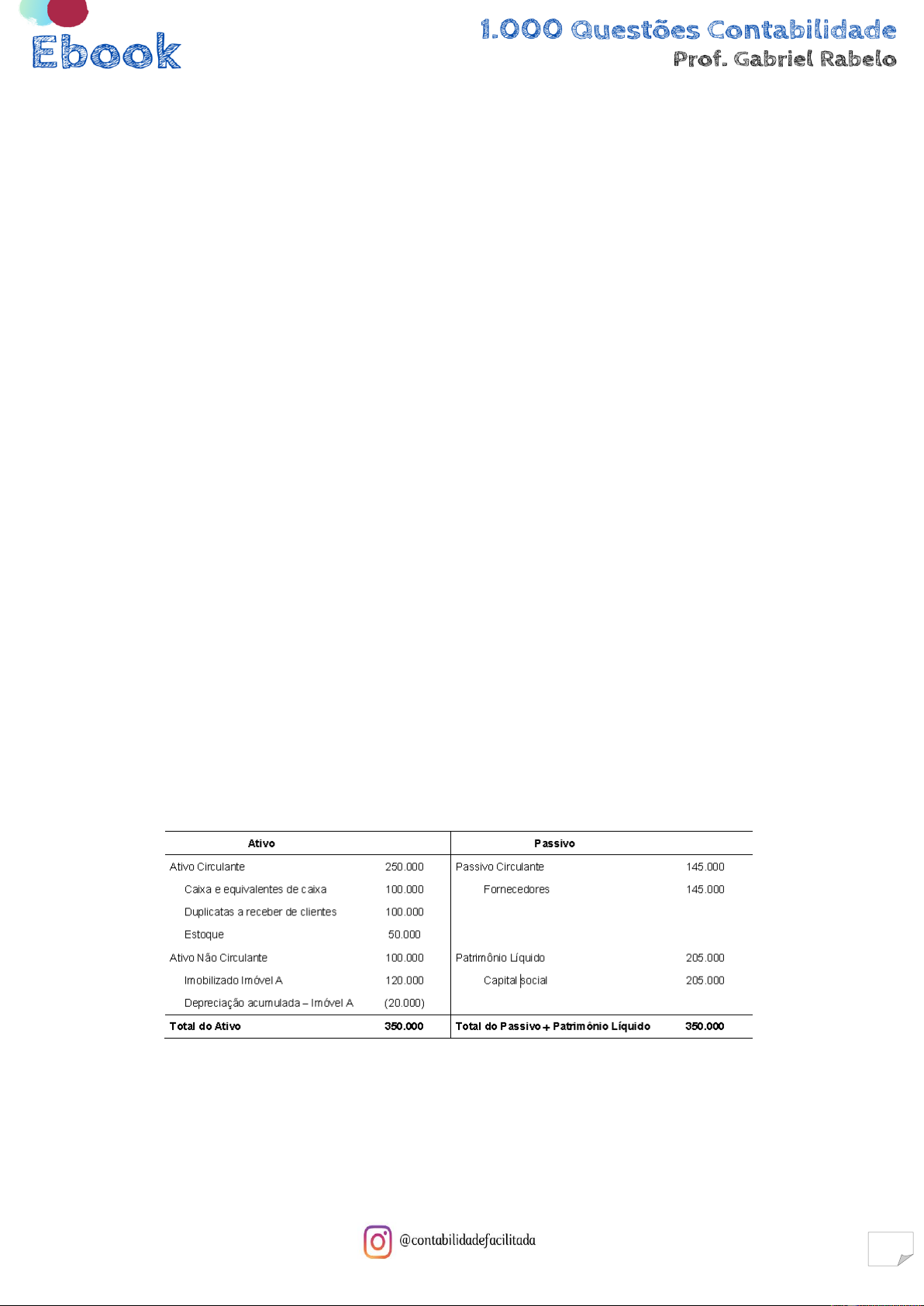 Ebook 1.000 Questões Contabilidade Prof. Gabriel Rabelo 75 − Imobilizado R$ 170.000,00 − Depreciação Acumulada R$ 36.000,00 Durante o mês de dezembro de 2017, a Cia. Comercial realizou as seguintes operações: − Aquisição de estoque no valor de R$ 50.000,00, à vista. − Pagamento de R$ 18.000,00 aos Fornecedores. − Obtenção de empréstimo, em 01/12/2017, no valor de R$ 200.000,00, sendo que a taxa de juros compostos contratada foi de 3% a.m. Os juros serão pagos no vencimento, em 30/11/2019. − Venda de 40% do estoque disponível por R$ 120.000,00, à vista. − Pagamento de despesas gerais referentes ao mês de dezembro de 2017 no valor total de R$ 15.000,00. − Aquisição de estoque no valor de R$ 70.000,00, à vista. Sabe-se que, na data da aquisição, a vida útil estimada para o imobilizado era 36 meses e o valor residual era R$ 26.000,00, não tendo ocorrido qualquer alteração nestas estimativas. A empresa adota o método das cotas constantes para cálculo da despesa de depreciação. O total do Ativo da Cia. Comercial era, em 31/12/2017, em reais, (A) 494.000,00. (B) 497.000,00. (C) 493.000,00. (D) 487.000,00. (E) 513.000,00. 222. (FCC/ICMS-SC/Auditoria e Fiscalização/2018) A Cia. Negociante possuía a seguinte estrutura patrimonial em 31/12/2016 (valores em reais): Durante o ano 2017, a Cia. Negociante realizou as seguintes transações: − Venda do imóvel A em 01/01/2017 por R$ 110.000,00, à vista. − Pagamento a Fornecedores no valor de R$ 80.000,00. − Recebimento de Duplicatas a receber de clientes no valor de R$ 90.000,00.