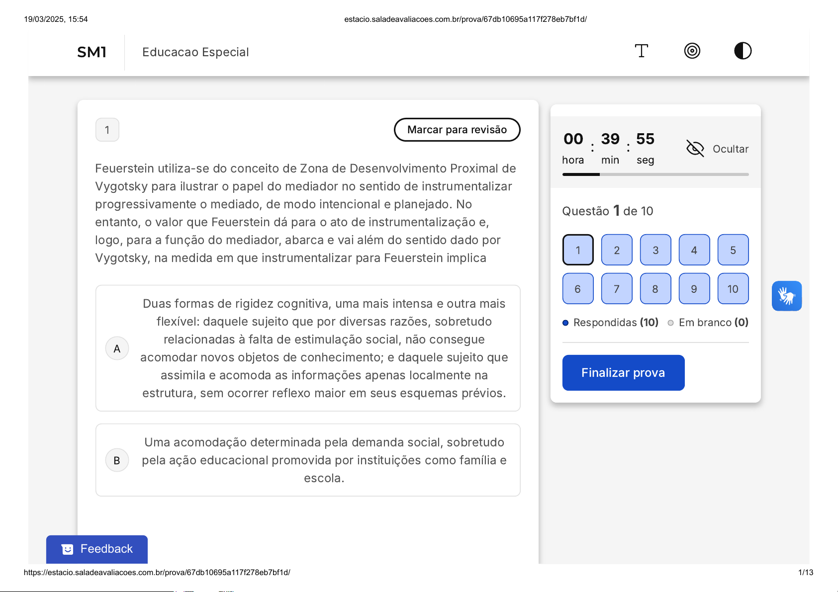 A B 1 Marcar para revisão Feuerstein utiliza-se do conceito de Zona de Desenvolvimento Proximal de Vygotsky para ilustrar o papel do mediador no sentido de instrumentalizar progressivamente o mediado, de modo intencional e planejado. No entanto, o valor que Feuerstein dá para o ato de instrumentalização e, logo, para a função do mediador, abarca e vai além do sentido dado por Vygotsky, na medida em que instrumentalizar para Feuerstein implica Duas formas de rigidez cognitiva, uma mais intensa e outra mais flexível: daquele sujeito que por diversas razões, sobretudo relacionadas à falta de estimulação social, não consegue acomodar novos objetos de conhecimento; e daquele sujeito que assimila e acomoda as informações apenas localmente na estrutura, sem ocorrer reflexo maior em seus esquemas prévios. Uma acomodação determinada pela demanda social, sobretudo pela ação educacional promovida por instituições como família e escola. 00 hora : 39 min : 55 seg Ocultar Questão 1 de 10 Respondidas (10) Em branco (0) Finalizar prova 1 2 3 4 5 6 7 8 9 10 SM1 Educacao Especial Feedback 19/03/2025, 15:54 estacio.saladeavaliacoes.com.br/prova/67db10695a117f278eb7bf1d/ https://estacio.saladeavaliacoes.com.br/prova/67db10695a117f278eb7bf1d/ 1/13 C D E Uma contínua reapresentação do objeto ao sujeito (repetição), de modo que ele cause cada vez menos desequilíbrio devido à familiaridade progressiva. Uma série de posturas e ações específicas do mediador com vistas sobretudo ao desenvolvimento da modificabilidade cognitiva estrutural, pela ativação de funções cognitivas e operações mentais. Solucionar os problemas de estimulação sensorial a fim de que o sujeito tenha facilitadores para usar o material produzido. 2 Marcar para revisão Atualmente, as pessoas com deficiência têm tido maior independência na execução de tarefas que anteriormente não conseguiam ou tinham grande dificuldade em realizar. É inegável que ainda há muito para avançar para que todos tenham acesso aos diversos recursos de inclusão, mas também é inegável que muito já se avançou nesse sentido. Acerca da tecnologia assistiva, avalie as afirmativas a seguir: I- Tem como objetivo proporcionar à pessoa com deficiência maior independência, qualidade de vida e inclusão social, por meio da ampliação da comunicação, da mobilidade, do controle de seu ambiente, das 19/03/2025, 15:54 estacio.saladeavaliacoes.com.br/prova/67db10695a117f278eb7bf1d/ https://estacio.saladeavaliacoes.com.br/prova/67db10695a117f278eb7bf1d/ 2/13 A B C D E habilidades de aprendizado, do trabalho e da integração com a família, amigos e sociedade. II- Envolve áreas como as adaptações de atividades de vida diária (higiene e alimentação), a acessibilidade e adaptação de ambientes (rampas e banheiros adaptados) e o transporte adaptado. III- Mede a inteligência das pessoas com base nos resultados de testes padronizados e quantitativos, comparando o desempenho cognitivo de um indivíduo com deficiência ao desempenho de pessoas do mesmo grupo etário. IV- Entendida como o arsenal de recursos e serviços que contribuem para proporcionar ou ampliar habilidades funcionais de pessoas com deficiência e consequentemente promover vida independente e inclusão. Está correto o que se afirma em I e II. I, II e III I, II e IV. I, III e IV. II, III e IV. 19/03/2025, 15:54 estacio.saladeavaliacoes.com.br/prova/67db10695a117f278eb7bf1d/ https://estacio.saladeavaliacoes.com.br/prova/67db10695a117f278eb7bf1d/ 3/13 A B C 3 Marcar para revisão Considerar as diferenças é o foco da visão inclusiva. Para incluir, é essencial levar em conta a realidade, as experiências e as diversidades que compõem a identidade dos sujeitos. Alguns conceitos são essenciais para compreendermos os princípios de uma educação inclusiva. Sobre o conceito de equidade, analise as afirmativas. I- Assegura que as pessoas com deficiência sejam acolhidas e envolvidas em situações de aprendizagem e desenvolvimento em classes especiais. II- Proporciona a todos experiências escolares significativas de modo a desenvolver o respeito, a tolerância e o senso de pertencimento social. III- Garante oportunidades educativas a todos, independentemente da diversidade. Está correto o que se afirma em I e III. II e III. I e II. 19/03/2025, 15:54 estacio.saladeavaliacoes.com.br/prova/67db10695a117f278eb7bf1d/ https://estacio.saladeavaliacoes.com.br/prova/67db10695a117f278eb7bf1d/ 4/13 D E II, apenas. III, apenas. 4 Marcar para revisão Ao se tratar de inclusão nas escolas, é necessário pensar em ambientes acessíveis e inclusivos. A acessibilidade deve ser garantida em salas de aula, laboratórios, auditórios, bibliotecas, sala dos professores, secretarias, coordenação, áreas esportivas, refeitórios, sanitários, enfim, todo o ambiente escolar. Além da dimensão prática de um cotidiano inclusivo é essencial que sejam defendidas algumas posturas. Analise as afirmativas apresentadas a seguir. I- Realização de ação pedagógica que segregue indivíduos e que os trate como homogêneos devem ser totalmente banidas do cotidiano escolar. II- Intensificação de um dos maiores princípios da educação inclusiva de reorganização da escola a partir do parâmetro da equidade. III- Promoção da igualdade do ponto de vista educacional, a fim de que o aluno com deficiência participe autonomamente do processo de sua aprendizagem. IV- Organização de classes especiais que promovam a interação entre os alunos com deficiência, evitando constrangimentos que sofrem pelos não possuem deficiência. 19/03/2025, 15:54 estacio.saladeavaliacoes.com.br/prova/67db10695a117f278eb7bf1d/ https://estacio.saladeavaliacoes.com.br/prova/67db10695a117f278eb7bf1d/ 5/13 A B C D E Está correto o que se afirma em II e IV. I e III. I, III e IV. I, II e IV. I, II e III. 5 Marcar para revisão "Quando o filho completou 4 anos, Elaine Kiss, como a maioria dos pais, come