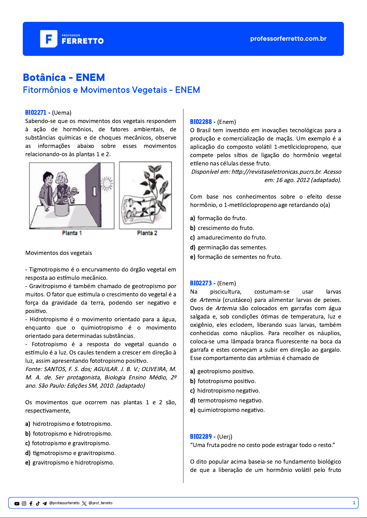Botânica - ENEM Fitormônios e Movimentos Vegetais - ENEM BIO2271 - (Uema) Sabendo-se que os movimentos dos vegetais respondem à ação de hormônios, de fatores ambientais, de substâncias químicas e de choques mecânicos, observe as informações abaixo sobre esses movimentos relacionando-os às plantas 1 e 2. Movimentos dos vegetais - Tigmotropismo é o encurvamento do órgão vegetal em resposta ao estímulo mecânico. - Gravitropismo é também chamado de geotropismo por muitos. O fator que estimula o crescimento do vegetal é a força da gravidade da terra, podendo ser negativo e positivo. - Hidrotropismo é o movimento orientado para a água, enquanto que o quimiotropismo é o movimento orientado para determinadas substâncias. - Fototropismo é a resposta do vegetal quando o estímulo é a luz. Os caules tendem a crescer em direção à luz, assim apresentando fototropismo positivo. Fonte: SANTOS, F. S. dos; AGUILAR. J. B. V.; OLIVEIRA, M. M. A. de. Ser protagonista, Biologia Ensino Médio, 2º ano. São Paulo: Edições SM, 2010. (adaptado) Os movimentos que ocorrem nas plantas 1 e 2 são, respectivamente, a) hidrotropismo e fototropismo. b) fototropismo e hidrotropismo. c) fototropismo e gravitropismo. d) tigmotropismo e gravitropismo. e) gravitropismo e hidrotropismo. BIO2288 - (Enem) O Brasil tem investido em inovações tecnológicas para a produção e comercialização de maçãs. Um exemplo é a aplicação do composto volátil 1-metilciclopropeno, que compete pelos sítios de ligação do hormônio vegetal etileno nas células desse fruto. Disponível em: http://revistaseletronicas.pucrs.br. Acesso em: 16 ago. 2012 (adaptado). Com base nos conhecimentos sobre o efeito desse hormônio, o 1-metilciclopropeno age retardando o(a) a) formação do fruto. b) crescimento do fruto. c) amadurecimento do fruto. d) germinação das sementes. e) formação de sementes no fruto. BIO2273 - (Enem) Na piscicultura, costumam-se usar larvas de Artemia (crustáceo) para alimentar larvas de peixes. Ovos de Artemia são colocados em garrafas com água salgada e, sob condições ótimas de temperatura, luz e oxigênio, eles eclodem, liberando suas larvas, também conhecidas como náuplios. Para recolher os náuplios, coloca-se uma lâmpada branca fluorescente na boca da garrafa e estes começam a subir em direção ao gargalo. Esse comportamento das artêmias é chamado de a) geotropismo positivo. b) fototropismo positivo. c) hidrotropismo negativo. d) termotropismo negativo. e) quimiotropismo negativo. BIO2289 - (Uerj) “Uma fruta podre no cesto pode estragar todo o resto.” O dito popular acima baseia-se no fundamento biológico de que a liberação de um hormônio volátil pelo fruto 1@professorferretto @prof_ferretto mais maduro estimula a maturação dos demais frutos. Esse hormônio é denominado de: a) etileno. b) auxina. c) citocinina. d) giberelina. BIO2294 - (Ufpr) Produtores de frutas utilizam permanganato de potássio para desencadear a reação representada pela seguinte equação: Permanganato de potássio + Etileno → Óxido de manganês + Gás carbônico + Hidróxido de potássio O objetivo de colocar as frutas em contato com o permanganato de potássio é: a) acelerar seu crescimento. b) retardar seu amadurecimento. c) alterar seu sabor. d) modificar sua cor. e) reduzir a quantidade de sementes. BIO2298 - (Uel) Nos vegetais superiores, a regulação do metabolismo, o crescimento e a morfogênese muitas vezes dependem de sinais químicos de uma parte da planta para outra, conhecidos como hormônios, os quais interagem com proteínas específicas, denominadas receptoras. TAIZ, L.; ZEIGER, E. Fisiologia vegetal. 3. ed. Porto Alegre: Artmed, 2004. Com base no texto e nos conhecimentos sobre hormônios vegetais, relacione as colunas. (1) Auxina (2) Giberelina (3) Citocinina (4) Etileno (a) afeta o crescimento e a diferenciação das raízes; estimula a divisão e o crescimento celular; estimula a germinação e a floração; retarda o envelhecimento. (b) promove o amadurecimento dos frutos; antagoniza ou reduz os efeitos da auxina; promove ou inibe, dependendo da espécie, o crescimento e o desenvolvimento de raízes, folhas e flores. (c) estimula o alongamento de caule e raiz; atua no fototropismo, no geotropismo, na dominância apical e no desenvolvimento dos frutos. (d) promove a germinação de sementes e brotos; estimula a elongação do caule, o crescimento das folhas, a floração e o desenvolvimento de frutos. Assinale a alternativa que contém todas as relações corretas. a) 1-a, 2-b, 3-c, 4-d. b) 1-b, 2-a, 3-d, 4-c. c) 1-c, 2-d, 3-a, 4-b. d) 1-d, 2-c, 3-b, 4-a. e) 1-c, 2-a, 3-d, 4-b. BIO2279 - (Unp) A figura abaixo ilustra um fenômeno que ocorre com vegetais. A esse respeito, analise as seguintes afirmações: I. O fenômeno mostrado é decorrente da atividade das auxinas. II. A esse fenômeno dá-se o nome genérico de fototropismo. III. A planta cresce voltando-se na direção da luz porque esta estimula a produção das auxinas. Assinale: a) As afirmações I e II estão corretas. b) Somente a afirmação III está correta. c) As afirmações I e III estão corretas. d) As afirmações II e III estão corretas. BIO2283 - (Enem) A produção de hormônios vegetais (como a auxina, ligada ao crescimento vegetal) e sua distribuição pelo organismo são fortemente influenciadas por fatores ambientais. Diversos são os estudos que buscam compreender melhor essas influências. O experimento seguinte integra um desses estudos. 2@professorferretto @prof_ferretto O fato de a planta do experimento crescer na direção horizontal, e não na vertical, pode ser explicado pelo argumento de que o giro faz com que a auxina se a) distribua uniformemente nas faces do caule, estimulando o crescimento de todas elas de forma igual. b) acumule na face inferior do caule e, por isso, determine um crescimento maior dessa parte. c) concentre na extremidade do caule, e, por isso, iniba 