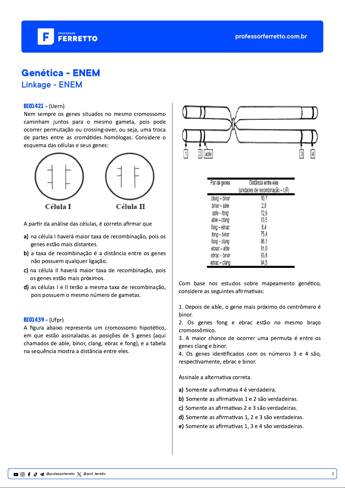 Genética - ENEM Linkage - ENEM BIO1421 - (Uern) Nem sempre os genes situados no mesmo cromossomo caminham juntos para o mesmo gameta, pois pode ocorrer permutação ou crossing-over, ou seja, uma troca de partes entre as cromátides homólogas. Considere o esquema das células e seus genes: A partir da análise das células, é correto afirmar que a) na célula I haverá maior taxa de recombinação, pois os genes estão mais distantes. b) a taxa de recombinação é a distância entre os genes não possuem qualquer ligação. c) na célula II haverá maior taxa de recombinação, pois os genes estão mais próximos. d) as células I e II terão a mesma taxa de recombinação, pois possuem o mesmo número de gametas. BIO1439 - (Ufpr) A figura abaixo representa um cromossomo hipotético, em que estão assinaladas as posições de 5 genes (aqui chamados de able, binor, clang, ebrac e fong), e a tabela na sequência mostra a distância entre eles. Com base nos estudos sobre mapeamento genético, considere as seguintes afirmativas: 1. Depois de able, o gene mais próximo do centrômero é binor. 2. Os genes fong e ebrac estão no mesmo braço cromossômico. 3. A maior chance de ocorrer uma permuta é entre os genes clang e binor. 4. Os genes identificados com os números 3 e 4 são, respectivamente, ebrac e binor. Assinale a alternativa correta. a) Somente a afirmativa 4 é verdadeira. b) Somente as afirmativas 1 e 2 são verdadeiras. c) Somente as afirmativas 2 e 3 são verdadeiras. d) Somente as afirmativas 1, 2 e 3 são verdadeiras. e) Somente as afirmativas 1, 3 e 4 são verdadeiras. 1@professorferretto @prof_ferretto BIO1417 - (Uece) Quando dois pares de genes estão no mesmo par de cromossomos homólogos, dizemos que ocorre: a) ligação gênica, podendo os genes ligados ir para gametas diferentes em consequência de segregação independente. b) segregação independente dos genes, os quais obrigatoriamente irão para gametas diferentes. c) segregação independente dos genes, podendo se juntar no mesmo gameta por permutação. d) ligação gênica, podendo os genes ligados ir para gametas diferentes por meio do crossing-over. BIO1436 - (Facisa) Entre dois genes A e B distanciados de 8μ ocorrem 2,4% de permutação. Um terceiro gene C, situa-se entre A e B, permutando com A uma frequência de 1,8%. Podemos afirmar que a) a distância entre os genes e a frequência de permutação entre C e B é 2μ – 3,2%. b) a distância entre os genes e a frequência de permutação entre C e B é 2,4μ – 0,8%. c) a distância entre os genes e a frequência de permutação entre C e B é 4μ – 0,4%. d) a distância entre os genes e a frequência de permutação entre C e B é 2μ – 0,6%. e) nesse caso, não se pode precisar a distância. BIO1423 - (Unifor) A figura abaixo representa uma célula com um par de cromossomos homólogos. A partir dessa célula, na ausência de permutação gênica, poderão ser formados gametas a) Aa e Bb, somente. b) Ab e aB, somente. c) AB e ab, somente. d) AB, Ab, aB e ab. e) AB, Aa, Bb e ab. BIO1426 - (Unicamp) Considere um indivíduo heterozigoto para três genes. Os alelos dominantes A e B estão no mesmo cromossomo. O gene C tem segregação independente dos outros dois genes. Se não houver crossing-over durante a meiose, a frequência esperada de gametas com genótipo abc produzidos por esse indivíduo é de a) 1/4. b) 1/2. c) 1/6. d) 1/8. BIO1424 - (Pucsp) A célula a seguir pertence a uma espécie que apresenta quatro cromossomos (2n = 4): 1. é cromossomo homólogo de 1'. 2. é cromossomo homólogo de 2'. Um indivíduo heterozigoto para três pares de genes (AaBbCc) tem esses genes localizados nos cromossomos, conforme é mostrado na figura. Se uma célula desse indivíduo entrar em meiose e não ocorrer crossing-over, podem ser esperadas, ao final da divisão, células com constituição a) AbC; aBc ou Abc; aBC. b) ABC; abc ou ABc; abC. c) apenas ABC e abc. d) apenas Abc e abC. e) apenas AaBbCc. BIO1437 - (Ufv) 2@professorferretto @prof_ferretto Basicamente, quanto mais distante um gene está do outro no mesmo cromossomo, maior é a probabilidade de ocorrência de permutação (crossing-over) entre eles. Se os genes Z, X e Y apresentam as frequências de permutação XZ (0,34), YZ (0,13) e XY (0,21), a ordem no mapa desses genes no cromossomo é: a) XZY. b) ZXY. c) ZYX. d) YZX. e) YXZ. BIO1438 - (Ufpi) Um aluno do ensino médio recebeu de seu professor de biologia a seguinte tarefa: descobrir a ordem correta de quatro genes distribuídos em um mesmo cromossomo e que apresentaram, nos descendentes, as seguintes frequências de crossing-over: I – 40% entre a e d; II – 20% entre a e b; III – 30% entre c e d e IV – 10% entre c e b. A ordem correta dos quatro genes no cromossomo está na opção: a) a-c-b-d. b) a-b-c-d. c) b-a-d-c. d) c-b-d-a. e) a-d-c-b. BIO1418 - (Enem) Com base nos experimentos de plantas de Mendel, foram estabelecidos três princípios básicos, que são conhecidos como leis da uniformidade, segregação e distribuição independente. A lei da distribuição independente refere- se ao fato de que os membros de pares diferentes de genes segregam-se independentemente, uns dos outros, para a prole. TURNPENNY, P. D. Genética médica. Rio de Janeiro: Elsevier, 2009 (adaptado). Hoje, sabe-se que isso nem sempre é verdade. Por quê? a) A distribuição depende do caráter de dominância ou recessividade do gene. b) Os organismos nem sempre herdam cada um dos genes de cada um dos genitores. c) As alterações cromossômicas podem levar a falhas na segregação durante a meiose. d) Os genes localizados fisicamente próximos no mesmo cromossomo tendem a ser herdados juntos. e) O cromossomo que contém dois determinados genes pode não sofrer a disjunção na primeira fase da meiose. BIO1430 - (Ufpr) Admita que dois genes, A e B, estão localizados num mesmo cromossomo. Um macho AB/ab foi cruzado com uma fêmea ab/ab. Sabendo que entr