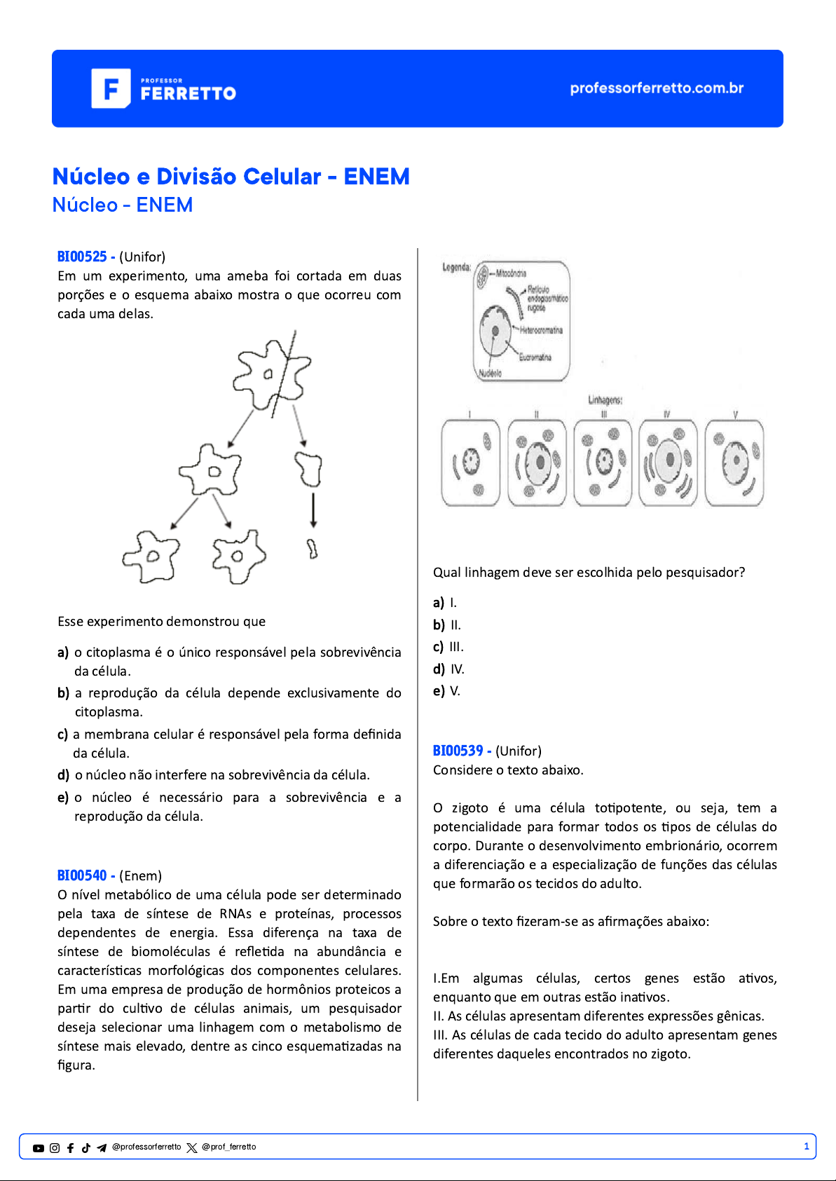 Núcleo e Divisão Celular - ENEM Núcleo - ENEM BIO0525 - (Unifor) Em um experimento, uma ameba foi cortada em duas porções e o esquema abaixo mostra o que ocorreu com cada uma delas. Esse experimento demonstrou que a) o citoplasma é o único responsável pela sobrevivência da célula. b) a reprodução da célula depende exclusivamente do citoplasma. c) a membrana celular é responsável pela forma definida da célula. d) o núcleo não interfere na sobrevivência da célula. e) o núcleo é necessário para a sobrevivência e a reprodução da célula. BIO0540 - (Enem) O nível metabólico de uma célula pode ser determinado pela taxa de síntese de RNAs e proteínas, processos dependentes de energia. Essa diferença na taxa de síntese de biomoléculas é refletida na abundância e características morfológicas dos componentes celulares. Em uma empresa de produção de hormônios proteicos a partir do cultivo de células animais, um pesquisador deseja selecionar uma linhagem com o metabolismo de síntese mais elevado, dentre as cinco esquematizadas na figura. Qual linhagem deve ser escolhida pelo pesquisador? a) I. b) II. c) III. d) IV. e) V. BIO0539 - (Unifor) Considere o texto abaixo. O zigoto é uma célula totipotente, ou seja, tem a potencialidade para formar todos os tipos de células do corpo. Durante o desenvolvimento embrionário, ocorrem a diferenciação e a especialização de funções das células que formarão os tecidos do adulto. Sobre o texto fizeram-se as afirmações abaixo: I.Em algumas células, certos genes estão ativos, enquanto que em outras estão inativos. II. As células apresentam diferentes expressões gênicas. III. As células de cada tecido do adulto apresentam genes diferentes daqueles encontrados no zigoto. 1@professorferretto @prof_ferretto Somente é correto o que se afirmou em a) I. b) II. c) I e II. d) I e III. e) II e III. BIO0530 - (Ufpb) Considere as frases: A cromatina e os cromossomos são diferentes estados morfológicos do _____ associado a _____. Esses estados morfológicos são encontrados em diferentes fases do ciclo celular, denominadas _____ e _____, respectivamente. As lacunas são preenchidas corretamente pela sequência: a) DNA / proteínas / interfase / mitose. b) DNA / RNA / interfase / meiose. c) RNA / proteínas / fase S / mitose. d) RNA / DNA / interfase / metáfase. e) DNA / proteínas / anáfase / meiose. BIO0531 - (Unp) Na aula de Biologia, o professor fez a seguinte afirmação: “A produção de ribossomos depende, indiretamente, da atividade dos cromossomos”. Em seguida pediu a seus alunos que analisassem a afirmação e a explicassem. Foram obtidas cinco explicações diferentes, que se encontram abaixo citadas. Assinale a única explicação correta: a) Os cromossomos são constituídos essencialmente por RNA ribossômico e proteínas, material utilizado na produção de ribossomos. b) Os cromossomos são constituídos essencialmente por RNA mensageiro e proteínas, material utilizado na produção de ribossomos. c) Os cromossomos contêm DNA; este controla a síntese de ribonucleoproteínas que formarão o nucléolo e que, posteriormente, farão parte dos ribossomos. d) Os cromossomos são constituídos essencialmente por RNA transportador e proteínas, material utilizado na produção de ribossomos. BIO0542 - (Unifor) Em 1864, perto do fim da Guerra Civil dos Estados Unidos, as condições nos campos de prisioneiros dos Estados Confederados estavam péssimas. A superlotação era extrema e as taxas de morte dispararam. Para aqueles que sobreviveram, as experiências angustiantes marcaram muitos por toda a vida. Mas o impacto destas situações não acabou com aqueles que as vivenciaram. Também tiveram efeitos sobre os filhos e netos dos prisioneiros que, embora não tivessem sofrido as dificuldades dos campos de prisioneiros de guerra, apresentaram taxas mais altas de mortalidade do que a população em geral. Parecia que os prisioneiros haviam transmitido geneticamente algum elemento de seu trauma para seus filhos. Os pesquisadores estão investigando como os eventos na vida de uma pessoa podem mudar a forma como seu DNA se expressa e como essa mudança pode ser passada para a geração seguinte. Fonte: https://g1.globo.com/ciencia-e- saude/noticia/2019/05/09/e-possivel-herdar-traumas- denossos-pais.ghtmlAcesso em 14 mai. 2019 (com adaptações). Sabe-se que a expressão dos genes pode ser modificada sem que haja alterações na sequência de bases do DNA, por meio de marcas químicas que podem ser adicionadas ou removidas do nosso código genético em resposta a mudanças no ambiente em que estamos vivendo. Isso refere-se a a) translocação. b) mutação. c) epigenética. d) transgenia. e) polimorfismo. BIO0533 - (Ufpi) A grande parte do DNA em células eucarióticas está compactada em 1, formados imediatamente após a 2, que é composta por um núcleo com oito proteínas 3, com DNA enrolado em torno deste núcleo, formando umfio cromossômico helicoidal chamado 4. Marque a alternativa que completa corretamente o trecho anterior. 2@professorferretto @prof_ferretto a) 1-microssomos; 2-transcrição; 3-não histônicas; 4- nucleoide. b) 1-microssomos; 2-replicação; 3-histônicas; 4-fio de cromossomo extranuclear. c) 1-nucleossomos; 2-replicação; 3-histônicas; 4- solenoide. d) 1-microssomos; 2-tradução; 3-endonucleases; 4- mesossomo. e) 1-nucleossomos; 2-transcrição; 3-não histônicas; 4-fio de cromossomo plasmidial. BIO0546 - (Fip) Os cromossomos sexuais têm formas diferentes no homem (cromossomos sexuais não homólogos). Na mulher, os dois cromossomos têm formatos iguais (cromossomos sexuais homólogos). Define-se cromossomos homólogos: a) Cromossomos que, aos pares, nas células diploides, apresentam número e sequência de diferentes genes para determinadas características hereditárias. b) Cromossomos que, aos pares, nas células haploides, apresentam o mesmo número e sequência de ge