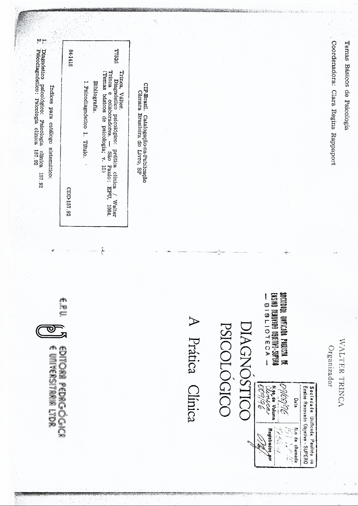 Temas Básicos de Psicologia Coordenadora: Clara Regina Rappaport WALTER TRINCA Organizador Unificada Paulista Ensino Renovado Objetivo - SUPERO Data N.o de chamada UNIFICADA DE 09/08/96 ENSINO RENOVADO OBJETIVO-SUPERO de Volume BIBLIOTECA 009196 DIAGNÓSTICO PSICOLÓGICO A Prática Clínica Câmara Brasileira do Livro, SP Trinca, T752d Diagnóstico psicológico: prática clínica (Temas Trinca e - São Paulo: EPU, / Walter 1984. básicos de psicologia; 10) 1. Psicodiagnóstico I. 84-1416 CDD-157.92 para catálogo E.P.U. Psicologia clínica 157.92 clínica Diagnóstico psicológico: Psicologia 157.92 EDITORA P EBellak, L. e Bellak, S. S. Manuel du Test D' Apperception pour Enfants (CAT) et du Supplément (CAT-S). Paris, Centre Psych. Appl., 1964. 6 Caligor, L. The determination of the individual's inconscious concept of his masculinity-femininity identification. J. Proj. Tech., 15: 494-509, 1951. Freud, S. Obras Completas. Madrid, Editorial Biblioteca Nueva, 1948. Gesell, A. La Educación del Niño em la Cultura Moderna. Buenos Aires, Ed. Nova, 1948. Entrevistas clínicas Hammer, F. Tests Proyectivos Gráficos. Buenos Aires, Paidós, 1969. Klein, M. Fontes do Inconsciente. Rio de Janeiro, Zahar, 1964. Klein, M. Psicanálise da Criança. São Paulo, Mestre Jou, 1969. Mary Dolores Ewerton Santiago Knobel, M. Psiquiatria Infantil Psicodinâmica. Buenos Aires, Paidós, 1977. Laplanche, J. e Pontalis, J. Vocabulaire de la Psychanalyse. Paris, Presses Universitaires de France, 1971. Lindzey, G. El test de aperceptión temática. In: Ferber, R. J. e Vales, H. Motivaciones del Consumo en el Mercado. Barcelona, Ed. Hispano-Eu- ropea, 1960. Milner, M. Encabalgamiento de Circulos. Buenos Aires, Editorial Trieb, 1978. 6.1. Introdução Mestriner, S. E. o Procedimento de Desenhos e Estórias em Pacientes Esqui- zofrênicos Hospitalizados. Dissertação de mestrado no Instituto de Psico- logia da Universidade de São Paulo. São Paulo, mimeografado, 1982. O termo entrevista significa encontro e conferência de duas ou Murray, H. A. e col. Test de apercepción temática (TAT). Buenos Aires, mais pessoas em um local predeterminado para tratar de um assunto. Paidós, 1964. No caso da entrevista psicológica, o assunto se relaciona a um Soifer, R. Estudio de la Entrevista de Juego Diagnóstico con Niños. São pedido de ajuda feito a um profissional (psicólogo), sendo que a Paulo, Sociedade Brasileira de Psicanálise de São Paulo, 1974. pessoa que o faz, via de regra, encontra-se num momento em que Trinca, W. Investigação Clínica da Personalidade. Desenho Livre Como seu bem-estar emocional está ameaçado. Outras vezes, o pedido é Estimulo de Apercepção Temática. Belo Horizonte, Interlivros, 1976. feito por insistência de terceiros (amigos, escolas, médicos Vainer, E. J. Hacia la Salud Mental del Niño Una Técnica para la Tanto no primeiro como no segundo caso, o fato de ser um en- Asistência en Consultas. Revista Argentina de Psicologia, VI: 19-20. contro para a formulação de um pedido de ajuda já sugere a dife- Winnicott, D. W. Therapeutic Consultations in Child Psychiatry. London, Ho- rença entre aquele que procura e aquele que é procurado (entre gard Press, 1971. aquele que tem dificuldades que não consegue resolver por si só e Winnicott, D. W. Brincar e a Realidade. Rio de Janeiro, Imago, 1975. outro que se dispõe a ajudá-lo), o que facilita o desenvolvimento de uma relação assimétrica. É importante considerar este aspecto a fim de não perder de vista o longo caminho que muitas vezes per- correu o indivíduo até poder chegar ao consultório do profissional. A entrevista psicológica se constitui, portanto, na relação esta- belecida entre duas ou mais pessoas dentro de um marco referencial estabelecido, sem perder de vista que ela se caracteriza por ser ba- sicamente uma relação humana. Neste sentido, o psicólogo deve ser considerado também como um dos elementos que influem nos fenô- menos que poderão emergir nesta situação; no entanto, sua inter- venção deve ser de tal forma que não os determine. Com isto que- 66 67remos dizer que o psicólogo deve permitir que o campo da entre- gumas notas para fazer uma reconstrução e que, no final, comuni- vista se configure essencialmente em função da estrutura psicológica car-lhe-á as conclusões da(s) entrevista(s). Segundo Rolla, com este particular do entrevistado. Somente assim poderá obter conhecimento procedimento se elimina uma fonte capaz de determinar ansiedade de alguns aspectos da personalidade do último, como também dos no paciente, e que às vezes encobre a que o sujeito traz em relação motivos que o levaram a solicitar a entrevista. A forma e o con- à sua problemática. teúdo do seu relato possibilitam ao psicólogo entrar em contato com as angústias, ansiedades e defesas que estão sendo expressadas nesta comunicação. Isto supõe que a técnica utilizada na entrevista ini- 6.3. A relação psicólogo-paciente na entrevista cial, principalmente, seja da entrevista aberta e que todos os fenô- psicológica menos observados na mesma (transferência, contratransferência, tipo de comunicação verbal e não-verbal etc.) sejam levados em conside- ração a fim de se obter uma compreensão da pessoa que solicita A relação psicólogo-paciente implica reações e impactos emo- ajuda. cionais como os existentes em todo o contato humano. São justamente eles que fornecem ao psicólogo um conhecimento intuitivo do pa- ciente e lhe permitem aprofundar a investigação das entrevistas. 6.2. A importância de um marco referencial na Observa-se, portanto, que as próprias emoções do psicólogo se cons- estruturação da entrevista tituem em um dos seus instrumentos de trabalho. Isto posto, depa- ramo-nos com o fato de que esse profissional precisa dispor, além Na entrevista inicial é que tem lugar estabelecimento de um de um marco referencial e de recursos intelectuais, de suas pró- marco referencia