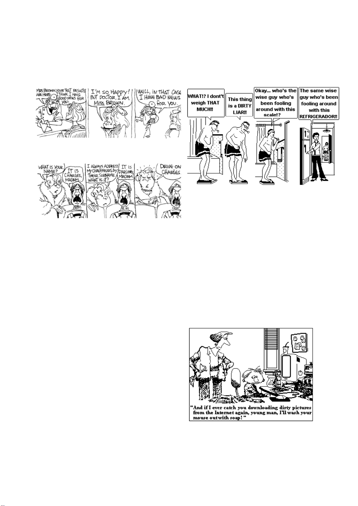 Which alternative has the correct forms of the sentences below in the Reported Speech? I "Be brave. Don t cry. " II "I think I have good news for you. " III "What is your name? " a) I He told the man to be brave and not cry; II He said to the woman he thought he had good news for her; III She asked what his name was. b) I He told the man be brave and not to cry; II He said to the woman he thought he had good news for her; III She asked what his name was. c) I He told the man to be brave and not to cry; I I He said to the woman that he thought he had good news for her; III She asked what your name was. d) I He told to the man to be brave and not to cry; II He said to the woman that he thought he had good news for her; III She asked what is your name was. e) I He told the man to be brave and not to cry; I I He said to the woman that he thought he had good news for her; III She asked what his name was. 218 (Mackenzie 97) Change the Reported Speech: Warren said to me, "I can't find my glasses in this room." a) Warren told me that he couldn't found his glasses in that room. b) Warren told me he couldn't find her glasses in these room. c) Warren told me that he couldn't find his glasses in that room. d) Warren told me that he can't find his glasses in those room. e) Warren said to me that he could not found his glasses in this room. 219 (Mackenzie 97) Change to the Reported Speech: Helen said to Paul, "Is this a free country?" a) Helen told Paul if this was a free country? b) Helen asked Paul if that was a free country. c) Helen asked Paul whether that is a free country. d) Helen told Paul this is a free country. e) Helen told Paul if that is a free country. 220 (Pucpr 96) Choose the correct indirect form for: Oliver said to her: "What will you do tomorrow?" a) He asked her what she would do the following day. b) He told her what she would do the following day. c) She wondered what he will do the next day. d) He wanted to know what he would do the following day. e) She asked what she would do the next day. 221 (Ufmg 95) A wife is telling us what happened this morning. Complete the following text according to the comic strip below: This morning, my husband stepped on our scale and shouted that (1) that much. He pointed at the machine and said it (2) a dirty liar. a) he didn’t weigh was b) he don’t weigh was c) he doesn’t weigh were d) he did weigh were e) he hadn’t weigh was CONDITIONALS 222 (Mackenzie 96) Indicate the alternative that best completes the sentence below: If you had taken my advice, you ... . a) would learned the lesson b) would have learnt the lesson c) should learned the lesson d) would learn the lesson e) should understand the lesson 223 (Fuvest 97) Considere a imagem a seguir: Qual seria o correspondente, no passado, de if I ever catch ... I'll wash ... ? a) If I ever were to catch I'll wash. b) If I ever caught I'd wash. c) If I ever would catch I washed.