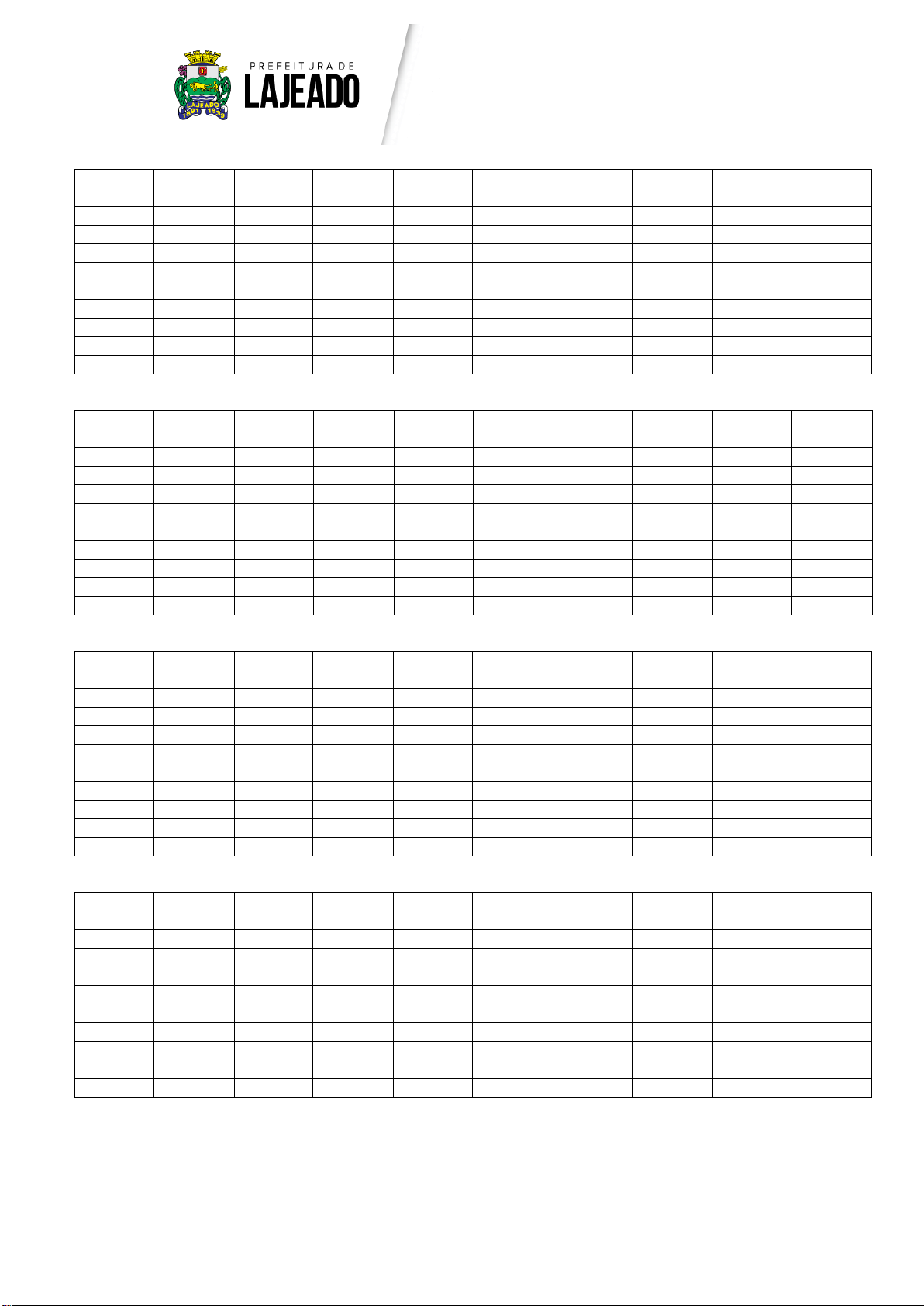 Secretaria Municipal de Administração CONCURSO PÚBLICO Nº 01/2018 Rua Cel. Júlio May, 242, Centro de Lajeado Telefone: (51) 3982-1000 – Site: www.lajeado.rs.gov.br Página 3 de 9 Execução: Legalle Concursos e Soluções Integradas Ltda. 1.1.3.4. Auxiliar de Biblioteca Questão Gabarito Questão Gabarito Questão Gabarito Questão Gabarito Questão Gabarito 1 A 11 C 21 B 31 C 41 E 2 C 12 D 22 C 32 D 42 C 3 A 13 C 23 E 33 C 43 D 4 C 14 A 24 B 34 D 44 E 5 D 15 X 25 D 35 B 45 D 6 D 16 B 26 B 36 D 46 C 7 A 17 B 27 E 37 B 47 E 8 C 18 C 28 D 38 D 48 E 9 D 19 C 29 D 39 A 49 E 10 A 20 C 30 E 40 D 50 B 1.1.3.5. Auxiliar de Consultório Dentário Questão Gabarito Questão Gabarito Questão Gabarito Questão Gabarito Questão Gabarito 1 B 11 A 21 D 31 B 41 A 2 C 12 A 22 E 32 D 42 D 3 A 13 E 23 C 33 E 43 C 4 B 14 E 24 A 34 D 44 C 5 A 15 E 25 E 35 B 45 B 6 C 16 B 26 A 36 C 46 B 7 X 17 E 27 D 37 C 47 E 8 B 18 D 28 B 38 B 48 E 9 E 19 B 29 A 39 D 49 E 10 B 20 A 30 B 40 D 50 E 1.1.3.6. Fiscal de Planejamento Questão Gabarito Questão Gabarito Questão Gabarito Questão Gabarito Questão Gabarito 1 A 11 C 21 B 31 C 41 C 2 C 12 D 22 C 32 D 42 D 3 A 13 C 23 E 33 D 43 E 4 C 14 A 24 B 34 E 44 C 5 D 15 X 25 D 35 C 45 D 6 D 16 B 26 B 36 D 46 D 7 A 17 B 27 E 37 A 47 E 8 C 18 C 28 D 38 D 48 B 9 D 19 C 29 D 39 C 49 A 10 A 20 C 30 E 40 C 50 B 1.1.3.7. Monitor de Creche Questão Gabarito Questão Gabarito Questão Gabarito Questão Gabarito Questão Gabarito 1 B 11 A 21 D 31 A 41 E 2 C 12 A 22 E 32 A 42 E 3 A 13 E 23 C 33 C 43 E 4 B 14 E 24 A 34 E 44 C 5 A 15 E 25 E 35 D 45 D 6 C 16 B 26 A 36 B 46 C 7 X 17 E 27 D 37 E 47 B 8 B 18 D 28 B 38 E 48 E 9 E 19 B 29 A 39 A 49 D 10 B 20 A 30 B 40 B 50 A