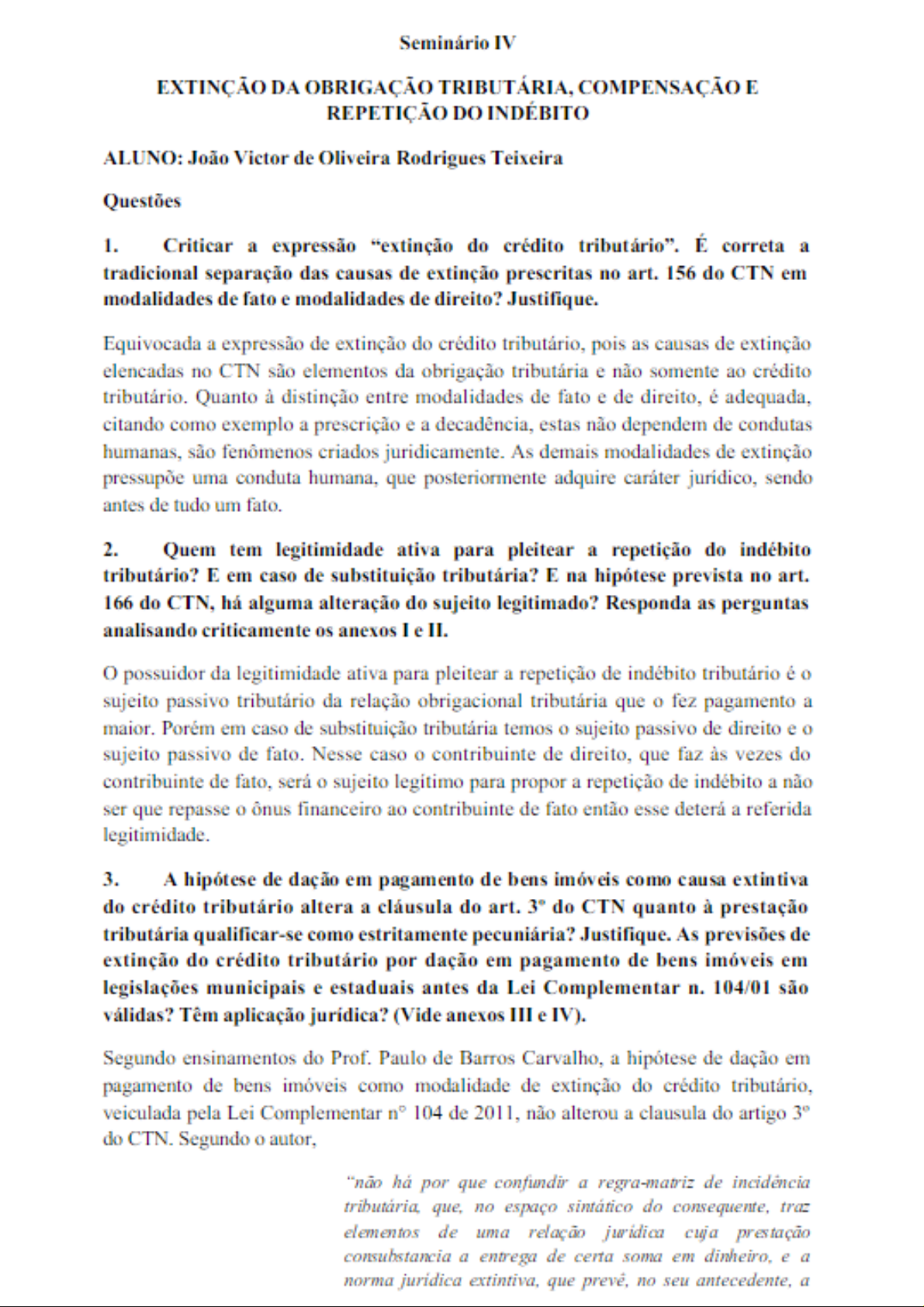 Seminário IV EXTINÇÃO DA OBRIGAÇÃO TRIBUTÁRIA, COMPENSAÇÃO E REPETIÇÃO DO INDÉBITO ALUNO: João Victor de Oliveira Rodrigues Teixeira Questões 1. Criticar a expressão "extinção do crédito É correta a tradicional separação das causas de extinção prescritas no art. 156 do CTN em modalidades de fato e modalidades de direito? Justifique. Equivocada a expressão de extinção do crédito tributário, pois as causas de extinção elencadas no CTN são elementos da obrigação tributária e não somente ao crédito tributário. Quanto à distinção entre modalidades de fato e de direito, é adequada, citando como exemplo a prescrição e a decadência, estas não dependem de condutas humanas, são fenômenos criados juridicamente. As demais modalidades de extinção pressupõe uma conduta humana, que posteriormente adquire caráter jurídico, sendo antes de tudo um fato. 2. Quem tem legitimidade ativa para pleitear a repetição do indébito tributário? E em caso de substituição tributária? E na hipótese prevista no art. 166 do CTN, há alguma alteração do sujeito legitimado? Responda as perguntas analisando criticamente os anexos I e II. O possuidor da legitimidade ativa para pleitear a repetição de indébito tributário é o sujeito passivo tributário da relação obrigacional tributária que o fez pagamento a maior. Porém em caso de substituição tributária temos o sujeito passivo de direito e o sujeito passivo de fato. Nesse caso o contribuinte de direito, que faz às vezes do contribuinte de fato, será o sujeito legítimo para propor a repetição de indébito a não ser que repasse o ônus financeiro ao contribuinte de fato então esse deterá a referida legitimidade. 3. A hipótese de dação em pagamento de bens imóveis como causa extintiva do crédito tributário altera a cláusula do art. 3° do CTN quanto à prestação tributária qualificar-se como estritamente pecuniária? Justifique. As previsões de extinção do crédito tributário por dação em pagamento de bens imóveis em legislações municipais e estaduais antes da Lei Complementar n. 104/01 são válidas? Têm aplicação jurídica? (Vide anexos III e IV). Segundo ensinamentos do Prof. Paulo de Barros Carvalho, a de dação em pagamento de bens imóveis como modalidade de extinção do crédito tributário, veiculada pela Lei Complementar n° 104 de 2011, não alterou a clausula do artigo 3° do CTN. Segundo o autor, "não por que confundir a regra-matriz de que, no espaço sintático do consequente, traz elementos de uma relação cuja prestação consubstancia a entrega de certa soma em dinheiro, e a norma juridica extintiva, que prevé, no seu antecedente, ade realização da dação em imóveis cumprida as condições previstas em lei de cada esfera de sua e. no consequente, enunciados que serão utilizados no cálculo das relações fazer desaparecer crédito Portanto, não há que se falar em modificação da previsão legal do artigo 3° do enquanto tratar de normas distintas, que coexistente em perfeita harmonia. Com relação previsões de extinção do crédito tributário por dação em pagamento de bens imóveis em legislações municipais e estaduais antes da Lei Complementar 104/01, pontua-se que estas Leis Municipais e Estaduais não podem ser consideradas válidas, enquanto não existir a época previsão legal para Compete exclusivamente a LC estabelecer normas gerais em matéria de legislação tributária, art. 146, inciso III da CF/88, portanto, não poderia a legislação Municipal e Estadual prever essa nova modalidade de extinção do crédito tributário, sem que o CTN fizesse tal previsão, sob pena de ofensa ao principio da legalidade e do pacto federativo. 4. Que é compensação tributária? Quando nasce o direito subjetivo à compensação tributária? Determinada lei editada em momento posterior ao do nascimento do "direito subjetivo" à compensação estabelece limites ao seu exercício, como por exemplo, limitando o crédito a compensar a determinado valor por mês, impedindo a incidência de juros de mora ao crédito. Essas novas regras que limitam a compensação se comparadas à legislação até então vigente impactam o exercício do direito de compensar consagrado anteriormente à vigência dessa lei? Há direito adquirido à compensação? (Vide anexos V). A compensação tributária uma das modalidades de extinção do crédito tributário, com previsão legal no Código Tributário mais especificamente no artigo 156, inciso II. Nessa o sujeito passivo (contribuinte), que possua créditos perante o Estado Administração, terá a faculdade de requer a compensação destes créditos com débitos que ele possua, conforme especificidades que deverão ser trazidas em lei. Segundo Paulo de Barros Carvalho, "na compensação tributária são dissolvidas, essas duas relações: (i) de crédito tributário e (ii) de débito do fisco. Direitos e deveres funcionam como vetores de mesma intensidade e mas de sentidos opostos, que se anulam." Para que o direito subjetivo à compensação tributária são necessários alguns acontecimentos anteriores. Primeiramente, segundo Paulo de Barro Carvalho, é necessário "a constituição do crédito tributário e do débito do Fisco, mediante a linguagem prevista pelo para que a compensação se verifique. Esses elementos linguisticos,todavia, ainda não são, por si suficientes para que se tenha por concretizada Necessário se faz o efetivo "encontro de contas". formalizado por linguagem juridicamente reconhecida." Portanto, deverão existir duas normas individuais e concretas, uma com relação ao débito do contribuinte e outra formalizando o débito do fisco. Combinando estas duas normas, surge uma terceira, que é a norma individual e concreta da compensação Somente com a expedição dessa última norma é que a compensação Com relação à vigência da das de compensação, a Primeira Seção do consolido