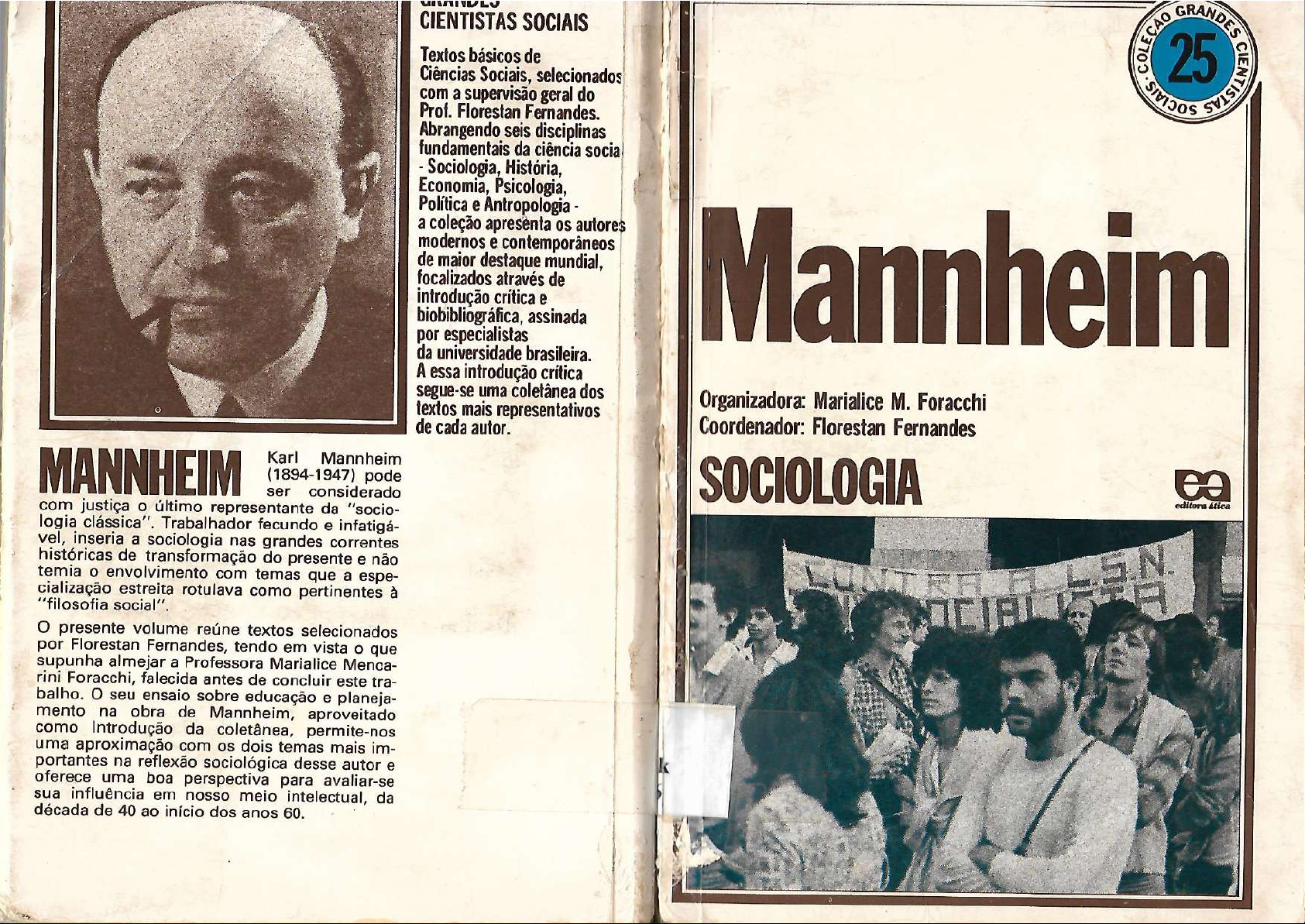 CIENTISTAS SOCIAIS GRANDES Textos básicos de Ciências Sociais, selecionados com a supervisão geral do 25 Prof. Florestan Fernandes. Abrangendo seis disciplinas fundamentais da ciência Sociologia, História, Psicologia, Política e Antropologia a coleção apresenta os autores modernos e contemporâneos de maior destaque mundial, focalizados através de introdução crítica e assinada Mannheim por especialistas da universidade brasileira. A essa introdução crítica segue-se uma coletânea dos textos mais representativos Organizadora: Marialice M. Foracchi de cada autor. Coordenador: Florestan Fernandes MANNHEIM Karl Mannheim (1894-1947) pode ser considerado SOCIOLOGIA editora com justiça o último representante da "socio- ogia clássica". Trabalhador fecundo e infatigá- el, inseria a sociologia nas grandes correntes de transformação do presente e não emia o envolvimento com temas que a espe- cialização estreita rotulava como pertinentes à presente volume reúne textos selecionados or Florestan Fernandes, tendo em vista o que supunha almejar a Professora Marialice Menca- ini Foracchi, falecida antes de concluir este tra- balho. o seu ensaio sobre educação e planeja- mento na obra de Mannheim, aproveitado como Introdução da coletânea, permite-nos uma aproximação com os dois temas mais im- portantes na reflexão sociológica desse autor e uma boa perspectiva para avaliar-se sua influência em nosso meio intelectual, da década de 40 ao início dos anos 60.CIP-Brasil. Câmara Brasileira do Livro, SP Mannheim, Karl, 1893-1947. M246k Karl Mannheim sociologia / organizadora Ida Mencarini Foracchi : [tradução Emílio Willems, Sylvio Uliana Marcondes : seleção e revisão técnica da tradução Florestan SUMÁRIO São Paulo : Ática, 1982. (Grandes cientistas sociais ; 25) Inclui introdução sobre Karl Mannheim por Marialice Mencarini Foracchi. 1. Mannheim, Karl, 1893-1947 2. Sociologia 3. Sociologia do cimento 4. Sociologia educacional Foracchi, Marialice Mencarini, IT. 17 e 18. CDD--30 17. 18. 17. --301.2 18. 82-0609 17. 18. INTRODUÇÃO para catálogo sistemático: (por Marialice M. Foracchi), 9 1. Sociologia 301 (17. e 18.) 2. Sociologia do conhecimento 301,2 (17.) (18.) 3. Sociologia educacional (17. e 18.) 4. Sociólogos : Biografia e obra 301.092 I. A SOCIOLOGIA 1. A posição da 51 2. o problema sociológico das gerações, 67 EDIÇÃO Tradução: Emilio Willems, Sylvio Uliana e Cláudio Marcondes II. CONHECIMENTO E SOCIEDADE Copidesque: Vicente Cechelero 3. conceito sociológico de pensamento, 96 Coordenação editorial: M. Carolina de A. Boschi 4. o problema do 101 Consultoria geral: Prof. Florestan Fernandes 5. o significado do conservantismo, 107 ARTE Capa 6. Gênese e natureza do historicismo, 137 Projeto gráfico: Elifas Andreato Arte-final: René Etienne Ardanuy III. EDUCAÇÃO E PLANEJAMENTO Foto: Abril Press 7. Educação e sociedade 152 Texto 7.1. A educação social do homem, 152 Produção gráfica: Elaine Regina de Oliveira 7.2. Alguns aspectos redistributivos da educação democrática, 158 8. A natureza do conhecimento político, 166 1982 9. A estrutura dos principia media, 174 Todos os direitos reservados pela Editora Ática S.A. 10. A liberdade na etapa do planejamento, 188 R. Barão de Iguape, 110 Tel.: PBX 278-9322 (50 Ramais) C. Postal 8656 - End. Telegráfico "Bomlivro" - S. Paulo ÍNDICE ANALÍTICO E ONOMÁSTICO, 201INTRODUÇÃO Textos para esta edição extraídos de: MANNHEIM, K. Essays on sociology and social psychology. Londres, Routledge & Kegan Paul, 1953. Essays on the sociology of knowledge. Londres, Routledge & Kegan Paul, 1952. Ideologia e Porto Alegre, Ed. Globo, 1950. Essays on the sociology of culture. Londres, Routledge & Kegan Paul, 1956 (trad. port.: Sociologia da cultura. São Paulo, Ed. Perspectiva). Freedom, power and democratic planning. Nova York, Oxford University Press, 1950. Man and society in an age of reconstruction. Londres, Routledge & Kegan Paul, 1940 (trad. port.: o homem e a sociedade. Estudos sobre Marialice Mencarini Foracchi a estrutura social moderna. Rio de Janeiro, Zahar Ed., 1962). Routledge & Kegan Paul, Londres. Ed. Globo, Porto Alegre. Ed. Pers- Mestre, Doutora e Livre-Docente pela FFLCH-USP pectiva, São Paulo. 1950 by Oxford University Press, Inc. Reprinted by permission. Zahar Ed., Rio de Janeiro. Professora-Assistente de Sociologia da USP (até 1972)Neta explicativa A professora Marialice Mencarini Foracchi tinha-se encarregado de pre- parar um livro sobre Karl Mannheim para esta coleção. Seu falecimento, em 30/06/1972, privou-nos de tal colaboração. Em homenagem à ilustre socióloga e educadora, ficou a meu encargo fazer a seleção final dos textos de Karl Mannheim. Isto se tornou possível porque conhecia, em linhas gerais, as principais escolhas que a Marialice M. Foracchi pretendia realizar. Como introdução foi aproveitado o seu exce- lente estudo sobre Mannheim*, que é suficientemente compreensível para atender aos propósitos desta coleção. Karl Mannheim (1893-1947), um dos maiores sociólogos de nossa época, nasceu em Budapest, fazendo seus estudos preliminares nessa Fre- as universidades de Berlim, Budapest, Paris e Friburgo. Privatdozent da Universidade de Heidelberg, nela trabalhou até 1933. Nesse ano, foi convi- dado para lecionar Sociologia na Universidade de Frankfurt, na qual perma- neceu até a primavera de 1933. A implantação do nacional-socialismo na Alemanha forçou-o a emigrar e a procurar na Inglaterra. Neste país, foi lecturer de Sociologia na Universidade de Londres (London School of Economics), de 1933 a 1945. De 1945 a 1947, foi professor de Sociologia e de Filosofia da Educação nessa mesma universidade ** * FORACCHI, Marialice M. Educação e Planejamento. Aspectos da contribuição de K. Mannheim para a análise sociológica da educação. São Paulo, Faculdade de Filosofia, Ciências e Letras da Universidade de São Paulo, 1960. ** Dados extraídos do a