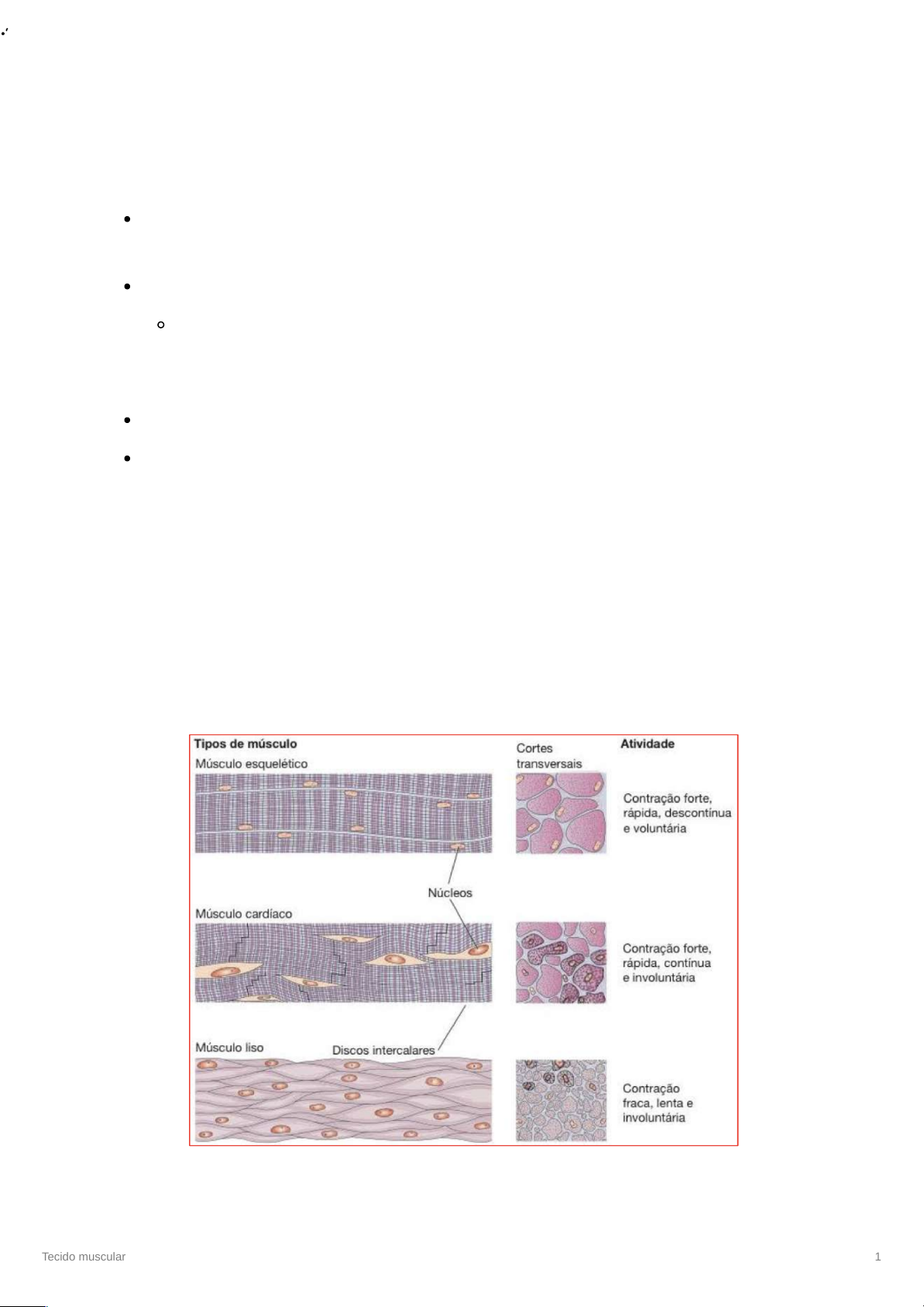 Tecido muscular 1 Tecido muscular Células alongadas, com filamentos citoplasmáticos de proteínas contráteis, geradores das forças para a contração; Têm origem mesodérmica; O mesoderma se diferencia em mioblastos, que passam a produzir proteínas relacionadas à contração (actina, miosina, calmodilina, tropomiosina, etc) Sua diferenciação ocorre pela síntese de proteínas filamentosas; Distinguem-se três tipos, com células que se diferenciam com relação ao tamanho, presença ou ausência de estrias transversais, quantidade e posição dos núcleos e a presença de revestimento: 1. Tecido muscular estriado esquelético, que possui contração rápida, descontínua e voluntária 2. Tecido muscular estriado cardíaco, que possui contração rápida, forte, contínua e involuntária 3. Tecido muscular liso, que possui contração fraca e involuntária · Tecido muscular 2 Diferenciação histológica Músculo estriado esquelético se diferencia pela quantidade de núcleos e suas posições periféricas. Possui estrias transversais, que contém filamentos chamados miofibrilas (cada uma formada por estruturas proteicas responsáveis pela contração muscular). Não é possível visualizar o começo e o fim de cada feixe devido a seu tamanho extenso, além disso, em cortes transversais, também não é possível visualizar as estrias transversais. Músculo estriado cardíaco pode apresentar feixes mono ou binucleados, cujos núcleos são centrais. Bem como o esquelético, possui estrias transversais (organização das proteínas de contração – actina e miosina – de forma que dê a impressão morfológica de alternância de polaridade) Músculo liso apresenta feixes mononucleados cujos núcleos são centrais. Diferentemente dos dois anteriores, não possui estrias transversais. Cada músculo possui um tipo de tecido que envolve as células musculares e o tecido inteiro. No caso do músculo estriado esquelético, existem o endomísio, o perimísio e epimísio. O músculo estriado cardíaco possui somente endomísio enquanto para o músculo liso existem a lâmina basal, as fibras reticulares e o endomísio. ~ Tecido muscular 3 Músculo estriado esquelético Tecido muscular 4 Formado por feixes de células longas, cilíndricas e multinucleadas com estriações transversais; Contém filamentos chamados miofibrilas de origem embrionária; São formadas no embrião pela fusão de mioblastos que produzem um miotubo multinucleado pós-mitótico; (Mioblasto é uma célula que se diferencia do mesênquima , uma célula de um folheto embrionário pode se diferenciar vários tipos celulares: fibroblasto, lipoblasto, osteoblasto, condroblasto bem como mioblasto) O miotubo amadurece e se transforma em uma longa célula muscular, com um diâmetro de 10 a 100 um e um comprimento que pode chegar a vários centímetros; Núcleos periféricos, próximos ao sarcolema (membrana plasmática); O sarcoplasma é o citoplasma da célula e o retículo sarcoplasmático é o retículo endoplasmático liso que tem como função ser um armazenador de cálcio; Fibras organizadas em grupos de feixes; As miofibrilas são constituídas por arranjos de miofilamentos - estruturas protéicas responsáveis pela contração celular; O músculo estriado esquelético é envolvido por três camadas de tecido conjuntivo: Envolvendo o músculo inteiro tem-se o epimísio, que é um tecido Tecido muscular 5 conjuntivo denso não modelado que envolve todo o músculo e imite septos para o seu interior, organizando as fibras/feixes musculares em grupos chamados fascículos musculares. O grupo de células também possui envolvimento de tecido conjuntivo denso não modelado, o perimísio. Esse último também emite septos para o interior de sua rede, envolvendo cada célula, formando o endomísio de tecido conjuntivo frouxo. Essas três camadas servem para manter as células unidas e permitem que a contração se propague por todo o músculo, tendões e ligamentos, ou seja, aumenta a eficiência da transmissão o mecanismo de contração. O tecido conjuntivo mantém as fibras musculares unidas permitindo que a força de contração atue sobre o músculo inteiro e se transmite a outras estruturas como os tendões e ossos. As bainhas de tecido conjuntivo, principalmente do endomísio, perimísio e epimísio, fundem-se entre si e os fascículos musculares se entrelaçam em cada extremidade do músculo com o tecido conjuntivo denso modelado do tendão, a fim de formar a junção miotendinosa, ou seja é constituída pelo tecido conjuntivo do tendão com as bainhas de tecido conjuntivo do tecido muscular. O tendão, por sua vez, se ancora com um osso por meio das fibras de Sharpey do periósteo. Tecido muscular 6 Alguns tecidos musculares se regeneram, o tecido muscular esquelético não é um deles. As células satélites têm uma importância considerável manutenção, reparo e regeneração na manutenção, no reparo e na regeneração dos músculos esqueléticos do adulto. Na regeneração, a célula que regenerará será a célula satélite, que pode se diferenciar em célula muscular. Portanto, o músculo se regenera, mas a célula não se regenera. O músculo cardíaco também não se regenera, e nem se quer possui células satélites e o local lesionado é preenchido por tecido conjuntivo. Já o músculo liso se regenera e as suas células têm a capacidade de se dividir — Organização das fibras Ao ME revela a presença de filamentos finos de actina e grossos de miosina dispostos longitudinalmente nas miofibrilas; A organização é mantida por diversas proteínas como a desmina que liga as miofibrilas entre si; A proteína distrofina liga os filamentos de actina à proteínas do sarcolema, um elo entre a proteína motora e a membrana plasmática. - Tecido muscular 7 Numa distrofia, as fibras musculares são frágeis devido a anormalidades genéticas em proteínas que dão suporte estrutural ao sarcolema. Em consequ
