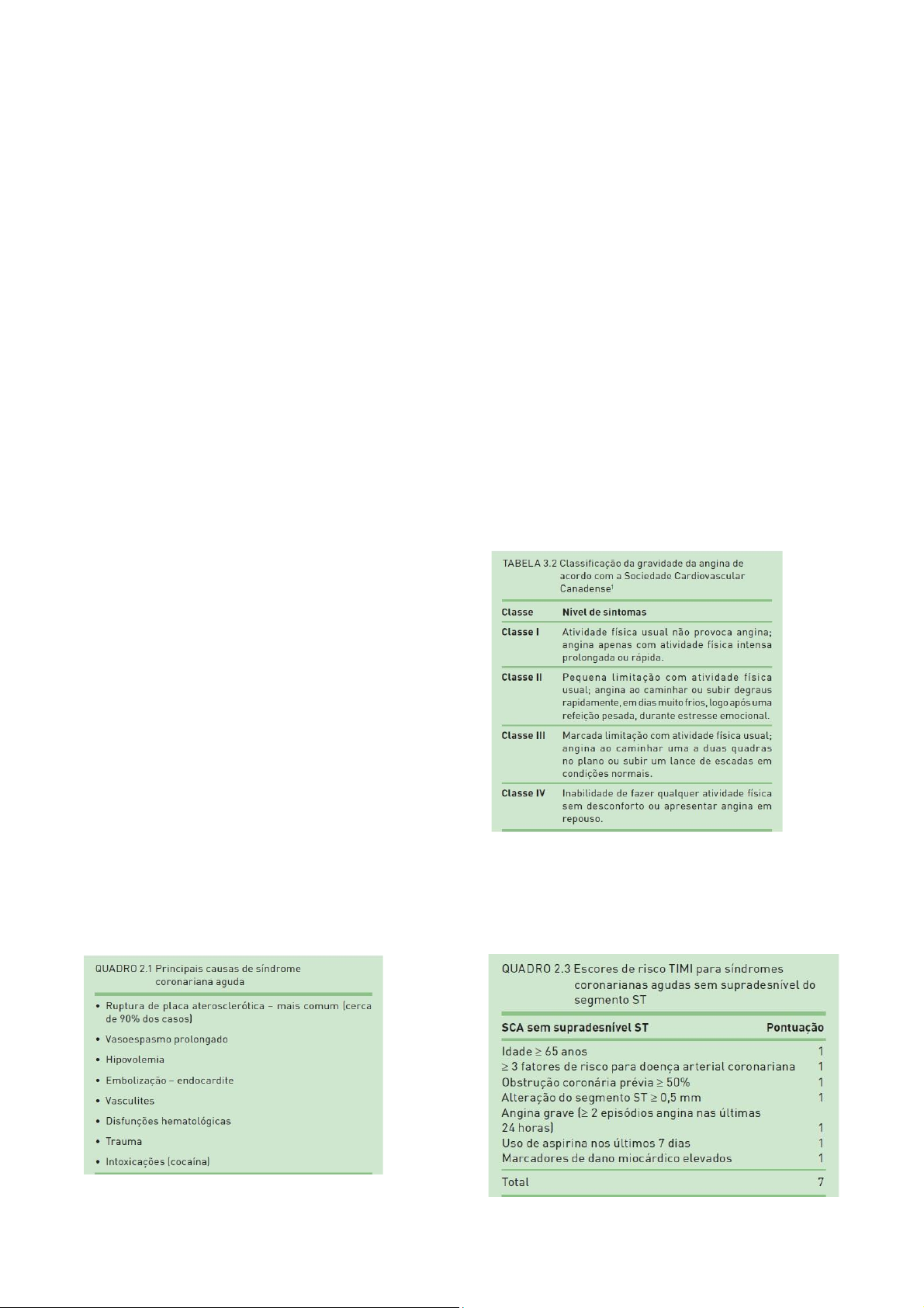 Síndrome Coronariana Aguda Definição A síndrome coronária aguda é um processo que ocorre devido à desproporção entre a oferta e demanda de oxigênio para o miocárdio, geralmente em consequência da instalação de placas de ateromas nas artérias que irrigam o coração. A depender do grau de obstrução e da severidade da isquemia, pode-se surgir diferentes síndromes clinicas. O processo de trombose induz a isquemia, podendo causar lesão miocárdica e necrose com extravasamento de marcadores bioquímicos para a corrente sanguínea, como as troponinas, sendo uma forma de diferenciação entre angina instável e infarto. Ademais, tem-se a angina estável, originada a partir do desequilíbrio da oferta e demanda de sangue para o miocárdio, mas com manifestações clinicas de menor intensidade e duração, além de ser desencadeada com atividade física ou esforço emocional, diferente do que ocorre nas SCA. Etiologia As síndromes coronarianas agudas são desencadeadas em 90% dos casos, devido a uma ruptura de uma placa de ateroma. Outras vezes, processos patológicos de natureza diferente podem promovem um desequilíbrio na oferta e demanda de sangue ao miocárdio. Entre as causas não ateroscleróticas mais comuns está o vasoespasmo, resultando em uma alteração na função vasodilatadora das artérias, seja por causas patológicas ou por uso de drogas simpatomiméticas. Epidemiologia As doenças cardiovasculares são a principal causa de morte no Brasil, representando cerca de um terço da totalidade dos casos e constituindo-se em um problema de saúde pública. A SCA é mais incidente em indivíduos com fatores de risco classicamente conhecidos, como idade avançada, história familiar, hipertensão arterial sistêmica, tabagismo, obesidade, dislipidemia e diabetes melito. Classificação e diagnostico A escala da angina da Sociedade Canadense de Cardiologia (CCS), é uma escala ordinal de quatro pontos que classifica a angina de branda à grave e inclui o espectro completo desde angina estável até a instável. Os critérios da Sociedade Brasileira de cardiologia são os mais utilizados, embora as escalas de TIMI e GRACE também sejam frequentemente empregadas. A aterosclerose, principal responsável pelos casos de SCA é uma resposta inflamatória crônica de acumulo de lipídios na parede arterial, de inicio silencioso durante anos e até mesmo décadas. No entanto, com a evolução da doença e o pouco controle dos fatores de risco a inflamação crônica resulta em alterações no endotélio vascular interferindo na vasodilatação arterial resultando em manifestações clinicas características da angina estável. Ademais, no decorrer da doença, episódios de fissura e erosão das placas desencadeiam a formação de um trombo que se acumula de segundos a minutos para produzir isquemia aguda (SCA), resultando em angina instável ou ate mesmo infarto agudo do miocárdio. Angina estável tem como característica o surgimento de sintomas clínicos graduais, atingindo sua intensidade máxima dentro de minutos. Ocorre após a realização de esforços físicos, estresse emocional, exposição ao frio e é tipicamente aliviada dentro de minutos com repouso ou uso de nitroglicerina sublingual, oral ou cutânea, com duração máxima de 20 minutos. Já no caso de angina instável, as manifestações clinicas possuem um padrão de piora, com apresentação súbita mais grave e mais prolongada ou mais frequente que a angina estável, além de ocorrer em repouso, mas sem evidencia bioquímica de necrose de miócitos. Além disso, a apresentações de sinais e sintomas com a presença de marcadores químicos de necrose miocárdica e sem elevação do segmento ST tem um IAM-SSST, já no caso de evidencia de marcadores e elevação do segmento ST persistente (> 20 minutos), tem- se IAM-CSST. Oclusão parcial, oclusão na presença de circulação colateral ou embolização distal resultam em angina instável ou IAM-SSST. Fisiopatologia O processo de formação de placas de ateroma inicia-se basicamente pelo acumulo de lipoproteínas, predominantemente LDL, na camada intima, a camada mais interna da artéria. A associação dessas moléculas de gordura com enzimas como lipase (produzida pelo endotélio), entre outros mecanismos fisiológicos, contribuem para o aprisionamento de LDL. Uma vez presas na parede da artéria, processos de oxidação, recrutamento de células T, monócitos e macrófagos estimulam o acumulo colesterol oxidado no endotélio, os quais são gradualmente transformados pelos macrófagos em células espumosas carregadas de colesterol. Apesar disso, esse núcleo rico em colesterol permanece isolado do compartimento sanguíneo por uma capa fibrosa rica em colágeno bem estruturado. No entanto, as células de defesa que medeiam esse processo (macrófagos e células T), produzem mediadores pró-inflamatórios como fator necrose tumoral (TNF), interleucina-1, colagenase, radicais de oxigênio e nitrogênio, interferom-y inibindo a formação de fibras de colágeno e a proliferação de musculo liso e reduzindo a resistência e predispondo-a à ruptura. Dessa forma, surge a placa suscetível que pode se romper ou erodir em condições de sobre carga hemodinâmica, principalmente, em suas margens, onde a capa fibrosa é ais fina e a tensão mecânica maior. As fissuras e erosões estimulam a aterotrombose expondo o material trombogênico de dentro da placa. Num primeiro momento, a liberação de fibrinogênio para induzir a agregação plaquetária e de tromboxano para induzir a vaso contrição, visam a formação de um coagulo homostatico para interromper o sangramento. Processo mais frequento em angina instável e IAM-SSST. No entanto, num segundo momento, a exposição do fator tecidual à corrente sanguínea estimula a formação de protombina, trombina e por fim rede de fibrina, responsável por dar estabilidade ao trombo. Esse processo, conhecido como hemosta
