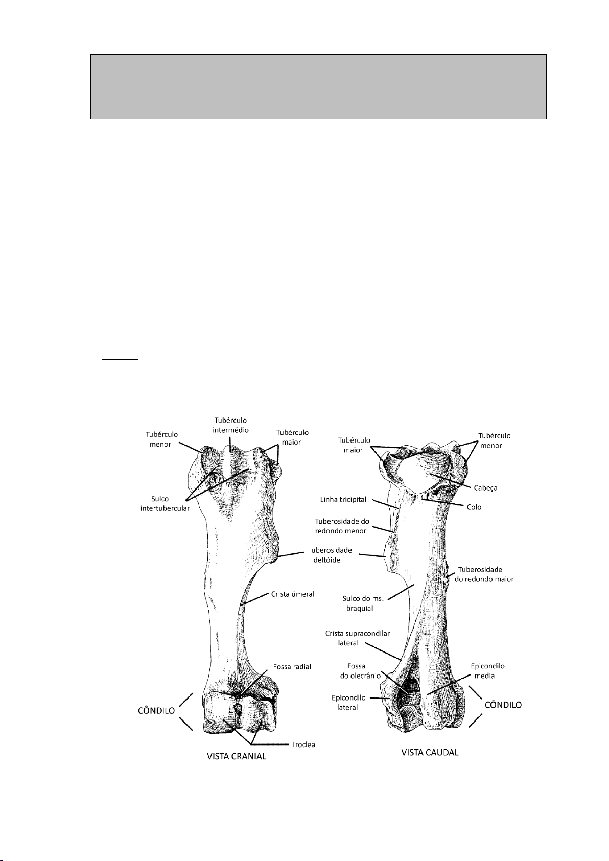 1 A.OBJECTIVOS DA PRÁTICA -Estudar a conformação dos acidentes ósseos do úmero nas distintas espécies domésticas, considerando o seu significado funcional. B.MATERIAL ANATÓMICO -Úmeros de diferentes espécies domésticas. C.DESENVOLVIMENTO DA PRÁTICA ESQUELETO DO BRAÇO O esqueleto do braço está constituído por um único osso, o úmero. ÚMERO É um osso longo típico que apresenta duas extremidades articulares (epífises) e uma parte central ou corpo. Figura 3.1- Úmero esquerdo de cavalo. PRÁTICA 3- OSTEOLOGIA: ESQUELETO DO BRAÇO: ÚMERO Práticas de Embriologia e Anatomia I 2 Cabeça do úmero Superfície semi-esférica que se articula com a cavidade glenóide da escápula. É de localização caudal. Colo do úmero É o estreitamento localizado entre a cabeça e o corpo. Tubérculo maior Trata-se de um relevo lateral que apresenta as porções cranial e caudal. Nele se inserem os ms. supraespinhoso e infraespinhoso. Tubérculo menor É medial e apresenta também porção cranial e caudal. Recebe a inserção dos ms. supraespinhoso e subescapular. Sulco intertubercular Encontra-se entre o tubérculo maior e o tubérculo menor. Serve de superfície de deslizamento do tendão de origem do ms. bíceps braquial. No cavalo apresenta um tubérculo intermédio. Rugosidade para o ms. infraespinhoso Localizada lateralmente para a inserção do m. infraespinhoso. Tuberosidade do redondo menor É uma pequena saliência para a inserção deste músculo, localizado lateralmente, nas proximidades da linha tricipital. Linha tricipital Estende-se desde a cabeça até à tuberosidade deltóide. Dá origem à cabeça lateral do ms. tríceps. Corpo do úmero É cilíndrico e apresenta as faces lateral, medial, cranial e caudal. -Tuberosidade deltóide: localizada na face lateral. Inserção do m. deltóide. -Tuberosidade do redondo maior: localizada na face medial. Inserção do ms. redondo maior e grande dorsal. -Crista umeral: desce desde a tuberosidade deltóide até à extremidade distal. Inserção do m. braquiocefálico, e dos ms. peitorais descendentes e transverso. -Sulco do ms. braquial: superfície de trajecto oblíquo que, desde o colo do úmero percorre as faces caudal, lateral e cranial do corpo umeral. Marca o trajecto do m. braquial. Côndilo do úmero É o extremo distal do úmero. Apresenta os seguintes detalhes anatómicos. -Tróclea do úmero: superfície semicilíndrica do côndilo para articular-se com a ulna e rádio. -Fossa do olecrânio: profunda depressão na face caudal do côndilo para articular-se com o processo ancóneo da ulna. Práticas de Embriologia e Anatomia I 3 -Fossa radial: localiza-se cranialmente sobre a tróclea, para alojar a cabeça do rádio quando o cotovelo está flectido. Epicondilo lateral Localiza-se lateralmente ao côndilo. Proximalmente a ele discorre a crista supracondilar lateral. É ponto de origem dos ms. extensores do carpo e dedos. Epicondilo medial Localizado medialmente ao côndilo. Dá origem aos ms. flexores do carpo e dedos. ANATOMIA COMPARADA DO ÚMERO CAVALO -Destaca-se a presença do tubérculo intermédio entre os tubérculos maior e menor, pelo que o sulco intertubercular é duplo. -A tuberosidade deltóide é muito pronunciada. Figura 3.2- Úmero de vaca, cão e gato RUMINANTES -O tubérculo maior alcança um grande desenvolvimento, com a sua parte cranial muito alta, pontiaguda e encurvada sobre o sulco intertubercular. -A rugosidade do m. infraespinhoso é marcada e circular. Práticas de Embriologia e Anatomia I 4 CARNÍVOROS - O tubérculo maior e o tubérculo menor são pequenos e indivisos; - A tuberosidade deltóide está pouco marcada; - O côndilo apresenta além da tróclea, um capitulum localizado lateralmente; - Orifício supratroclear: presente no cão comunicando as fossas radial e do olecrânio; - Orifício supracondilar: presente no epicôndilo medial do gato.
