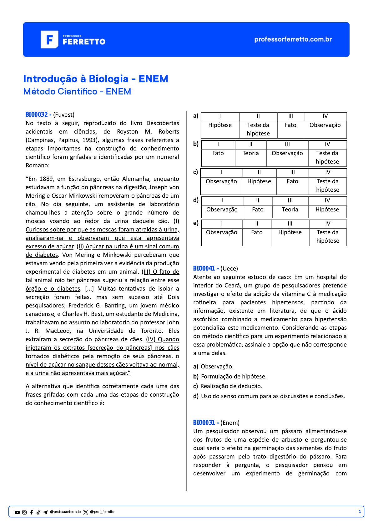 Introdução à Biologia - ENEM Método Científico - ENEM BIO0032 - (Fuvest) No texto a seguir, reproduzido do livro Descobertas acidentais em ciências, de Royston M. Roberts (Campinas, Papirus, 1993), algumas frases referentes a etapas importantes na construção do conhecimento científico foram grifadas e identificadas por um numeral Romano: “Em 1889, em Estrasburgo, então Alemanha, enquanto estudavam a função do pâncreas na digestão, Joseph von Mering e Oscar Minkowski removeram o pâncreas de um cão. No dia seguinte, um assistente de laboratório chamou-lhes a atenção sobre o grande número de moscas voando ao redor da urina daquele cão. (I) Curiosos sobre por que as moscas foram atraídas à urina, analisaram-na e observaram que esta apresentava excesso de açúcar. (II) Açúcar na urina é um sinal comum de diabetes. Von Mering e Minkowski perceberam que estavam vendo pela primeira vez a evidência da produção experimental de diabetes em um animal. (III) O fato de tal animal não ter pâncreas sugeriu a relação entre esse órgão e o diabetes. [...] Muitas tentativas de isolar a secreção foram feitas, mas sem sucesso até Dois pesquisadores, Frederick G. Banting, um jovem médico canadense, e Charles H. Best, um estudante de Medicina, trabalhavam no assunto no laboratório do professor John J. R. MacLeod, na Universidade de Toronto. Eles extraíram a secreção do pâncreas de cães. (IV) Quando injetaram os extratos [secreção do pâncreas] nos cães tornados diabéticos pela remoção de seus pâncreas, o nível de açúcar no sangue desses cães voltava ao normal, e a urina não apresentava mais açúcar.” A alternativa que identifica corretamente cada uma das frases grifadas com cada uma das etapas de construção do conhecimento científico é: a) I II III IV Hipótese Teste da hipótese Fato Observação b) I II III IV Fato Teoria Observação Teste da hipótese c) I II III IV Observação Hipótese Fato Teste da hipótese d) I II III IV Observação Fato Teoria Hipótese e) I II III IV Observação Fato Hipótese Teste da hipótese BIO0041 - (Uece) Atente ao seguinte estudo de caso: Em um hospital do interior do Ceará, um grupo de pesquisadores pretende investigar o efeito da adição da vitamina C à medicação rotineira para pacientes hipertensos, partindo da informação, existente em literatura, de que o ácido ascórbico combinado a medicamento para hipertensão potencializa este medicamento. Considerando as etapas do método científico para um experimento relacionado a essa problemática, assinale a opção que não corresponde a uma delas. a) Observação. b) Formulação de hipótese. c) Realização de dedução. d) Uso do senso comum para as discussões e conclusões. BIO0031 - (Enem) Um pesquisador observou um pássaro alimentando-se dos frutos de uma espécie de arbusto e perguntou-se qual seria o efeito na germinação das sementes do fruto após passarem pelo trato digestório do pássaro. Para responder à pergunta, o pesquisador pensou em desenvolver um experimento de germinação com 1@professorferretto @prof_ferretto sementes de diferentes origens. Para realizar esse experimento, as sementes devem ser coletadas a) aleatoriamente do chão da mata. b) de redes de coleta embaixo dos arbustos. c) diretamente dos frutos de arbustos diferentes. d) das fezes dos pássaros de lugares diferentes. e) das fezes dos pássaros e dos frutos coletados dos arbustos. BIO0043 - (Upe) O objetivo da ciência é o de fornecer explicações para os fenômenos da natureza. Assim as explicações são formuladas e testadas rigorosamente. Analise as figuras que ilustram um procedimento científico. (_) Fato; (_) Hipótese; (_) Dedução; (_) Experimento; (_) Conclusão. Estabeleça a associação correta entre as colunas, seguindo a ordem numérica que descreve a cronologia de um procedimento científico e assinale a alternativa que contém a sequência correta. a) IV – I – V – II – III. b) IV – III – V – II – I. c) II – IV – III – I – V. d) III – IV – II – V – I. e) II – I – IIII – IV – V. BIO0039 - (Uerj) Até o século XVII, o papel dos espermatozoides na fertilização do óvulo não era reconhecido. O cientista italiano Lazaro Spallanzani, em 1785, questionou se seria o próprio sêmen, ou simplesmente o vapor dele derivado, a causa do desenvolvimento do óvulo. Do relatório que escreveu a partir de seus estudos sobre a fertilização, foi retirado o seguinte trecho: “... para decidir a questão, é importante empregar um meio conveniente que permita separar o vapor da parte figurada do sêmen e fazê-lo de tal modo, que os embriões sejam mais ou menos envolvidos pelo vapor.” Dentre as etapas que constituem o método científico, esse trecho do relatório é um exemplo de: a) análise de dados. b) coleta de material. c) elaboração da hipótese. d) planejamento do experimento. BIO0048 - (Fmj) O termo ciência tem origem no latim e significa conhecer ou saber. A busca do saber, no entanto tem que ser feita com critério, no chamado método científico. Suponha, por exemplo, que um astrólogo tenha afirmado que certos signos têm mais chances de apresentar problemas no fígado do que outros, mas tenha frisado que isto seja apenas uma tendência: “nem todas as pessoas desse signo terão problemas no fígado”. Para testar a afirmativa do astrólogo, utilizando corretamente o método científico, deveríamos: a) Verificar se todas as pessoas dos signos indicados têm problemas no fígado. b) Não há como testar cientificamente a afirmativa do astrólogo. c) Verificar se em grande número de pessoas há mais pessoas com problemas no fígado nos signos indicados do que nos outros. d) Verificar se nos signos indicados há mais problemas no fígado do que em outros órgãos. e) Pesquisar se as pessoas que recebem fígado em transplantes são de um mesmo signo. 2@professorferretto @prof_ferretto BIO0033 - (Fu