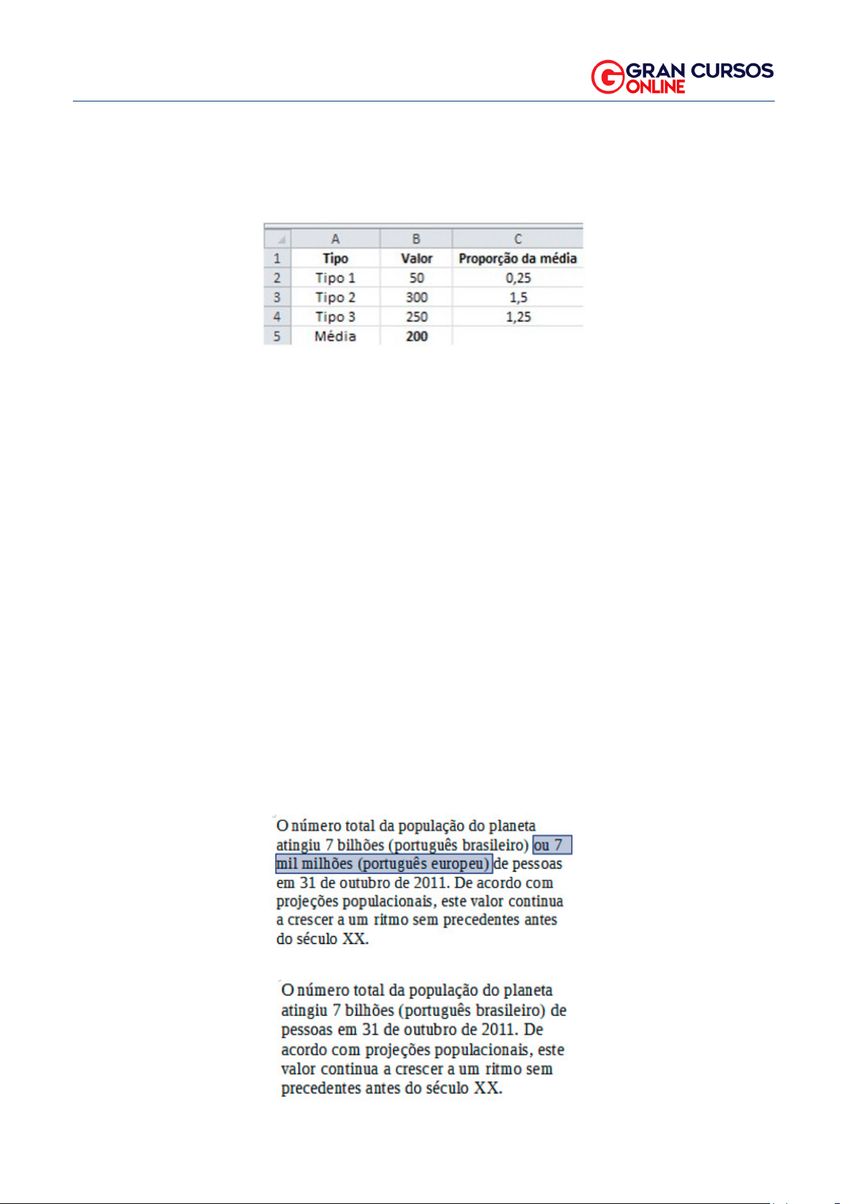 240 Professora: Fernanda Barboza CADERNO DE PROVAS FGV www.grancursosonline.com.br CONHECIMENTOS BÁSICOS DE INFORMÁTICA 21. Analise o trecho de uma planilha MS Excel 2010 mostrado a seguir. A coluna C mostra a proporção dos valores da coluna B em relação à média destes. Sabendo-se que a célula C2 foi copiada para as células C3 e C4, está correto concluir que a fórmula contida na célula C2 é: a. =B2 / $B5 b. =B$2 / B$5 c. =B$2 / B5 d. =B2 / B$5 e. =$B2 / $B5 22. Por meio das guias do MS Word 2010, é possível: a. criar arquivos PDF a partir de documentos em edição; b. abrir, editar e salvar arquivos PDF gerados por outros aplicativos; c. inserir, no documento sendo editado, arquivos PDF por meio da guia “Inserir”; d. abrir em modo “somente leitura” arquivos PDF gerados por outros aplicativos; e. importar somente as figuras de um arquivo PDF por meio da guia “Inserir”. 23. No contexto do LibreOffice Writer 4.2, analise o texto a seguir com um trecho selecionado. Analise o mesmo texto depois da aplicação de uma certa operação de edição. 241 Professora: Fernanda Barboza CADERNO DE PROVAS FGV www.grancursosonline.com.br A operação de edição foi provocada pela digitação de: a. Ctrl-c b. Ctrl-v c. Ctrl-x seguido de Ctrl-v d. Ctrl-x e. Ctrl-v seguido de Ctrl-x 24. Analise o trecho de tela do MS Word 2010 mostrado a seguir. O formato acima demonstra que o usuário está utilizando o recurso denominado: a. comparação de versões de um documento; b. controle de alterações; c. dicionário de sinônimos; d. ortografia e gramática; e. pincel de formatação. 25. João preparou um documento no MS Word 2010 com informações confidenciais e, depois de criptografá-lo, enviou-o por e-mail para seu colega Paulo. Isso significa que Paulo: a. pode abrir o arquivo por meio do Bloco de Notas do Windows e visualizá-lo como texto sem formatação; b. não pode deletar o arquivo; c. precisa de uma senha para abrir o arquivo no MS Word; d. pode abrir o arquivo apenas no modo read only; e. não receberá o arquivo, pois os servidores de e-mail não aceitam arquivos crip- tografados. 26. Considere as seguintes escolhas que Maria fez para sua senha pessoal: ++TeleFoNE++ 10121978 Segredo#$&% Telefone=Mudo =SeGREdo! Dessas senhas, a mais fraca é a: a. primeira; b. segunda; c. terceira; d. quarta; e. quinta. 242 Professora: Fernanda Barboza CADERNO DE PROVAS FGV www.grancursosonline.com.br 27. Joana quer enviar um e-mail para um numeroso grupo de pessoas, mas não quer que seus destinatários saibam para quem esse e-mail está sendo enviado. Uma opção rápida e prática para Joana nesse caso é: a. colocar todos os destinatários como Cco; b. colocar todos os destinatários como Cc; c. enviar os e-mails um a um; d. usar pseudônimos de e-mail; e. criptografar as mensagens de e-mail. 28. No MS Windows 7, o menu mostrado a seguir permite que uma impressora seja esco- lhida como a impressora padrão. Esse menu é alcançado por meio do: a. Browser; b. Gerenciador de Tarefas; c. Painel de Controle; d. Windows Explorer; e. Windows Media Center,