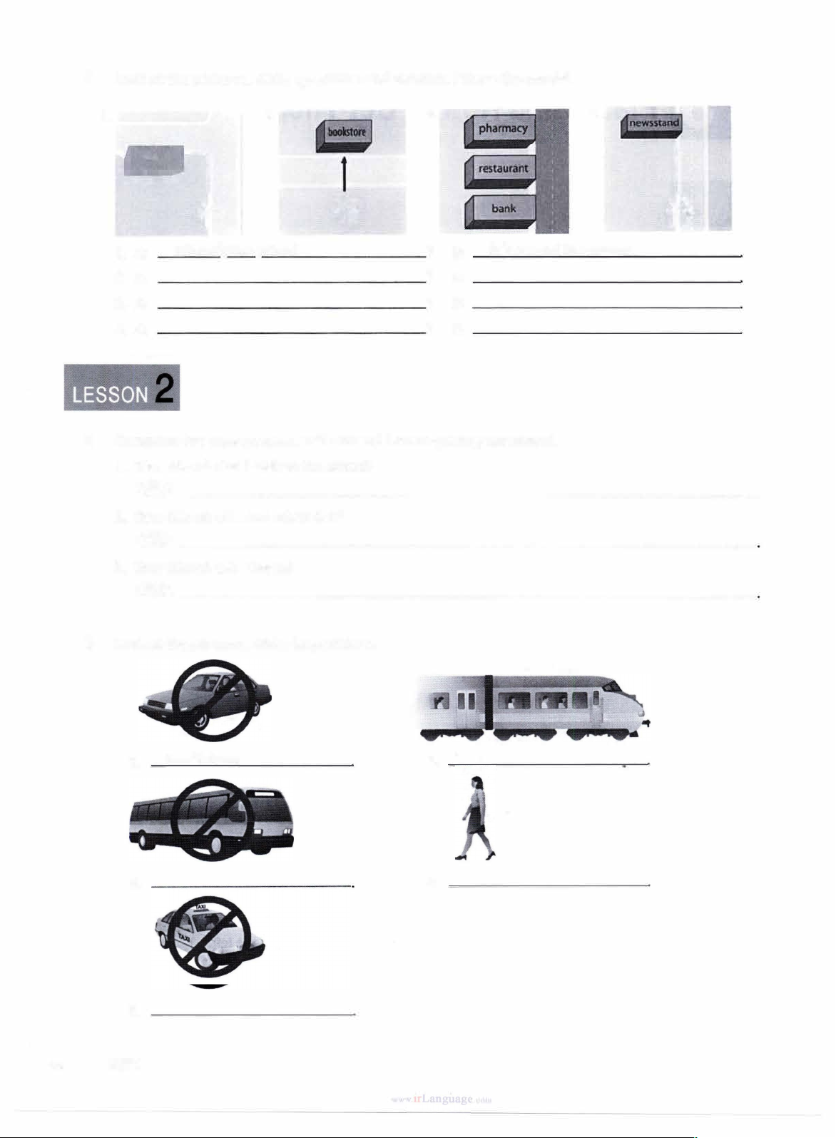 4 Look at the pictures. Write questions and answers. Follow the model. 1. 2. 3. �l t) t) 4. 1. A: W/,,ere's: t/,,e s:c/,,ool ? B: It's: around tl,,e corner 2. A: ? B: 3. A: ? B: 4. A: ? B: u�1�1 ul:+j t?.>4 5 Complete the conversation. Tell a friend how to get to your school. 1. Your friend: Can I walk to the school? 1 t) � ��������������������������������· 2. Your friend: OK. And where is it? � �������������������������������� 3. Your friend: OK. Thanks! � �������������������������������� 6 Look at the pictures. Write imperatives. 1. 3. 5. 94 UNIT3 Don'tdriye www.irLanguage.com 2. 4. 7 Tell a new classmate how to go places from school. Use an affirmative and a negative imperative. Example: to a bookstore: Take t"1e bus-. Dori't walk. 1. to a bookstore:-------------------------------- 2. to abank: _________________________________ _ 3. to a pharmacy:-------------------------------- 4. to a restaurant: _______________________________ _ 8 Look at the pictures. Write a sentence with an imperative and a sentence about the location. Follow the model. 1. 2. 4. �1 _ti --=tl u�1�1 ul:oj ef'.JD www.irLanguage.com Take a taxi to t"1e bookftore It' S' riext to t"1e barik Places and How to Get There 95 9 Look at the pictures. Write questions. Follow the model. I I lJ • Can I walk to tJ,e books-tore 71. �--'-������-'-�����-· 3. 4. 10 Look at the pictures. Answer the questions. Use a .12,Y phrase. I take the subway home. 1. How does she go home? f3y n.1bwoy 3. How do they go to work? 2. How does he go to the bookstore? I take a bus to school. 4. How does she go to school? 11 How do you go places? Read the sentences. Write I for sentences that are true for you and E for sentences that are false for you. 1. __ I go to school by bicycle. 5. __ I walk to the bookstore. 2. __ I take a taxi to restaurants. 6. __ I go to work by moped. 3. __ I go to work by train. 7. __ I take the subway to the bank. 4. __ I go home from school by bus. 96 UNIT 3 JUST FOR FUN 1 A RIDDLE FOR YOU! Read the clues. Then write the places on the lines. • The bookstore is between the restaurant and the pharmacy. • The bank is not next to the bookstore. • The restaurant is next to the bank. • The pharmacy is not on the left. 1. ------- 2. ------- 3. ------- 4. 2 WORD FIND. Look across(-) and down(!). Circle the eight means of transportation. Then write the means of transportation on the lines. C u s 0 G z z s H H s H p R F A I A E u p H s I R y T K B A N M 0 T 0 R G w A B 0 w M T A u A C N p z p L I T y N C E s p I N z M y K D C I A s R w E N M B w M N T I y T L Q Q E p z A I u u R T s T E G A K K L R H K X K u K M u N C A M J F N J R Q w G s C X T A u E 0 B z z F B M H L J s I B I 0 X X s w s C y C L E C J w F F F X Q I y M F y B 0 y G T H 0 A K B N T H T F I X E 0 R u C p Q A X I y s w B u s C H s R G T L H z V F B E X y Q w s V B p Places and How to Get There 97