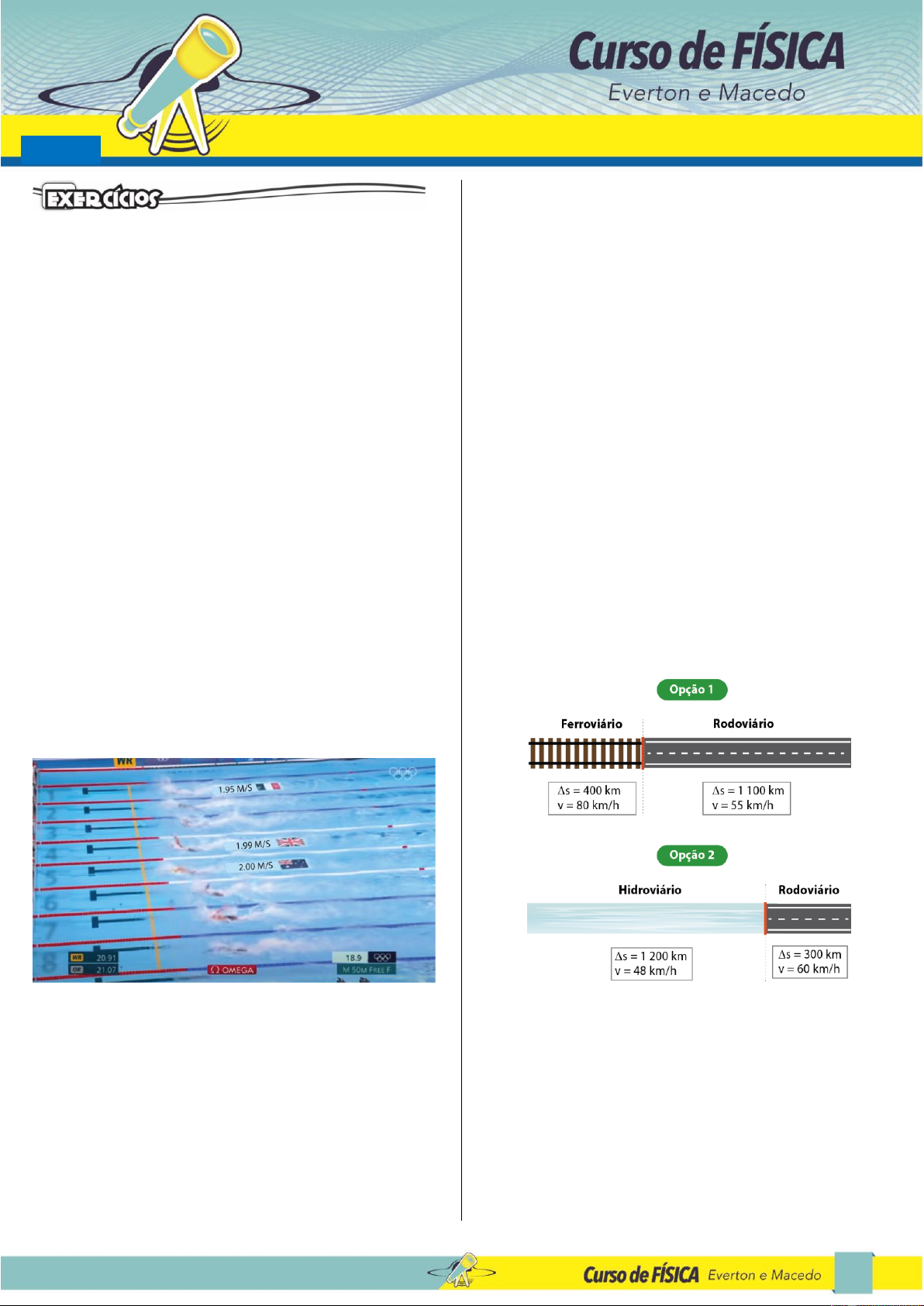 CADERNO DE CARNAVAL 01. (ETECSP) Considerando que a velocidade média de um trator movido a diesel é de 10 km/h, assinale a alternativa que apresenta o tempo necessário, em minutos, para que ele percorra o perímetro externo de uma plantação com formato quadrado de lado igual a 500 m. A 3 B 12 C 20 D 200 E 250 02. (IFRS) A velocidade da água de um rio é de 1,5 m/s em relação às suas margens retilíneas e paralelas. Considere que um barco pode desenvolver uma velocidade de 2,5 m/s em relação à água. Duas casas na mesma margem deste rio estão separadas por uma distância de 360 m. Marque a alternativa que lista os tempos para ir de uma casa à outra descendo o rio (a favor da correnteza) e subindo o rio (contra a correnteza), nessa ordem. A 90 s e 180 s. B 90 s e 360 s. C 180 s e 360 s. D 180 s e 720 s. E 360 s e 720 s. 03. (FCM-MG) Na disputa da final dos 50 metros nado livre masculino dos Jogos Olímpicos de Paris 2024, o australiano Cameron McEvoy, que nadava na raia 5, ficou em primeiro lugar com o tempo de 21,25 segundos. A imagem a seguir apresenta as velocidades instantâneas de alguns competidores durante o certame. Disponivel em: https://www.youtube.com/watch?v=DuotkyUNAhi. Acesso: 16 ago. 2024. Adaptada. Caso McEvoy tivesse desenvolvido durante toda prova um valor constante de velocidade igual a 2,0 m/s, seu tempo final de prova seria: A menor em 3,75 s. B menor em 4,25 s. C maior em 3,75 s. D maior em 4,25 s. E igual a 4,25 s. 04. (FAMERP) Uma empresa de transportes mantém uma linha de ônibus que partem de um terminal e percorrem 30 km até retornar ao mesmo terminal, desenvolvendo, nesse percurso, a velocidade média de 20 km/h. Sabendo que o intervalo de tempo entre as saídas consecutivas de dois ônibus dessa linha é de 20 min, o número mínimo de ônibus que a empresa deve manter nessa linha para cumprir esse cronograma é de A 3. B 4. C 5. D 6. E 7. 05. (UFPR) O uso de múltiplos e submúltiplos de unidades de medida simplifica a escrita de números que, de outra forma, poderia se tornar muito extensa. Nesse sentido, considere que o diâmetro médio de fios de cabelo, em metros, vale e = 0,000070 m. Assinale a alternativa que expressa corretamente o valor do diâmetro médio de fios de cabelo usando múltiplos ou submúltiplos do metro. A e = 0,70 cm. B e = 0,70 km. C e = 70 mm. D e = 70 µm. E e = 70 nm. 06. (UNESP) Um estado brasileiro oferece duas opções de rotas, opção 1 e opção 2, para o transporte de mercadorias. A seguir, estão representadas as dimensões dos trechos de cada opção de rota e as máximas velocidades médias neles possíveis. Considerando as características dos modais apresentados e que em, cada opção de rota, desenvolva-se sempre a máxima velocidade média permitida, tem-se que A a opção 2 é a mais indicada para deslocar produtos estratégicos, como as commodities, já que apresenta grande capacidade de carga e significativa agilidade no transporte, com velocidade média de 54 km/h em todo o trajeto. B a opção 1 é a mais indicada para transportar produtos de elevado valor agregado, já que apresenta agilidade, com velocidade média de 67,5 km/h, e capacidade de minimizar os custos provocados pela baixa eficiência energética de seu modal predominante. C a opção 2 é a mais indicada para o transporte de produtos com baixo valor agregado e menor urgência de entrega, já que apresenta o predomínio de um modal econômico em eficiência energética e de reduzida velocidade média, com 50 km/h. D a opção 1 é a mais indicada para deslocar produtos perecíveis, já que, somando as velocidades de seus modais, apresenta uma velocidade média capaz de concluir o transporte em pouco menos de 11 horas. E a opção 1 é a mais indicada para o transporte de produtos primários, sobretudo bens de produção, já que oferece baixo custo de transporte associado à rapidez na entrega, com velocidade média de 65 km/h. 07. (CN) Um aluno do Colégio Naval, ao praticar treinamento físico-militar, desloca-se do Colégio ao clube distantes 4 km em 20 minutos e continua seu deslocamento do clube ao shopping distante 2 km, com uma velocidade v. Sabendo que a velocidade média do aluno no trajeto colégio-shopping foi de 12 km/h, qual é o módulo da velocidade v, em km/h, no trajeto clube- shopping? A 10 B 11 C 12 D 14 E 17 08. (CN) Numa corrida de automóvel, o carro Alpha com velocidade constante de 198 km/h persegue o carro Beta com velocidade constante de 180 km/h. Nesse determinado instante, o locutor da corrida informa que o computador indica que Beta está 8 400 m à frente de Alpha. Seis minutos após a informação do locutor, o carro Alpha quebra e abandona a corrida. Assim, mantidas as mesmas condições, quanto tempo, em minutos, faltava no momento da quebra para Alpha alcançar Beta? A 13 B 17 C 19 D 22 E 29 09. (FEEVale) Dois motoristas foram para um evento, no mesmo local, tendo o mesmo ponto de partida, porém em carros separados. O primeiro partiu às 9 h, com uma velocidade média de 60 km.h-1. O segundo partiu 15 minutos depois do primeiro, fez o mesmo percurso sob as mesmas condições. Os dois chegaram juntos ao endereço final às 10h30. Pergunta-se qual foi a velocidade média do segundo motorista em km.h-1? A 65,3. B 67,8. C 70,0. D 72,0. E 78,3. 10. (UFGD) Um automóvel percorre uma estrada retilínea com velocidade constante v não nula durante a primeira metade de tempo da viagem. Em seguida, na primeira metade de tempo do total que resta para concluir o percurso, acelera uniformemente até chegar ao dobro da sua velocidade inicial, mantendo em seguida a velocidade final obtida constante até o término do trajeto. Desprezando todos os atritos, assinale a alternativa que indica, corretamente, a velocidade escalar média do veículo durante toda a trajetória. A . B . C . D . E . 11. (EAM) Um navio parte para realizar uma missão. Devendo sair do Arsenal de Guerra em direção à entrada da Baía de Guanab