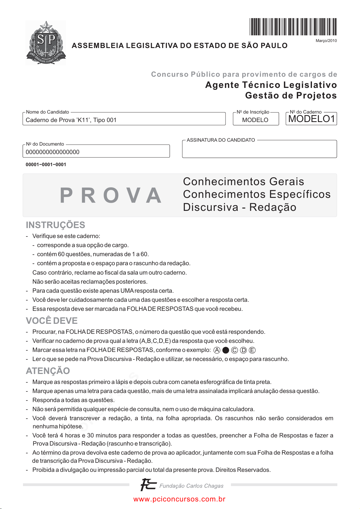 pcimarkpci MDAwMDowMDAwOjAwMDA6MDAwMDowMDAwOmZmZmY6OTU0ZTpiYjFk:V2VkLCAxOSBNYXIgMjAyNSAwMDoyMzowNyAtMDMwMA== www.pciconcursos.com.br N do CadernooN de Inscriçãoo ASSINATURA DO CANDIDATO N do Documentoo Nome do Candidato P R O V A Março/2010 Agente Técnico Legislativo Gestão de Projetos Concurso Público para provimento de cargos de ASSEMBLEIA LEGISLATIVA DO ESTADO DE SÃO PAULO Conhecimentos Gerais Conhecimentos Específicos Discursiva - Redação INSTRUÇÕES VOCÊ DEVE ATENÇÃO - Verifique se este caderno: - corresponde a sua opção de cargo. - contém 60 questões, numeradas de 1 a 60. - contém a proposta e o espaço para o rascunho da redação. Caso contrário, reclame ao fiscal da sala um outro caderno. Não serão aceitas reclamações posteriores. - Para cada questão existe apenas UMAresposta certa. - Você deve ler cuidadosamente cada uma das questões e escolher a resposta certa. - Essa resposta deve ser marcada na FOLHADE RESPOSTAS que você recebeu. - Procurar, na FOLHADE RESPOSTAS, o número da questão que você está respondendo. - Verificar no caderno de prova qual a letra (A,B,C,D,E) da resposta que você escolheu. - Marcar essa letra na FOLHADE RESPOSTAS, conforme o exemplo: - Ler o que se pede na Prova Discursiva - Redação e utilizar, se necessário, o espaço para rascunho. - Marque as respostas primeiro a lápis e depois cubra com caneta esferográfica de tinta preta. - Marque apenas uma letra para cada questão, mais de uma letra assinalada implicará anulação dessa questão. - Responda a todas as questões. - Não será permitida qualquer espécie de consulta, nem o uso de máquina calculadora. - Você deverá transcrever a redação, a tinta, na folha apropriada. Os rascunhos não serão considerados em nenhuma hipótese. - Você terá 4 horas e 30 minutos para responder a todas as questões, preencher a Folha de Respostas e fazer a Prova Discursiva - Redação (rascunho e transcrição). - Ao término da prova devolva este caderno de prova ao aplicador, juntamente com sua Folha de Respostas e a folha de transcrição da Prova Discursiva - Redação. - Proibida a divulgação ou impressão parcial ou total da presente prova. Direitos Reservados. A C D E Caderno de Prova ’K11’, Tipo 001 MODELO 0000000000000000 MODELO1 00001−0001−0001 www.pciconcursos.com.br pcimarkpci MDAwMDowMDAwOjAwMDA6MDAwMDowMDAwOmZmZmY6OTU0ZTpiYjFk:V2VkLCAxOSBNYXIgMjAyNSAwMDoyMzowNyAtMDMwMA== www.pciconcursos.com.br 2 ALESP-Conhec.Gerais3 CONHECIMENTOS GERAIS Língua Portuguesa Atenção: As questões de números 1 a 10 referem-se ao texto seguinte. Representatividade ética Costuma-se repetir à exaustão, e com as consequências características do abuso de frases feitas e lugares-comuns, que as esferas do poder público são o reflexo direto das melhores qualidades e dos piores defeitos do povo do país. Na esteira dessa convicção geral, afirma-se que as casas legislativas bra- sileiras espelham fielmente os temperamentos e os interesses dos eleitores brasileiros. É o caso de se perguntar: mesmo que seja assim, deve ser assim? Pois uma vez aceita essa corres- pondência mecânica, ela acaba se tornando um oportuno álibi para quem deseja inocentar de plano a classe política, atribuin- do seus deslizes a vocações disseminadas pela nação inteira... Perguntariam os cínicos se não seria o caso, então, de não mais delegar o poder apenas a uns poucos, mas buscar reparti- lo entre todos, numa grande e festiva anarquia, eliminando-se os intermediários. O velho e divertido Barão de Itararé já reivin- dicava, com a acidez típica de seu humor: “Restaure-se a moralidade, ou então nos locupletemos todos!”. As casas legislativas, cujos membros são todos eleitos pelo voto direto, não podem ser vistas como uma síntese cristalizada da índole de toda uma sociedade, incluindo-se aí as perversões, os interesses escusos, as distorções de valor. A chancela da representatividade, que legitima os legisladores, não os autoriza em hipótese alguma a duplicar os vícios sociais; de fato, tal representação deve ser considerada, entre outras coisas, como um compromisso firmado para a eliminação dessas mazelas. O poder conferido aos legisladores deriva, obviamente, das postulações positivas e construtivas de uma determinada ordem social, que se pretende cada vez mais justa e equilibrada. Combater a circulação dessas frases feitas e lugares- comuns que pretendem abonar situações injuriosas é uma forma de combater a estagnação crítica − essa oportunista alia- da dos que maliciosamente se agarram ao fatalismo das “fra- quezas humanas” para tentar justificar os desvios de conduta do homem público. Entre as tarefas do legislador, está a de fazer acreditar que nenhuma sociedade está condenada a ser uma comprovação de teses derrotistas. (Demétrio Saraiva, inédito) 1. Pareceu necessário, ao autor, empregar o adjetivo ética, no título do texto, porque o conceito de representa- tividade costuma ser (A) utilizado como um valor, em princípio, absoluto, não se prestando a justificar interesses escusos. (B) lembrado em seu valor relativo, pois a tarefa legis- lativa é mais alta do que a de representar os anseios públicos. (C) maliciosamente utilizado por quem dele se vale co- mo abono social para a prática de atos inescru- pulosos. (D) referido como um desses valores que, historicamen- te, vão mudando de sentido de acordo com a época. (E) ingenuamente tomado como consensual, já que há muitas dúvidas quanto às tarefas que cabem ao legislador. 2. Atente paras as seguintes afirmações: I. No 1 o parágrafo, a pergunta dos cínicos e a frase do Barão de Itararé consideram a possibilidade da universalização de vantagens inescrupulosamente obtidas. II. No 2 o parágrafo, o autor expressa sua convicção de que é fatal, na esfera do poder legislativo, a disse- minação das mesmas mazelas que afetam o con- junto da sociedade. III. No 3 o pará