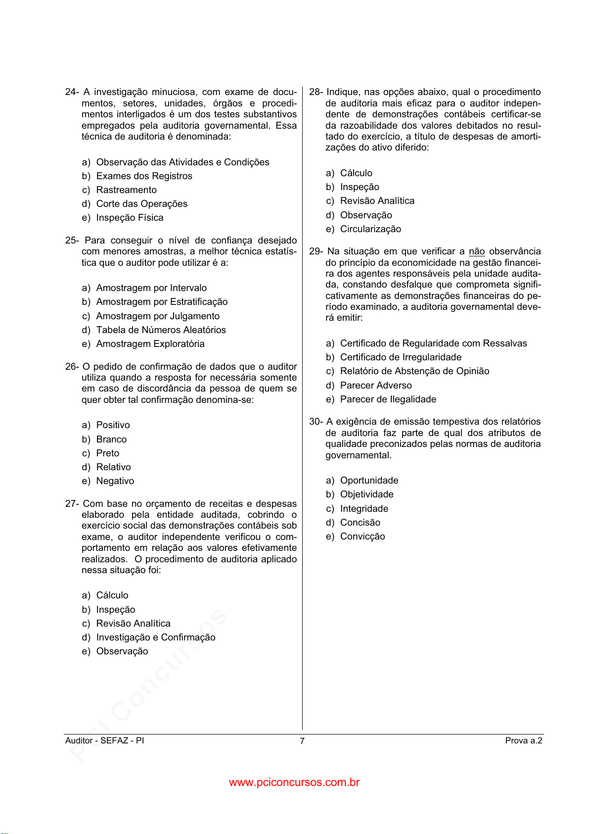 pcimarkpci MDAwMDowMDAwOjAwMDA6MDAwMDowMDAwOmZmZmY6MmRlODoyNjVi:V2VkLCAwMiBOb3YgMjAyMiAxNTo1Mzo0MiAtMDMwMA== www.pciconcursos.com.br Auditor - SEFAZ - PI Prova a.27 24- A investigação minuciosa, com exame de docu- mentos, setores, unidades, órgãos e procedi- mentos interligados é um dos testes substantivos empregados pela auditoria governamental. Essa técnica de auditoria é denominada: a) Observação das Atividades e Condições b) Exames dos Registros c) Rastreamento d) Corte das Operações e) Inspeção Física 25- Para conseguir o nível de confiança desejado com menores amostras, a melhor técnica estatís- tica que o auditor pode utilizar é a: a) Amostragem por Intervalo b) Amostragem por Estratificação c) Amostragem por Julgamento d) Tabela de Números Aleatórios e) Amostragem Exploratória 26- O pedido de confirmação de dados que o auditor utiliza quando a resposta for necessária somente em caso de discordância da pessoa de quem se quer obter tal confirmação denomina-se: a) Positivo b) Branco c) Preto d) Relativo e) Negativo 27- Com base no orçamento de receitas e despesas elaborado pela entidade auditada, cobrindo o exercício social das demonstrações contábeis sob exame, o auditor independente verificou o com- portamento em relação aos valores efetivamente realizados. O procedimento de auditoria aplicado nessa situação foi: a) Cálculo b) Inspeção c) Revisão Analítica d) Investigação e Confirmação e) Observação 28- Indique, nas opções abaixo, qual o procedimento de auditoria mais eficaz para o auditor indepen- dente de demonstrações contábeis certificar-se da razoabilidade dos valores debitados no resul- tado do exercício, a título de despesas de amorti- zações do ativo diferido: a) Cálculo b) Inspeção c) Revisão Analítica d) Observação e) Circularização 29- Na situação em que verificar a não observância do princípio da economicidade na gestão financei- ra dos agentes responsáveis pela unidade audita- da, constando desfalque que comprometa signifi- cativamente as demonstrações financeiras do pe- ríodo examinado, a auditoria governamental deve- rá emitir: a) Certificado de Regularidade com Ressalvas b) Certificado de Irregularidade c) Relatório de Abstenção de Opinião d) Parecer Adverso e) Parecer de Ilegalidade 30- A exigência de emissão tempestiva dos relatórios de auditoria faz parte de qual dos atributos de qualidade preconizados pelas normas de auditoria governamental. a) Oportunidade b) Objetividade c) Integridade d) Concisão e) Convicção www.pciconcursos.com.br pcimarkpci MDAwMDowMDAwOjAwMDA6MDAwMDowMDAwOmZmZmY6MmRlODoyNjVi:V2VkLCAwMiBOb3YgMjAyMiAxNTo1Mzo0MiAtMDMwMA== www.pciconcursos.com.br Auditor - SEFAZ - PI Prova a.28 ADMINISTRAÇÃO FINANCEIRA E ORÇAMENTÁRIA 31- Baseando-se nos objetivos dos princípios orça- mentários, indique, nas opções abaixo, qual deles estabelece que o orçamento deve conter apenas matéria orçamentária. a) Princípio da unidade b) Princípio da universalidade c) Princípio da legalidade d) Princípio da exclusividade e) Princípio do equilíbrio 32- Com relação aos objetivos da política orçamentá- ria, identifique a opção falsa. a) Promover ajustamentos na distribuição de renda. b) Promover política antidepressiva na econo- mia. c) Permitir o controle do nível agregado da demanda, mantendo a instabilidade econômi- ca. d) Imprimir política de austeridade fiscal. e) Permitir correção da desigualdade dos patri- mônios e das rendas. 33- No que diz respeito aos elementos essenciais do orçamento-programa, indique a opção não perti- nente. a) medidas de desempenho b) unidades organizacionais c) objetivos e propósitos d) custos e) programas 34- O planejamento no orçamento-programa é desen- volvido em 5 etapas. Aponte a etapa não adequada a esse processo. a) Identificação de prioridades. b) Estabelecimento de metas. c) Elaboração dos custos dos programas alter- nativos. d) Quantificação dos benefícios de programas alternativos. e) Auditoria dos programas. 35- De acordo com a Constituição Federal, assinale o período de vigência da Lei Orçamentária. a) seis meses b) um ano c) dois anos d) três anos e) tempo indeterminado 36- Identifique qual das receitas orçamentárias é classi- ficada como uma receita de captação de recursos. a) imposto de renda b) alienação de bens c) operações de crédito interno d) amortização de empréstimos e) operações de crédito por antecipação de receita 37- Segundo a classificação das despesas por cate- gorias econômicas, indique em qual categoria estão classificados os Benefícios Previdenciários. a) pessoal e encargos sociais b) juros e encargos da dívida pública c) investimentos d) outras despesas correntes e) amortização da dívida pública 38- O Orçamento Federal de 2001 foi elaborado com base no disposto pelo Decreto no 2829/98, da Portaria 42/99 do Ministério do Planejamento, Or- çamento e Gestão e da Lei no 101/2000, chamada Lei de Responsabilidade Fiscal. Atualmente, atra- vés de quais instrumentos são viabilizados os programas orçamentários? a) Função e Subfunção b) Função, Projetos e Encargos Especiais c) Projetos, Atividades e Encargos Especiais d) Função e Operações Especiais e) Projetos, Atividades e Operações Especiais www.pciconcursos.com.br pcimarkpci MDAwMDowMDAwOjAwMDA6MDAwMDowMDAwOmZmZmY6MmRlODoyNjVi:V2VkLCAwMiBOb3YgMjAyMiAxNTo1Mzo0MiAtMDMwMA== www.pciconcursos.com.br Auditor - SEFAZ - PI Prova a.29 39- Os créditos adicionais resolvem as situações clássicas de imprevisão na elaboração orçamen- tária. Assinale, nas opções abaixo, como os refe- ridos créditos são classificados. a) suplementares, especiais e extraordinários b) suplementares, extraordinários e provisórios c) especiais, extraordinários e provisórios d) suplementares, extraordinários e ilimitados e) ilimitados, extraordinários e provisórios 40- Tanto para a recei