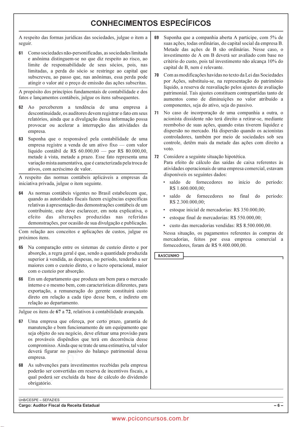pcimarkpci MDAwMDowMDAwOjAwMDA6MDAwMDowMDAwOmZmZmY6MmRlODoyNjVi:V2VkLCAwMiBOb3YgMjAyMiAxODoxNzoxNCAtMDMwMA== www.pciconcursos.com.br UnB/CESPE – SEFAZ/ES Cargo: Auditor Fiscal da Receita Estadual – 6 – CONHECIMENTOS ESPECÍFICOS A respeito das formas jurídicas das sociedades, julgue o item a seguir. �� Como sociedades não-personificadas, as sociedades limitada e anônima distinguem-se no que diz respeito ao risco, ao limite de responsabilidade de seus sócios, pois, nas limitadas, a perda do sócio se restringe ao capital que subscreveu, ao passo que, nas anônimas, essa perda pode atingir o valor até o preço de emissão das ações subscritas. A propósito dos princípios fundamentais de contabilidade e dos fatos e lançamentos contábeis, julgue os itens subsequentes. �� Ao perceberem a tendência de uma empresa à descontinuidade, os auditores devem registrar o fato em seus relatórios, ainda que a divulgação dessa informação possa provocar ou acelerar a interrupção das atividades da empresa. �� Suponha que o responsável pela contabilidade de uma empresa registre a venda de um ativo fixo — com valor líquido contábil de R$ 60.000,00 — por R$ 80.000,00, metade à vista, metade a prazo. Esse fato representa uma variação mista aumentativa, que é caracterizada pela troca de ativos, com acréscimo de valor. A respeito das normas contábeis aplicáveis a empresas da iniciativa privada, julgue o item seguinte. �� As normas contábeis vigentes no Brasil estabelecem que, quando as autoridades fiscais fazem exigências específicas relativas à apresentação das demonstrações contábeis de um contribuinte, este deve esclarecer, em nota explicativa, o efeito das alterações produzidas nas referidas demonstrações, por ocasião de sua divulgação e publicação. Com relação aos conceitos e aplicações de custos, julgue os próximos itens. �� Na comparação entre os sistemas de custeio direto e por absorção, a regra geral é que, sendo a quantidade produzida superior à vendida, as despesas, no período, tenderão a ser maiores com o custeio direto, e o lucro operacional, maior com o custeio por absorção. �� Em um departamento que produza um bem para o mercado interno e o mesmo bem, com características diferentes, para exportação, a remuneração do gerente constituirá custo direto em relação a cada tipo desse bem, e indireto em relação ao departamento. Julgue os itens de 67 a 72, relativos à contabilidade avançada. �� Uma empresa que ofereça, por certo prazo, garantia de manutenção e bom funcionamento de um equipamento que seja objeto do seu negócio, deve efetuar uma provisão para os prováveis dispêndios que terá em decorrência desse compromisso. Ainda que se trate de uma estimativa, tal valor deverá figurar no passivo do balanço patrimonial dessa empresa. �� As subvenções para investimentos recebidas pela empresa poderão ser convertidas em reserva de incentivos fiscais, a qual poderá ser excluída da base de cálculo do dividendo obrigatório. � Suponha que a companhia aberta A participe, com 5% de suas ações, todas ordinárias, do capital social da empresa B. Metade das ações de B são ordinárias. Nesse caso, o investimento de A em B deverá ser avaliado com base no critério do custo, pois tal investimento não alcança 10% do capital de B, nem é relevante. � Com as modificações havidas no texto da Lei das Sociedades por Ações, substituiu-se, na representação do patrimônio líquido, a reserva de reavaliação pelos ajustes de avaliação patrimonial. Tais ajustes constituem contrapartidas tanto de aumentos como de diminuições no valor atribuído a componentes, seja do ativo, seja do passivo. �� No caso de incorporação de uma companhia a outra, o acionista dissidente não terá direito a retirar-se, mediante reembolso de suas ações, quando estas tiverem liquidez e dispersão no mercado. Há dispersão quando os acionistas controladores, também por meio de sociedades sob seu controle, detêm mais da metade das ações com direito a voto. �� Considere a seguinte situação hipotética. Para efeito de cálculo das saídas de caixa referentes às atividades operacionais de uma empresa comercial, estavam disponíveis os seguintes dados: • saldo de fornecedores no início do período: R$ 1.600.000,00; • saldo de fornecedores no final do período: R$ 2.300.000,00; • estoque inicial de mercadorias: R$ 350.000,00; • estoque final de mercadorias: R$ 550.000,00; • custo das mercadorias vendidas: R$ 8.500.000,00. Nessa situação, os pagamentos referentes às compras de mercadorias, feitos por essa empresa comercial a fornecedores, foram de R$ 9.400.000,00. �������� wwww.pciconcursos.com.br pcimarkpci MDAwMDowMDAwOjAwMDA6MDAwMDowMDAwOmZmZmY6MmRlODoyNjVi:V2VkLCAwMiBOb3YgMjAyMiAxODoxNzoxNCAtMDMwMA== www.pciconcursos.com.br UnB/CESPE – SEFAZ/ES Cargo: Auditor Fiscal da Receita Estadual – 7 – Com base nos conceitos e aplicações da análise das demonstrações contábeis, julgue os itens seguintes. �� Suponha que, em uma análise horizontal, se tenha comparado a evolução das despesas operacionais de uma empresa com a das vendas líquidas e que os valores correspondentes ao período-base tenham sido, respectivamente, de R$ 3.000.000,00 e R$ 1.200.000,00. Se, no período seguinte, o índice das despesas aumentou o dobro da proporção das vendas, tendo alcançado R$ 1.800.000,00, então o índice das vendas, nesse período, foi correspondente a 75. �� Considerando-se que, em uma empresa, a relação entre capitais de terceiros e capitais próprios seja igual a 0,5, é correto afirmar que essa empresa é fortemente capitalizada e que sua situação financeira é cômoda. Com base nos conceitos e nas práticas de auditoria, julgue os itens a seguir. �� No exercício das funções de auditoria, o contador, desde que solicitado pela fiscalizaç