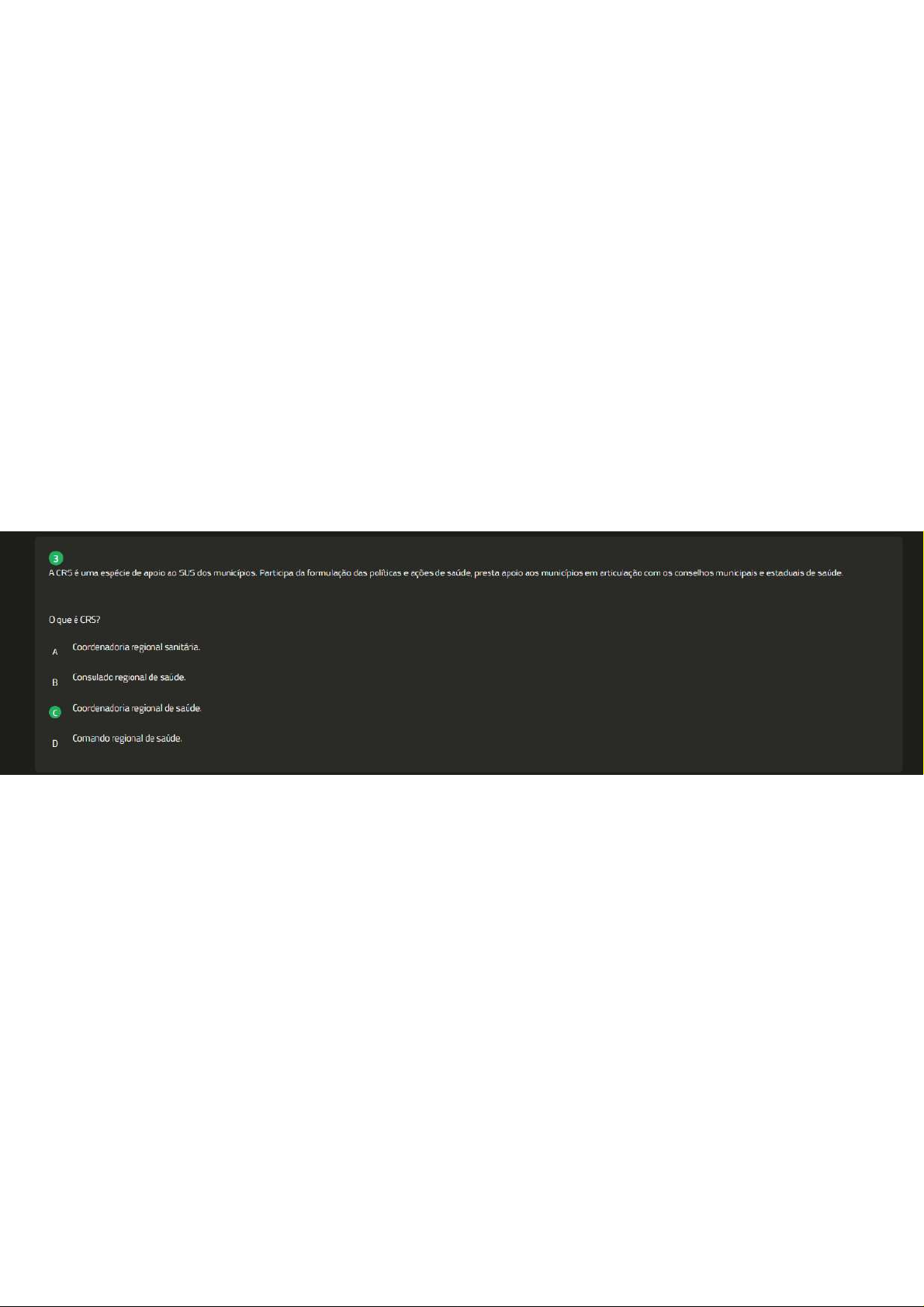 3 A CRS é uma espécie de apoio ao SUS dos Participa da formulação das políticas e ações de saúde, presta apoio aos municípios em articulação com os conselhos municipais e estaduais de saúde que CRS? A Coordenadoria regional B Consulado regional de Coordenadoria regional de saúde D Comando regional de saúde