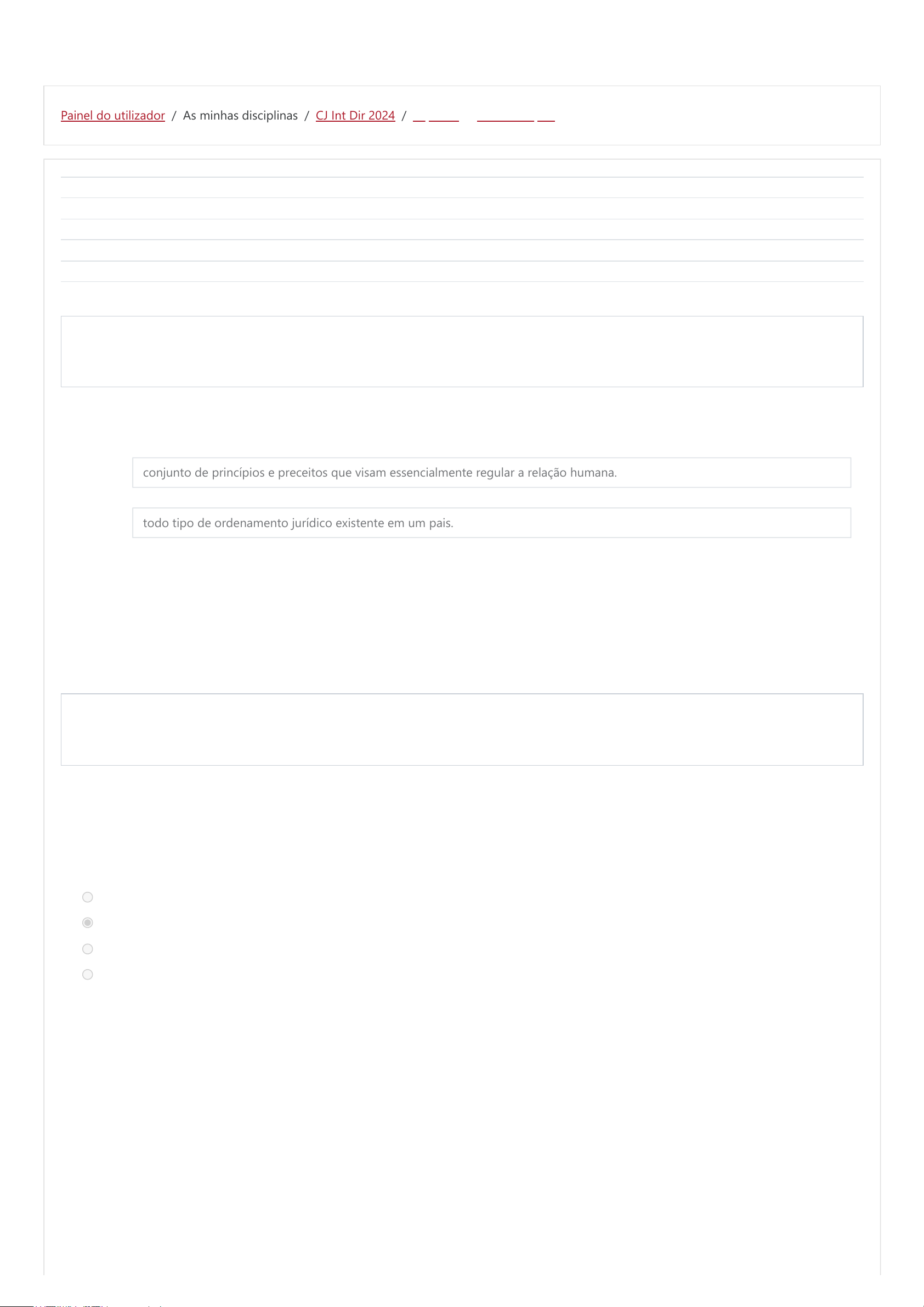 Painel do utilizador / As minhas disciplinas / CJ Int Dir 2024 / Tópico 5 / 2ª AVALIAÇÃO Iniciado em Sábado, 22 Junho 2024, 08:12 Estado Terminada Completo em Sábado, 22 Junho 2024, 10:24 Tempo gasto 2 horas 11 minutos Fora de prazo 1 hora 11 minutos Nota 12,83 num máximo de 20,00 (64%) Pergunta 1 Incorreto Nota: 0,00 em 1,00 Pergunta 2 Incorreto Nota: 0,00 em 1,00 Faça a correspondência entre elas: Norma jurídica Odem jurídica conjunto de princípios e preceitos que visam essencialmente regular a relação humana. todo tipo de ordenamento jurídico existente em um pais. A sua resposta está incorreta. A resposta correcta é: Norma jurídica → todo tipo de ordenamento jurídico existente em um pais., Odem jurídica → conjunto de princípios e preceitos que visam essencialmente regular a relação humana. Quais são as características das ordens jurídicas? Selecione uma opção de resposta: a. Generalidade, imperatividade e previsão b. Abstração, previsão, generalidade e coercibilidade Abstração, previsão, generalidade e coercibilidade c. Necessidade, sanção, exterioridade, imperatividade, coercibilidade e alteridade d. Genialidade, imperatividade, previsão e coercibilidade A sua resposta está incorreta. A resposta correta é: Necessidade, sanção, exterioridade, imperatividade, coercibilidade e alteridade 6/28/24, 12:52 AM 2ª AVALIAÇÃO esa.ac.mz/Elearning/mod/quiz/review.php?attempt=7359&cmid=18853&showall=0 1/4 http://esa.ac.mz/Elearning/my/ http://esa.ac.mz/Elearning/course/view.php?id=1849 http://esa.ac.mz/Elearning/course/view.php?id=1849#section-5 http://esa.ac.mz/Elearning/mod/quiz/view.php?id=18853 Pergunta 3 Correto Nota: 1,00 em 1,00 Pergunta 4 Incorreto Nota: 0,00 em 1,00 Pergunta 5 Incorreto Nota: 0,00 em 1,00 O direito romano é o complexo de normas e princípios jurídicos vigentes em Roma, desde a sua fundação lendária, no século Selecione uma opção de resposta: a. VI a.C b. III a.C. c. VIII d.C d. VIII a.C VIII a.C A sua resposta está correta. A resposta correta é: VIII a.C O Código Civil moçambicano exclui o costume como fonte imediata de direito e nem sequer o reconhece como meio de integração das lacunas da lei. Selecione uma: Verdadeiro Falso A resposta correta é 'Verdadeiro' A vigência, interpretação e aplicação das leis constam do: Selecione uma opção de resposta: a. CAPÍTULO III DO CÓDIGO CIVIL CAPÍTULO III DO CÓDIGO CIVIL b. CAPÍTULO II DO CÓDIGO CIVIL c. CAPÍTULO I DO CÓDIGO CIVIL d. CAPÍTULO V DO CÓDIGO CIVIL A sua resposta está incorreta. A resposta correta é: CAPÍTULO II DO CÓDIGO CIVIL 6/28/24, 12:52 AM 2ª AVALIAÇÃO esa.ac.mz/Elearning/mod/quiz/review.php?attempt=7359&cmid=18853&showall=0 2/4 Pergunta 6 Correto Nota: 1,00 em 1,00 Pergunta 7 Correto Nota: 1,00 em 1,00 Pergunta 8 Correto Nota: 1,00 em 1,00 O artigo 1º do Código Civil acolhe a Jurisprudência como a única fonte imediata do Direito. Selecione uma: Verdadeiro Falso A resposta correta é 'Falso' A ignorância ou má interpretação da lei justifica a falta do seu cumprimento Selecione uma: Verdadeiro Falso A resposta correta é 'Falso' Faça a correspondência Previsão Sanção Estatuição é a representação futura do evento ou situação da Vida. é a parte da norma onde se estabelece a consequência imposta pela ordem jurídica pela violação da mesma norma. é o estabelecimento, como consequência da necessidade de uma conduta. A sua resposta está correta. A resposta correcta é: Previsão → é a representação futura do evento ou situação da Vida., Sanção → é a parte da norma onde se estabelece a consequência imposta pela ordem jurídica pela violação da mesma norma., Estatuição → é o estabelecimento, como consequência da necessidade de uma conduta. 6/28/24, 12:52 AM 2ª AVALIAÇÃO esa.ac.mz/Elearning/mod/quiz/review.php?attempt=7359&cmid=18853&showall=0 3/4 Pergunta 9 Correto Nota: 1,00 em 1,00 Pergunta 10 Correto Nota: 1,00 em 1,00 O Direito é o ramo da ciência que estuda as regras gerais, abstractas e imperativas do relacionamento social, não criadas pelo Estado. Selecione uma: Verdadeiro Falso A resposta correta é 'Falso' Numa palavra, o Direito Positivo, é o direito que depende da vontade humana, enquanto o Direito Natural, é o que independe do acto de vontade, por reflectir exigências sociais da natureza humana, comuns a todos os homens. Selecione uma: Verdadeiro Falso A resposta correta é 'Verdadeiro' ◄ AULA 3 TEORIA GERAL DA RELAÇÃO JURÍDICA Ir para... 6/28/24, 12:52 AM 2ª AVALIAÇÃO esa.ac.mz/Elearning/mod/quiz/review.php?attempt=7359&cmid=18853&showall=0 4/4 http://esa.ac.mz/Elearning/mod/resource/view.php?id=18843&forceview=1