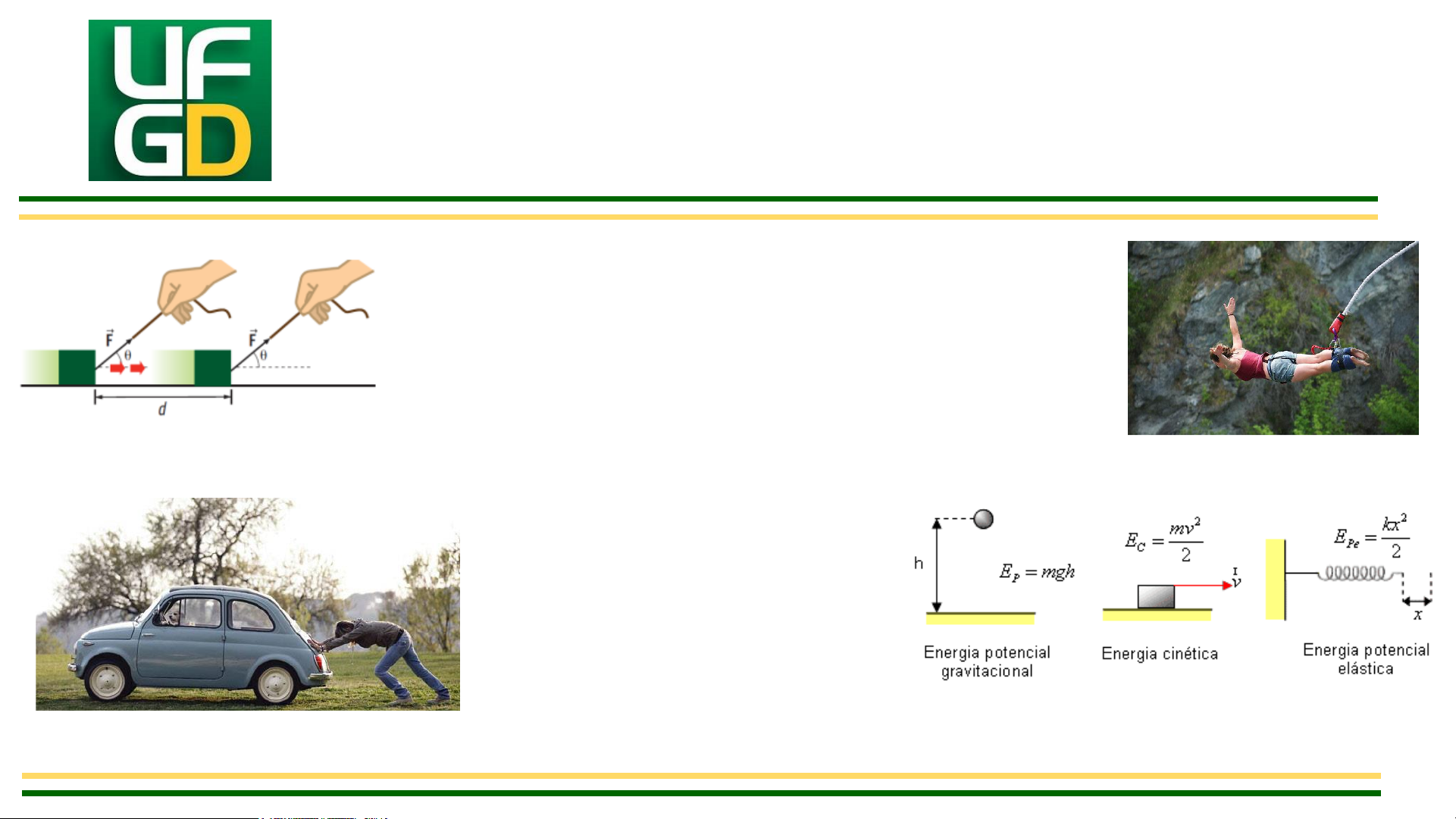 Trabalho, Energia e Conservação da Energia Profa. Maryleide Ventura e-mail: maryleide.ventura@gmail.com UNIVERSIDADE FEDERAL DA GRANDE DOURADOS Fundamentos de Física Conceitos Importantes o Força: o Energia cinética (K): 𝐹𝑔 = 𝑚𝑔o Força peso (P) – Força gravitacional (Fg): Em uma dimensão (x): 𝑃 = 𝐹𝑔 (solo como referencial inercial). 𝑃 = 𝑚𝑔 o Derivada e Integral 𝐾 = 1 2 𝑚𝑣2 No SI: [J] = Joule O que é Energia ? ➢ O termo energia é tão amplo que é difícil pensar em uma definição concisa. ➢ Tecnicamente, a energia é uma grandeza escalar associada ao ESTADO (movimento, parado ...) de um ou mais objetos. ➢ Energia é um número que associamos a um sistema de um ou mais objetos. ➢Se uma força muda um dos objetos, fazendo-o entrar em movimento, por exemplo, o número que descreve a energia do sistema varia. ➢Com isso, observamos que a energia pode ser transformada de uma forma para outra e transferida de um objeto para o outro, mas a quantidade total é sempre a mesma – Energia é conservada ! ➢ Na física, energia é uma quantidade usualmente associada à capacidade de um sistema físico de realizar trabalho sobre outro. ➢ Se apresenta sob diversas formas: o mecânica, térmica, química, elétrica, magnética, etc. O que é Energia ? Trabalho ➢ O trabalho devido a uma força constante, na condição acima (direção e sentido do deslocamento retilíneo) é: (1) ➢ Vamos definir conceitos importantíssimos para a Física, e para ciência de um modo geral: No SI, [J] = Joule 𝑊 = 𝐹∆𝑥 Em que: o 𝐹→ Força (N); o ∆𝑥→Variação da posição - deslocamento (m) 1 𝐽 = 1 𝑁 ∙ 𝑚 ➢ Vamos analisar com mais detalhes a definição de trabalho. (2) ➢Somente a componente || é capaz de realizar trabalho, logo: Componente perpendicular Componente paralela 𝑊 = 𝐹∆𝑥𝑐𝑜𝑠𝜙 A Equação (2) possui a forma de um produto escalar entre dois vetores, podendo escrever: O trabalho realizado por uma força constante que forma um ângulo em relação ao deslocamento: 𝑊 = Ԧ𝐹 ∙ ∆ Ԧ𝑥 (3) Trabalho ➢ O que podemos concluir com relação as forças aplicadas nas figuras abaixo? 𝜙 0 Trabalho é positivo𝑊 > 0 Trabalho – Positivo, negativo e nulo 𝜙 > 90°(𝑎𝑡é 180°) 𝑐𝑜𝑠𝜙comprimida de 5,0 cm (Figura abaixo). Encontre (a) o trabalho realizado sobre o bloco pela mola enquanto o bloco se move de 𝑥 = 𝑥1 = −5,0 𝑐𝑚 até sua posição de equilíbrio 𝑥 = 𝑥2 = 0,0 𝑐𝑚, e (b) a velocidade do bloco em 𝑥2 = 0,0 𝑐𝑚. (a) 𝑊 = 1 2 𝑘𝑥𝑖 2 − 1 2 𝑘𝑥𝑓 2 𝑊 = 0,50 𝐽 (b) 𝑊 = 1 2 𝑚𝑣2 2 − 1 2 𝑚𝑣1 2 𝑣2 2 = 𝑣1 2 + 2𝑊 𝑚 𝑣2 2 = 0 + 2(0,50) 4,0 𝑣2 = 0,50 𝑚/𝑠 5) Em uma tela de televisão, os elétrons são acelerados por um canhão eletrônico. A força que acelera o elétron é uma força elétrica produzida pelo campo elétrico dentro do canhão. Um elétron é acelerado a partir do repouso por um canhão eletrônico até atingir a energia cinética de 2,5 KeV, em uma distância de 2,5 cm. Encontre a força sobre o elétron, supondo-a constante e com a mesma orientação do movimento do elétron. Lembrando: 1 𝑒𝑉 = 1,6 𝑥 10−19 𝐽. 𝑊 = ∆𝐾 𝐹𝑥∆𝑥 = 𝐾𝑓 − 𝐾𝑖 𝐹𝑥 = 𝐾𝑓 − 𝐾𝑖 ∆𝑥 𝐹𝑥 = 1,6 𝑥 10−14 N∆𝑥 Ƹ𝑖 Ԧ𝐹 𝑣𝑖 = 0 𝑣𝑓 Exercícios ➢ * Considere a seguinte situação: Um tomate de massa m é arremessado para cima com velocidade inicial 𝑣0, tendo uma energia cinética inicial, 𝐾𝑖 = 1 2 𝑚𝑣0 2. Na subida, o tomate é desacelerado por uma força gravitacional Ԧ𝐹𝑔 , ou seja, a energia cinética do tomate diminui, pois a Ԧ𝐹𝑔 realiza trabalho sobre o tomate durante a subida. ➢ Tomate tratado como partícula → temos: 𝑊 = 𝐹𝑑𝑐𝑜𝑠𝜙→ trabalho realizado durante um deslocamento Ԧ𝑑 . Assim, o trabalho 𝑊𝑔 realizado pela força gravitacional Ԧ𝐹𝑔 é: 𝑊𝑔 = 𝑚𝑔𝑑𝑐𝑜𝑠𝜙 (Trabalho executado por uma força gravitacional)(20) Trabalho Realizado pela Força Gravitacional ➢Na subida → Ԧ𝐹𝑔 sentido contrário ao deslocamento Ԧ𝑑: 𝑊𝑔 = 𝑚𝑔𝑑𝑐𝑜𝑠180° = 𝑚𝑔𝑑 −1 = −𝑚𝑔𝑑 ➢ Depois que o objeto atinge a altura máxima e começa a descer, o ângulo 𝜙 entre a força Ԧ𝐹𝑔 e o deslocamento Ԧ𝑑 é zero. Assim: 𝑊𝑔 = 𝑚𝑔𝑑𝑐𝑜𝑠0° = 𝑚𝑔𝑑 +1 = +𝑚𝑔𝑑 ➢O sinal positivo (+) significa que a força gravitacional transfere uma energia 𝑚𝑔𝑑 para a energia cinética do objeto. Isto está de acordo com o fato do objeto ganhar velocidade na descida. ➢O sinal negativo (−) indica que, durante a subida, a força gravitacional remove uma energia 𝑚𝑔𝑑 da energia cinética do objeto. Isto está de acordo com o fato do objeto perder velocidade na subida. (21) (22) Trabalho Realizado pela Força Gravitacional Trabalho e Energia Potencial (U) ➢ Voltemos ao exemplo do tomate - arremessado para cima. Já sabemos que, enquanto o tomate está subindo, o trabalho Wg realizado pela força gravitacional sobre o tomate é negativo, porque a força extrai energia da energia cinética do tomate. ➢ Podemos concluir que, esta energia é transferida pela força gravitacional da energia cinética do tomate para a energia potencial gravitacional do sistema tomate – Terra. ➢ O tomate perde velocidade, para e começa a cair de volta, devido a força gravitacional. ➢ Energia potencial (U): Qualquer energia associada a sistemas de corpos exercendo forças uns sobre os outros; ➢ A energia potencial está sempre relacionada a transformação de energia. Enquanto sobe, a Ԧ𝐹𝑔 realiza um trabalho negativo sobre o tomate – diminuindo sua energia cinética ( 𝐾 ). Quando desce, a Ԧ𝐹𝑔 realiza trabalho positivo – aumentando 𝐾. 