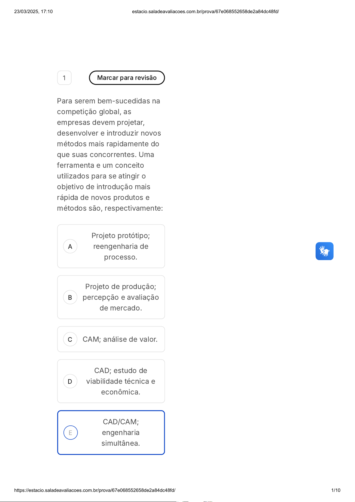 A B C D E 1 Marcar para revisão Para serem bem-sucedidas na competição global, as empresas devem projetar, desenvolver e introduzir novos métodos mais rapidamente do que suas concorrentes. Uma ferramenta e um conceito utilizados para se atingir o objetivo de introdução mais rápida de novos produtos e métodos são, respectivamente: Projeto protótipo; reengenharia de processo. Projeto de produção; percepção e avaliação de mercado. CAM; análise de valor. CAD; estudo de viabilidade técnica e econômica. CAD/CAM; engenharia simultânea. 23/03/2025, 17:10 estacio.saladeavaliacoes.com.br/prova/67e068552658de2a84dc48fd/ https://estacio.saladeavaliacoes.com.br/prova/67e068552658de2a84dc48fd/ 1/10 A B C D E 2 Marcar para revisão Uma empresa montava 6.400 peças/dia com a utilização de 542 empregados trabalhando 10 horas/dia. Após o estudo do método e implantação de melhorias no processo produtivo, passou a montar 7.680 peças/dia com a utilização de 372 empregados durante as mesmas 10 horas. Qual foi o aumento da produtividade da mão de obra? 50,32% 74,85% 61,47% 80,05% 90,47% 3 Marcar para revisão A representação visual de um processo utilizado por diversas organizações, cuja finalidade é pôr em evidência a origem, o processamento e o destino das 23/03/2025, 17:10 estacio.saladeavaliacoes.com.br/prova/67e068552658de2a84dc48fd/ https://estacio.saladeavaliacoes.com.br/prova/67e068552658de2a84dc48fd/ 2/10 A B C D E informações num fluxo normal do processo de trabalho, é o diagrama de dispersão organograma fluxograma pictograma histograma 4 Marcar para revisão (Eletrobras / 2009) Os métodos e tempo necessário para desenvolver novos produtos/serviços, a faixa de produtos ou serviços, o tempo de mudança de máquina, o tamanho médio do lote, o tempo para aumentar a taxa de atividade, as capacidades média e máxima e o tempo para mudar a programação, são medidas de performance de que objetivo de desempenho da produção? 23/03/2025, 17:10 estacio.saladeavaliacoes.com.br/prova/67e068552658de2a84dc48fd/ https://estacio.saladeavaliacoes.com.br/prova/67e068552658de2a84dc48fd/ 3/10 A B C D E A B C Qualidade Velocidade Flexibilidade Confiabilidade Custo 5 Marcar para revisão Dado o Simograma abaixo, determine a produção máxima realizável em um turno de 7 horas efetivas de trabalho. 280 pçs por turno 440pçs por turno 560 pçs por turno 23/03/2025, 17:10 estacio.saladeavaliacoes.com.br/prova/67e068552658de2a84dc48fd/ https://estacio.saladeavaliacoes.com.br/prova/67e068552658de2a84dc48fd/ 4/10 D E A B C D E 960pçs por turno 1120 pçs por turno 6 Marcar para revisão Uma fábrica de geladeiras deve produzir diariamente 800 geladeiras em 6 horas de trabalho. O Tempo de Ciclo (TC) a ser considerado para fins de dimensionamento de linhas é de: 0,45 min/un 0,60 min/un 0,30 min/un 1,00 min/un 0,15 min/un 7 Marcar para revisão Observe as alternativas a seguir, com relação ao dimensionamento de recursos 23/03/2025, 17:10 estacio.saladeavaliacoes.com.br/prova/67e068552658de2a84dc48fd/ https://estacio.saladeavaliacoes.com.br/prova/67e068552658de2a84dc48fd/ 5/10 A B C D E necessários à produção de bens e serviços: I. Para o dimensionamento de recursos, é importante que seja definida a demanda e mix de produtos/serviços a serem produzidos em um determinado intervalo de tempo. II. Para o dimensionamento de recursos deve-se avaliar o grau de polivalência de mão de obra III. Para o dimensionamento de recursos, deve-se conhecer os roteiros de produção de cada um dos bens e serviços a serem produzidos bem como os seus Tempos Padrões para a produção de cada unidade. Está correto o que se afirma em: I, II e III II e III I e II I e III I, somente 23/03/2025, 17:10 estacio.saladeavaliacoes.com.br/prova/67e068552658de2a84dc48fd/ https://estacio.saladeavaliacoes.com.br/prova/67e068552658de2a84dc48fd/ 6/10 A B C 8 Marcar para revisão A ABC Wine Company esmaga uvas para serem utilizadas na vinificação. A empresa solicitou a determinação do custo do produto por litro para cada estágio de fabricação. Temos as seguintes informações: Estágios de Fabricação Esmagamento Embalagem Despesas Outros dados Uvas compradas: $ 100.000 Manutenção da prensa de uva: $ 25.000 Materiais de embalagem: $ 75.000 Mão de obra do empacotador: $ 50.000 Unidades produzidas: 50.000 litros Considerando as informações fornecidas, o custo unitário do produto será igual a $ 5,00 $ 2,50 $ 3,50 23/03/2025, 17:10 estacio.saladeavaliacoes.com.br/prova/67e068552658de2a84dc48fd/ https://estacio.saladeavaliacoes.com.br/prova/67e068552658de2a84dc48fd/ 7/10 D E A B C $ 3,00 $ 4,50 9 Marcar para revisão O departamento de mistura da Soap Production Company mostra as seguintes informações para as 1.000 unidades de produto restantes em trabalho em processo no final do período. Suponha que não houve inventário inicial. Materiais diretos 90% completos Mão de obra direta 30% concluída Sobrecarga 60% concluída As unidades equivalentes para cada um dos três custos do produto - materiais diretos, mão de obra direta e despesas gerais serão respectivamente iguais a: 1000, 300 e 600 1000, 400 e 600 900, 300 e 600 23/03/2025, 17:10 estacio.saladeavaliacoes.com.br/prova/67e068552658de2a84dc48fd/ https://estacio.saladeavaliacoes.com.br/prova/67e068552658de2a84dc48fd/ 8/10 D E 900, 600 e 300 900, 1000 e 600 10 Marcar para revisão Uma empresa tem um operador controlando 3 fresadoras automáticas. Os tempos de operação são: carregando a máquina = 2 minutos, operação de fresar = 4 minutos e descarregar a máquina = 1 minuto. O gráfico homem-hora dos primeiros 10 minutos de operação é apresentado a seguir: Nestes 10 minutos de operação, podemos afirmar que: 00 hora : 40 min : 11 seg Ocultar Questão 10 de 10 Respondidas (10) Em branco (0) Finalizar prova 1 2 3 4 5 6 7 8 9 10 SM2 Engenharia De Métodos 23/03/2025, 17:10 estacio.saladeavaliacoes.com.br/prova/67e068552658de2a84dc4