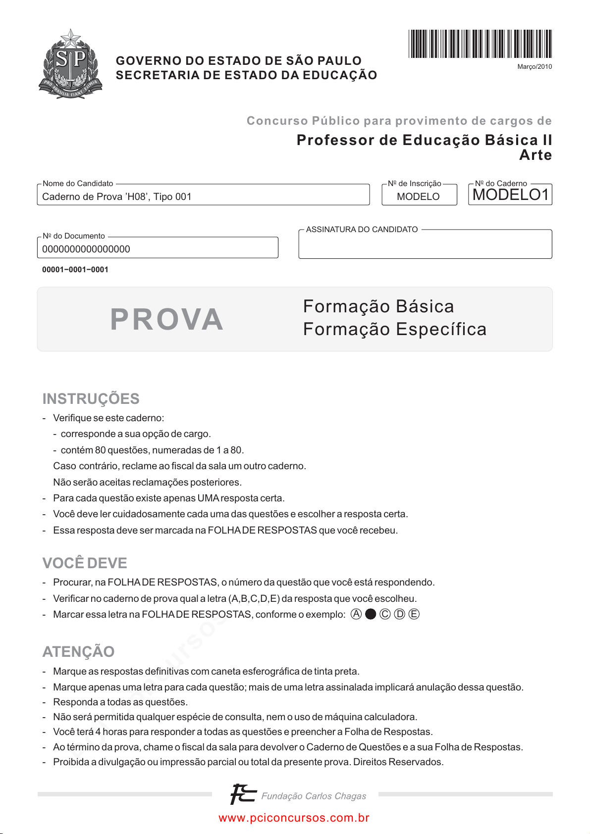 pcimarkpci MDAwMDowMDAwOjAwMDA6MDAwMDowMDAwOmZmZmY6MmQ4YzpjMWIx:U3VuLCAyMyBNYXIgMjAyNSAxODo0Nzo0OSAtMDMwMA== www.pciconcursos.com.br N do CadernooN de Inscriçãoo ASSINATURA DO CANDIDATO N do Documentoo Nome do Candidato Professor de Educação Básica II Arte A C D E INSTRUÇÕES VOCÊ DEVE ATENÇÃO - Verifique se este caderno: - corresponde a sua opção de cargo. - contém 80 questões, numeradas de 1 a 80. Caso contrário, reclame ao fiscal da sala um outro caderno. Não serão aceitas reclamações posteriores. - Para cada questão existe apenas UMAresposta certa. - Você deve ler cuidadosamente cada uma das questões e escolher a resposta certa. - Essa resposta deve ser marcada na FOLHADE RESPOSTAS que você recebeu. - Procurar, na FOLHADE RESPOSTAS, o número da questão que você está respondendo. - Verificar no caderno de prova qual a letra (A,B,C,D,E) da resposta que você escolheu. - Marcar essa letra na FOLHADE RESPOSTAS, conforme o exemplo: - Marque as respostas definitivas com caneta esferográfica de tinta preta. - Marque apenas uma letra para cada questão; mais de uma letra assinalada implicará anulação dessa questão. - Responda a todas as questões. - Não será permitida qualquer espécie de consulta, nem o uso de máquina calculadora. - Você terá 4 horas para responder a todas as questões e preencher a Folha de Respostas. - Ao término da prova, chame o fiscal da sala para devolver o Caderno de Questões e a sua Folha de Respostas. - Proibida a divulgação ou impressão parcial ou total da presente prova. Direitos Reservados. Concurso Público para provimento de cargos de Março/2010 GOVERNO DO ESTADO DE SÃO PAULO SECRETARIA DE ESTADO DA EDUCAÇÃO Formação Básica Formação EspecíficaPROVA Caderno de Prova ’H08’, Tipo 001 MODELO 0000000000000000 MODELO1 00001−0001−0001 www.pciconcursos.com.br pcimarkpci MDAwMDowMDAwOjAwMDA6MDAwMDowMDAwOmZmZmY6MmQ4YzpjMWIx:U3VuLCAyMyBNYXIgMjAyNSAxODo0Nzo0OSAtMDMwMA== www.pciconcursos.com.br 2 SEDSP-Formação Básica2 FORMAÇÃO BÁSICA 1. Para José Contreras, embora não se possa falar de unanimidade entre os autores que defendem a tese da proletarização de professores, essa posição baseia-se na consideração de que os docentes, enquanto categoria, (A) sofreram ou estão sofrendo uma transformação, tanto nas características de suas condições de trabalho como nas tarefas que realizam, que os aproxima cada vez mais das condições e interesses da classe operária. (B) perderam seu poder aquisitivo ao longo dos últimos quinze anos e por isso ficaram desestimulados, passando a se descompromissarem com o trabalho docente voltado aos alunos. (C) sofreram perda progressiva de uma série de qualidades, dada a formação insuficiente apresentada pelo ensino superior, resultando na falta de competência técnica e no descompromisso para desenvolver um ensino de qualidade. (D) perderam o status profissional observado até os anos de 1970, tornando-se meros reprodutores de um saber organizado pelos livros didáticos, numa forma padronizada de trabalho como os operários de uma fábrica. (E) perderam a esperança na área da educação, na medida em que os pais não se importam mais com a educação de seus filhos e a própria população não reconhece mais o ofício de mestre. 2. Segundo Álvaro Chrispino, um exemplo claro da dificuldade de se lidar com o conflito é a incapacidade de identificar as cir- cunstâncias que dele derivam ou que nele redundam. Em geral, nas escolas e na vida, só se percebe o conflito quando ele produz manifestações violentas. Daí, conclui-se que I. se o conflito se manifestou de forma violenta é porque já existia anteriormente uma divergência ou antagonismo, que não se soube identificar ou não se foi preparado para isso. II. toda vez que o conflito se manifesta, a ação é no sentido de resolvê-lo, coibindo-se a manifestação violenta, esquecendo- se do fato de que problemas mal resolvidos se repetem. III. o índice de casos de discriminação e preconceito é tão alto por parte dos alunos na escola que o professor tornou-se insensível e, em consequência, omisso a essas situações. Está correto o que se afirma em (A) I, apenas. (B) I e II, apenas. (C) I, II e III. (D) II, apenas. (E) II e III, apenas. 3. As minorias religiosas, lingüísticas e nacionais, tal como as populações autóctones e tribais, foram muitas vezes subordinadas, por vezes à força e contra vontade, aos interesses do Estado e da sociedade dominante. Segundo Rodolfo Stavenhagen, uma educação realmente pluralista baseia-se (A) em um conjunto de princípios de inclusão cultural, que exige que todas as culturas sejam conhecidas na escola, numa escala de prioridades pelo número dos que a praticam. (B) no conceito internacional multiétnico, em que todos possam conviver harmonicamente por meio de uma cultura igual a todos. (C) numa estratégia política de integração entre as várias culturas existentes em um país, com o objetivo de não excluir nenhuma comunidade. (D) no multiculturalismo étnico, ou seja, na conservação de um núcleo de valores comuns a todas as sociedades. (E) numa filosofia humanista, isto é, numa ética que encara numa perspectiva positiva as conseqüências sociais do pluralismo cultural. 4. Segundo Antoni Zabala, quando vamos ao médico, não tentamos lhe esconder os sintomas nem os resultados do tratamento, porque consideramos que seus objetivos são os mesmos que os nossos, que ele quer nos ajudar. Infelizmente, esta não é a imagem que muitos de nossos alunos têm de nós professores. O texto trata da importância de se (A) dividir as tarefas durante o processo de ensino aprendizagem, entre os professores, os alunos e a comunidade. (B) determinar os objetivos das disciplinas no projeto político-pedagógico da escola que levem ao pensamento crítico. (C) construir propostas objetivas que todo professor se comprometa a realizar. (D) compartilhar objetivos, cond