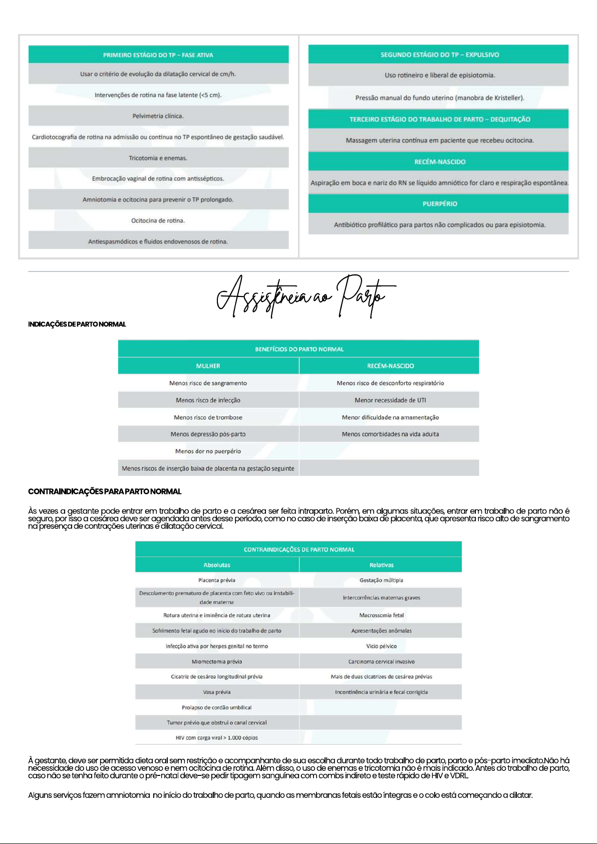 PRIMEIRO ESTÁGIO DO TP FASE ATIVA SEGUNDO ESTÁGIO DO TP EXPULSIVO Usar o critério de evolução da dilatação cervical de cm/h. Uso rotineiro e liberal de episiotomia. Intervenções de rotina na fase latente ( 1.000 cópias À gestante, deve ser permitida dieta oral sem restrição e acompanhante de sua escolha durante todo trabalho de parto, parto e pós-parto imediato.Não há necessidade do uso de acesso venoso e nem de rotina. Além disso, o uso de enemas e tricotomia não é mais indicado. Antes do trabalho de parto, caso não se tenho feito durante pré-nata deve-se pedir tipagem sanguínea com combs indireto e teste rápido de HIV e VDRL Alguns serviços fazem amniotomia no início do trabalho de parto, quando as fetais estão e o colo está começando aA presença de grumos de vérnix caseoso na amnioscopia indica idade gestacional acima de 38 semanas. A coloração entre amarela e esverdeada indica a presença de e deve-se investigar sofrimento fetal. Pode Sangramento do colo uterino, rotura artificial de fetais e, mais trauma fetal. registro da evolução do trabalho de parto e dos batimentos cardíacos fetais são obrigatórios e devem ser colocados no partograma. Manobra de Mauriceau a alternativa A: a manobra de Mauriceau é utilizada para ajudar desprendimento do polo cefálico no parto A manobra consiste apolar feto sobre o antebraço do obstetra que introduz os dedos e indicador na boca do feto e puxa, fletindo o polo No quarto período há miotamponamento, e depois a indiferenca uterina, contraindo e relaxando podendo haver período de sangramento. Depois de uma hora da dequitação há contração uterina fixa. ideal é o tônus uterino, a frequência cardíaca e a pressão materna a cada 15 minutos. Somente após uma a pode ser encaminhada ao alojamento Rubra Fusca Flava Alba No pós-parto, a mulher geralmente apresenta leucocitose, queda dos níveis de hemoglobina e aumento do plasmático, por isso a puérpera encontra-se em um estado de hipercoagulação e os riscos de eventos são maiores nessa fase. COMPLICAÇÕES ASSOCIADAS AO PARTO NORMAL CEFÁLICO 1. PROLAPSO DE CORDÃO Considera-se prolapso de cordão quando o cordão umbilical está à frente da apresentação e as estão Quando as estão a situação chamada de procidência ou procúbito de cordão umbilical. É uma complicação rara, mas com alta mortalidade A prevenção se baseia na identificação das pacientes com maior risco para a ocorrência desse evento não cefálicas, gestações múltiplas, prematuridade e amniotomia, amnioinfusão e aplicação de fórcipes. Como se manifesta? Desacelerações variáveis repetidas ou No exame de toque nota-se o cordão à frente da apresentação. Qual a conduta? Cesárea de emergência, mantendo o toque vaginal com elevação da apresentação para evitar que a apresentação fetal promova a compressão do cordão umbilical. Até a cirurgia, deve-se manter a paciente em 4 apoios, com subida da apresentação fetal pelo toque vaginal. -> Na presença de procidência ou procúbito de cordão umbilical, também está indicada a cesárea. DISTOCIA DE BIACROMIAL Também chamada de distocia de ombro, ocorre no período expulsivo do parto cefálico, quando o polo cefálico já se desprendeu, mas os ombros não se risco aumenta quando o feto apresenta peso maior que 4,5 kg e diabetes materna, pós-datismo, macrossomia, anomalias anatômicas da pelve materna. A maioria ocorre em fetos normais e sem previsão Durante o parto tem maior chance de ocorrer se o período expulsivo for prolongado e se houver parto vaginal operatório. A distocia de ombro é definida quando há impactação do ombro anterior contra a sínfise púbica materna após a exteriorização do polo cefálico. Ocorre quando o diâmetro biacromial excede o diâmetro pélvico e o intervalo de tempo entre a saída da cabeça e do restante do corpo é maior ou igual a60 segundos ou forem necessárias manobras para ultimação do parto. Para a mulher, pode ocasion an lacerações do canal de parto, atonia rotura uterina e disjunção da sínfise púbica. No feto, pode ocorrer lesão de plexo braquial, fratura de clavícula e úmero, fetal, óbito e neonatal. i Um sinal clínico importante de distocia de ombro é quando a cabeça fetal, após o desprendimento, é puxada de volta contra o períneo, chamado sinal da tartaruga. Diante disso, não se deve aplicar força excessiva na cabeça e nem sobre o fundo uterino. Conduta: Manobra de McRoberts Rubin Possibilidade de Retirada do braço posterior (manobra de Jacquemier) Manobras internas a posição da paciente: Gaskin (PROVA!) Obs: Tempo gasto em cada manobra deve ser no máximo de 60 segundos, com o objetivo de aumentar o tamanho da pelve, diminuir diâmetro biacromial alterar a relação do diametro biacromial com a pelve óssea. MANOBRA DE MCROBERTS Refere-se a flexão da perna da mulher com o posicionamento das coxas sobre o abdome, simulando cócoras. Isso aumenta o diâmetro de saída da pelve e ajuda a fletin a coluna fetal, empurrando o ombro posterior sobre o promontório. MANOBRA DE RUIBIN É a pressão suprapúbica que deve ser colocada sobre o ombro anterior para que ele consiga passar sobre a sínfise púbica Essas são as duas primeiras manobras usadas em casos de distocia de ombro, 1 Manobra de McRobert's Maneuver (hiperflexão das pernas) 2 Manobra de Rubin (Pressão suprapubica) 2 MANOBRA DE JACQUEMIER Consiste na retirada do braço posterior fetal do canal de parto. Isso permite que o ombro anterior liberando a impactação. Para retirar o braço posterior, o médico deve introduzir a mão na vagina e localizar o braço posterior, o cotovelo deve ser fletido para que o braço seja liberado ou retirar primeiro a mão, com isso o restante do braço sai de forma correta. MANOBRAS INTERNAS Possuem o objetivo de girar o ombro anterior em plano oblíquo e sob a sínfise púbica. 1. Manobra de Rubin consiste em empurrar o ombro anterior do fet