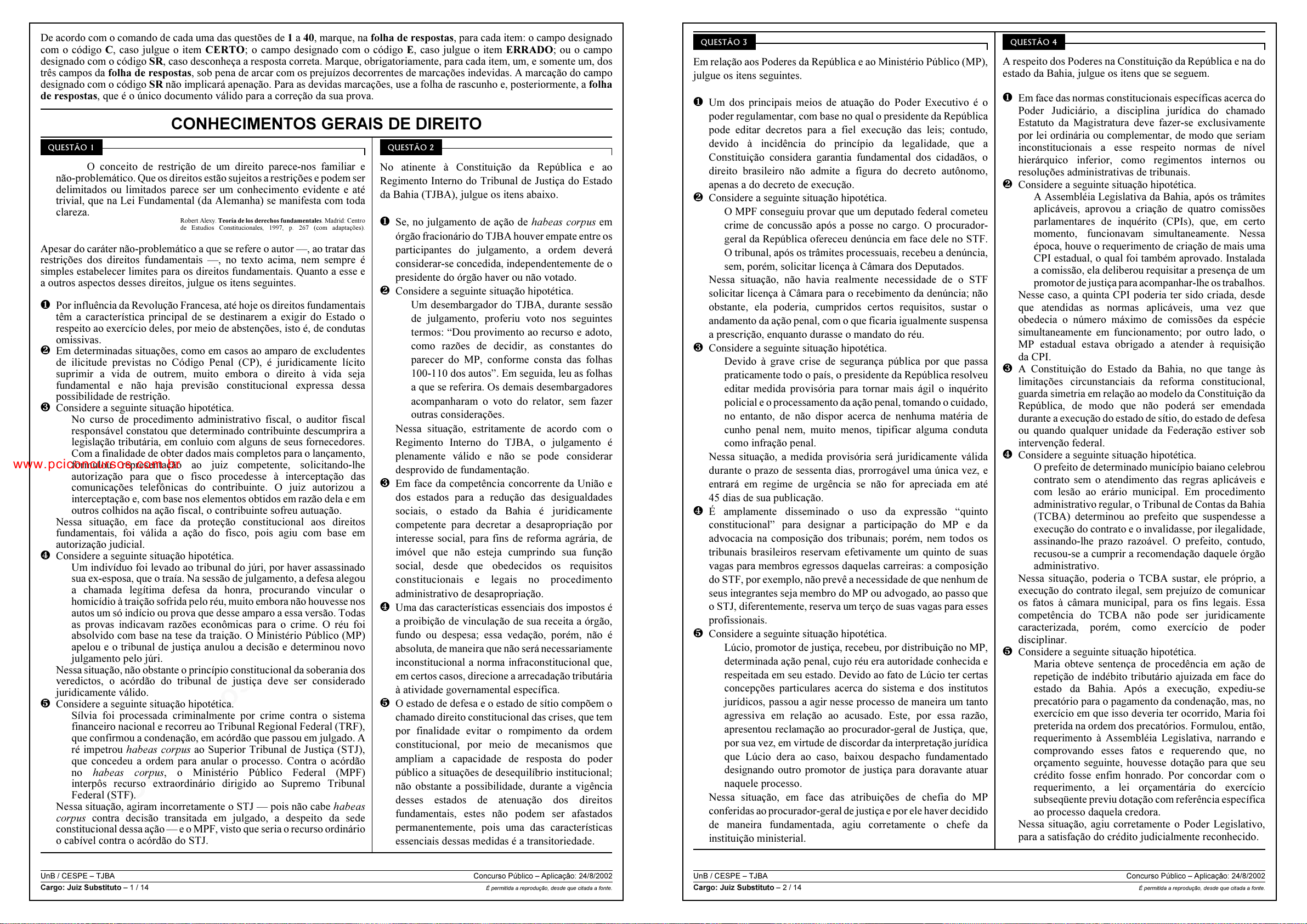 pcimarkpci MDAwMDowMDAwOjAwMDA6MDAwMDowMDAwOmZmZmY6MmQ4YzpjMWIx:U3VuLCAyMyBNYXIgMjAyNSAxODoxMDo1MyAtMDMwMA== www.pciconcursos.com.br UnB / CESPE – TJBA Concurso Público – Aplicação: 24/8/2002 Cargo: Juiz Substituto – 1 / 14 É permitida a reprodução, desde que citada a fonte. De acordo com o comando de cada uma das questões de 1 a 40, marque, na folha de respostas, para cada item: o campo designado com o código C, caso julgue o item CERTO; o campo designado com o código E, caso julgue o item ERRADO; ou o campo designado com o código SR, caso desconheça a resposta correta. Marque, obrigatoriamente, para cada item, um, e somente um, dos três campos da folha de respostas, sob pena de arcar com os prejuízos decorrentes de marcações indevidas. A marcação do campo designado com o código SR não implicará apenação. Para as devidas marcações, use a folha de rascunho e, posteriormente, a folha de respostas, que é o único documento válido para a correção da sua prova. CONHECIMENTOS GERAIS DE DIREITO QUESTÃO 1 O conceito de restrição de um direito parece-nos familiar e não-problemático. Que os direitos estão sujeitos a restrições e podem ser delimitados ou limitados parece ser um conhecimento evidente e até trivial, que na Lei Fundamental (da Alemanha) se manifesta com toda clareza. Robert Alexy. Teoría de los derechos fundamentales. Madrid: Centro de Estudios Constitucionales, 1997, p. 267 (com adaptações). Apesar do caráter não-problemático a que se refere o autor —, ao tratar das restrições dos direitos fundamentais —, no texto acima, nem sempre é simples estabelecer limites para os direitos fundamentais. Quanto a esse e a outros aspectos desses direitos, julgue os itens seguintes. Ø Por influência da Revolução Francesa, até hoje os direitos fundamentais têm a característica principal de se destinarem a exigir do Estado o respeito ao exercício deles, por meio de abstenções, isto é, de condutas omissivas. Ù Em determinadas situações, como em casos ao amparo de excludentes de ilicitude previstas no Código Penal (CP), é juridicamente lícito suprimir a vida de outrem, muito embora o direito à vida seja fundamental e não haja previsão constitucional expressa dessa possibilidade de restrição. Ú Considere a seguinte situação hipotética. No curso de procedimento administrativo fiscal, o auditor fiscal responsável constatou que determinado contribuinte descumprira a legislação tributária, em conluio com alguns de seus fornecedores. Com a finalidade de obter dados mais completos para o lançamento, formulou representação ao juiz competente, solicitando-lhe autorização para que o fisco procedesse à interceptação das comunicações telefônicas do contribuinte. O juiz autorizou a interceptação e, com base nos elementos obtidos em razão dela e em outros colhidos na ação fiscal, o contribuinte sofreu autuação. Nessa situação, em face da proteção constitucional aos direitos fundamentais, foi válida a ação do fisco, pois agiu com base em autorização judicial. Û Considere a seguinte situação hipotética. Um indivíduo foi levado ao tribunal do júri, por haver assassinado sua ex-esposa, que o traía. Na sessão de julgamento, a defesa alegou a chamada legítima defesa da honra, procurando vincular o homicídio à traição sofrida pelo réu, muito embora não houvesse nos autos um só indício ou prova que desse amparo a essa versão. Todas as provas indicavam razões econômicas para o crime. O réu foi absolvido com base na tese da traição. O Ministério Público (MP) apelou e o tribunal de justiça anulou a decisão e determinou novo julgamento pelo júri. Nessa situação, não obstante o princípio constitucional da soberania dos veredictos, o acórdão do tribunal de justiça deve ser considerado juridicamente válido. Ü Considere a seguinte situação hipotética. Sílvia foi processada criminalmente por crime contra o sistema financeiro nacional e recorreu ao Tribunal Regional Federal (TRF), que confirmou a condenação, em acórdão que passou em julgado. A ré impetrou habeas corpus ao Superior Tribunal de Justiça (STJ), que concedeu a ordem para anular o processo. Contra o acórdão no habeas corpus, o Ministério Público Federal (MPF) interpôs recurso extraordinário dirigido ao Supremo Tribunal Federal (STF). Nessa situação, agiram incorretamente o STJ — pois não cabe habeas corpus contra decisão transitada em julgado, a despeito da sede constitucional dessa ação — e o MPF, visto que seria o recurso ordinário o cabível contra o acórdão do STJ. QUESTÃO 2 No atinente à Constituição da República e ao Regimento Interno do Tribunal de Justiça do Estado da Bahia (TJBA), julgue os itens abaixo. Ø Se, no julgamento de ação de habeas corpus em órgão fracionário do TJBA houver empate entre os participantes do julgamento, a ordem deverá considerar-se concedida, independentemente de o presidente do órgão haver ou não votado. Ù Considere a seguinte situação hipotética. Um desembargador do TJBA, durante sessão de julgamento, proferiu voto nos seguintes termos: “Dou provimento ao recurso e adoto, como razões de decidir, as constantes do parecer do MP, conforme consta das folhas 100-110 dos autos”. Em seguida, leu as folhas a que se referira. Os demais desembargadores acompanharam o voto do relator, sem fazer outras considerações. Nessa situação, estritamente de acordo com o Regimento Interno do TJBA, o julgamento é plenamente válido e não se pode considerar desprovido de fundamentação. Ú Em face da competência concorrente da União e dos estados para a redução das desigualdades sociais, o estado da Bahia é juridicamente competente para decretar a desapropriação por interesse social, para fins de reforma agrária, de imóvel que não esteja cumprindo sua função social, desde que obedecidos os requisitos constitucionais e legais no procedimento
