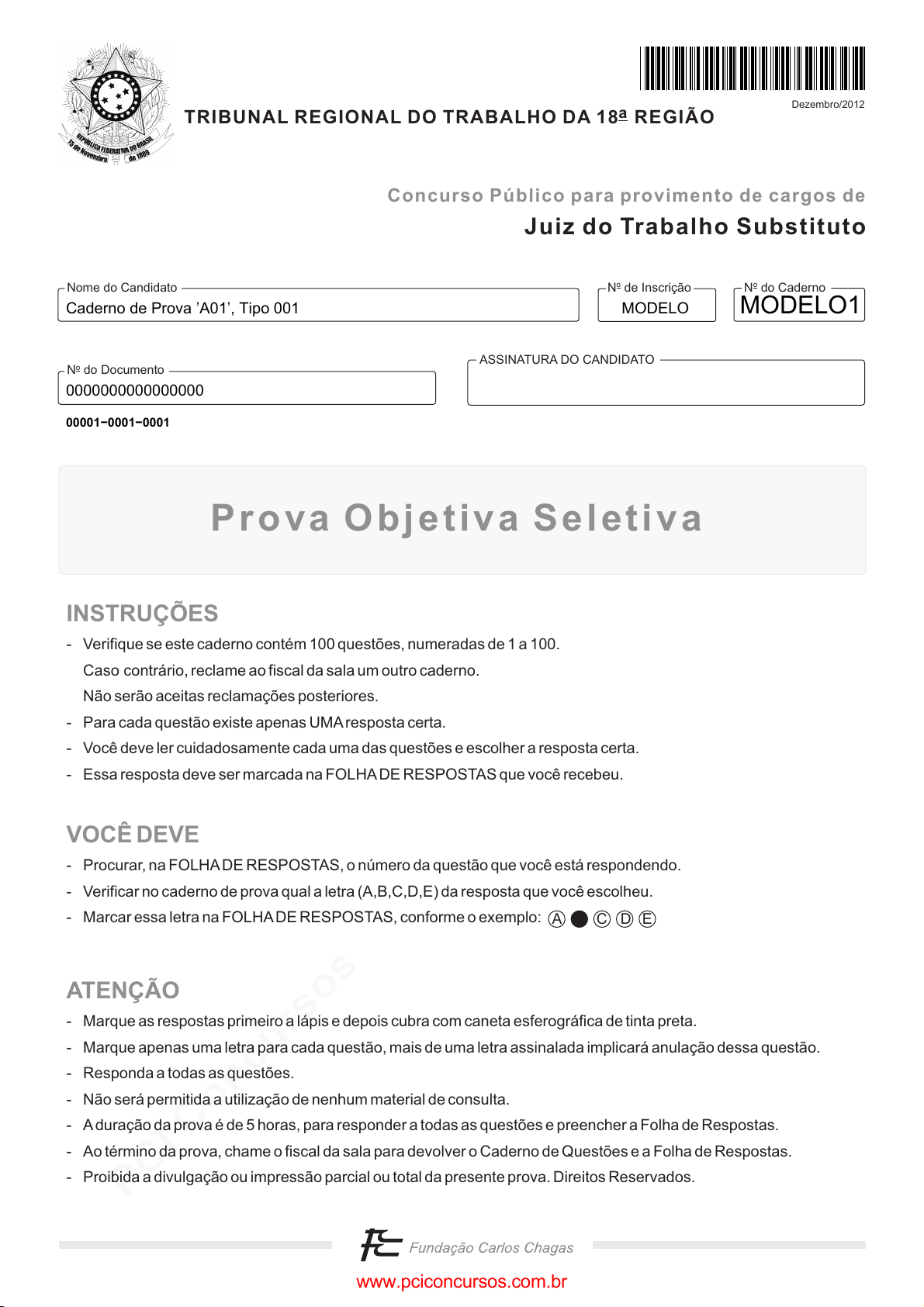 pcimarkpci MDAwMDowMDAwOjAwMDA6MDAwMDowMDAwOmZmZmY6YjViZjozZTlj:U3VuLCAyMyBNYXIgMjAyNSAwNTowOToxNiAtMDMwMA== www.pciconcursos.com.br INSTRUÇÕES VOCÊ DEVE ATENÇÃO - Verifique se este caderno contém 100 questões, numeradas de 1 a 100. Caso contrário, reclame ao fiscal da sala um outro caderno. Não serão aceitas reclamações posteriores. - Para cada questão existe apenas UMAresposta certa. - Você deve ler cuidadosamente cada uma das questões e escolher a resposta certa. - Essa resposta deve ser marcada na FOLHADE RESPOSTAS que você recebeu. - Procurar, na FOLHADE RESPOSTAS, o número da questão que você está respondendo. - Verificar no caderno de prova qual a letra (A,B,C,D,E) da resposta que você escolheu. - Marcar essa letra na FOLHADE RESPOSTAS, conforme o exemplo: - Marque as respostas primeiro a lápis e depois cubra com caneta esferográfica de tinta preta. - Marque apenas uma letra para cada questão, mais de uma letra assinalada implicará anulação dessa questão. - Responda a todas as questões. - Não será permitida a utilização de nenhum material de consulta. - Aduração da prova é de 5 horas, para responder a todas as questões e preencher a Folha de Respostas. - Ao término da prova, chame o fiscal da sala para devolver o Caderno de Questões e a Folha de Respostas. - Proibida a divulgação ou impressão parcial ou total da presente prova. Direitos Reservados. A C D E N do CadernooN de Inscriçãoo ASSINATURA DO CANDIDATO N do Documentoo Nome do Candidato Juiz do Trabalho Substituto Concurso Público para provimento de cargos de Prova Objet iva Selet iva Dezembro/2012 TRIBUNAL REGIONAL DO TRABALHO DA 18 REGIÃOa Caderno de Prova ’A01’, Tipo 001 MODELO 0000000000000000 MODELO1 00001−0001−0001 www.pciconcursos.com.br pcimarkpci MDAwMDowMDAwOjAwMDA6MDAwMDowMDAwOmZmZmY6YjViZjozZTlj:U3VuLCAyMyBNYXIgMjAyNSAwNTowOToxNiAtMDMwMA== www.pciconcursos.com.br 2 TRT18-Juiz Trabalho Substituto BLOCO I Direito Individual e Coletivo do Trabalho 1. Em face do princípio da irredutibilidade (ou da intangibilidade) salarial (art. 7 o , inciso VI, da Constituição Federal; art. 462 da Consolidação das Leis do Trabalho) e considerando o princípio da liberdade sindical (art. 8 o , CF) é correto afirmar: (A) Entende a atual jurisprudência que, desde que o trabalhador tenha consentido com desconto relativo à contribuição assistencial, poderá sofrê-lo em seus salários, fundamento este que guarda relação com a liberdade de associação. Por sua vez, a contribuição ao imposto sindical é obrigatória e decorre do fato gerador do trabalho prestado. (B) A contribuição assistencial e o imposto sindical são passíveis de descontos porque decorrem de lei e, assim como a quota parte devida ao INSS, não é ilícito que sejam retidos do salário a ser pago. (C) Considerando que nosso sistema sindical é da pluralidade sindical, admitindo-se, em consequência, que o trabalhador esteja vinculado ao sindicato de sua categoria, a contribuição sindical é absolutamente necessária à manutenção do sistema sindical. (D) O modelo sindical brasileiro é fundado no sistema de categorias e o trabalhador estará vinculado àquela relativa às atividades do seu empregador, de modo que, a obrigatoriedade do recolhimento é do empregador, entendendo a jurisprudência que esta responsabilidade e este custo decorrem dos riscos da atividade empresarial. (E) Em hipótese alguma será possível o desconto no salário do trabalhador relativo ao imposto sindical ou à contribuição assistencial, pois a contraprestação que decorre da prestação de serviços deve ser integral. 2. Relativamente às horas destinadas ao intervalo para refeição e descanso, já se pacificou o entendimento de que a concessão (A) ao intervalo de quinze minutos é direito do trabalhador que cumpre jornada diária de quatro horas. (B) parcial do intervalo devido importa na garantia do pagamento salarial pelo tempo integral, desprezando-se os eventuais minutos de intervalo gozado. (C) de intervalo não é admitida, em hipótese alguma, em turnos de revezamento. (D) parcial do intervalo devido importa na garantia do pagamento indenizado pelo tempo integral, desprezando-se os eventuais minutos de intervalo gozado. (E) parcial do intervalo devido garante ao trabalhador, de forma indenizada ou não, tão somente os minutos que não foram gozados para refeição. 3. O empregado poderá considerar rescindido seu contrato de trabalho (art. 483, CLT) na hipótese de: (A) seu empregador constituir-se em Empresa Individual de Responsabilidade Limitada e vier a falecer, sem deixar suces- sores. (B) ao ocupar função de chefia, for tratado com rigor excessivo por seu superior, preposto ou subordinado. (C) deixar o empregador de lhe pagar corretamente as horas extras. (D) ser agredido fisicamente por cliente da empresa em que trabalha. (E) ao retornar às suas funções, após a licença em razão de acidente do trabalho, ser ordenado que trabalhe em setor diverso do qual antes trabalhava. 4. No que diz respeito às terceirizações, é correto afirmar que (A) os Tribunais, em hipótese alguma, têm admitido a descentralização da mão de obra quando se trata de atividade fim da empresa. Sabendo-se que toda descentralização de mão de obra é terceirização, estaria assim esta hipótese abrangida pela Súmula 331 do TST. (B) a Administração Pública não será responsabilizada quando comprovar que procedeu a licitação regular da pessoa contratada para intermediar a mão de obra. (C) a intermediação da mão de obra não gera responsabilidade ao ente público nas hipóteses de ausência de dolo ou de culpa do respectivo ente, quando, na administração do contrato terceirizado, o fornecedor da mão de obra deixar de cumprir as obrigações que deveria ter com seus trabalhadores. (D) o tomador da mão de obra responderá por toda a obrigação não cumprida pelo fornecedor, salvo pelas multas previstas 