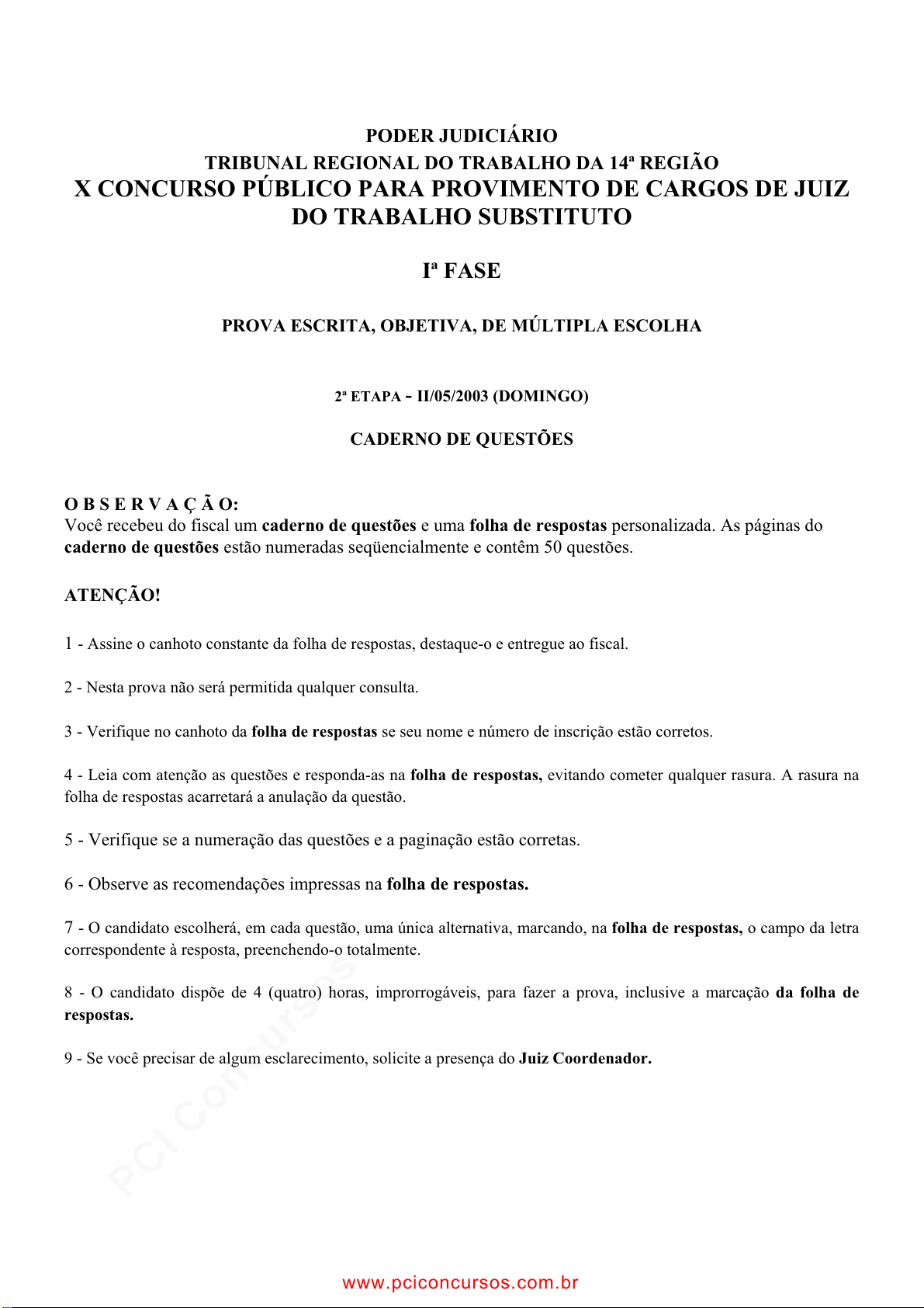 pcimarkpci MDAwMDowMDAwOjAwMDA6MDAwMDowMDAwOmZmZmY6YjViZjozZTlj:U3VuLCAyMyBNYXIgMjAyNSAwNTowNzoyNiAtMDMwMA== www.pciconcursos.com.br PODER JUDICIÁRIO TRIBUNAL REGIONAL DO TRABALHO DA 14ª REGIÃO X CONCURSO PÚBLICO PARA PROVIMENTO DE CARGOS DE JUIZ DO TRABALHO SUBSTITUTO Iª FASE PROVA ESCRITA, OBJETIVA, DE MÚLTIPLA ESCOLHA 2ª ETAPA - II/05/2003 (DOMINGO) CADERNO DE QUESTÕES O B S E R V A Ç Ã O: Você recebeu do fiscal um caderno de questões e uma folha de respostas personalizada. As páginas do caderno de questões estão numeradas seqüencialmente e contêm 50 questões. ATENÇÃO! 1 - Assine o canhoto constante da folha de respostas, destaque-o e entregue ao fiscal. 2 - Nesta prova não será permitida qualquer consulta. 3 - Verifique no canhoto da folha de respostas se seu nome e número de inscrição estão corretos. 4 - Leia com atenção as questões e responda-as na folha de respostas, evitando cometer qualquer rasura. A rasura na folha de respostas acarretará a anulação da questão. 5 - Verifique se a numeração das questões e a paginação estão corretas. 6 - Observe as recomendações impressas na folha de respostas. 7 - O candidato escolherá, em cada questão, uma única alternativa, marcando, na folha de respostas, o campo da letra correspondente à resposta, preenchendo-o totalmente. 8 - O candidato dispõe de 4 (quatro) horas, improrrogáveis, para fazer a prova, inclusive a marcação da folha de respostas. 9 - Se você precisar de algum esclarecimento, solicite a presença do Juiz Coordenador. www.pciconcursos.com.br pcimarkpci MDAwMDowMDAwOjAwMDA6MDAwMDowMDAwOmZmZmY6YjViZjozZTlj:U3VuLCAyMyBNYXIgMjAyNSAwNTowNzoyNiAtMDMwMA== www.pciconcursos.com.br DIREITO CONSTITUCIONAL 51. Considerando as assertivas sobre a Administração Pública, escolha a alternativa correta: I- exige-se aprovação em concurso público para admissão de pessoal nas autarquias e empresas publicas; II- admite-se a acumulação de dois cargos privativos de medico; III- assegura-se ao servidor público o direito de greve e de associação sindical; IV - a criação de autarquia depende de lei específica. a) todas são falsas; b) duas são falsas; c) todas são verdadeiras; d) apenas uma é verdadeira; e) três são verdadeiras. 52. Montesquieu, ao consagrar a tripartição dos poderes, como independentes e harmônicos, pretendeu organizar o estado democrático de direito, vigendo o princípio da separação dos poderes através dos tempos. Ante o princípio por ele preconizado, o Tribunal de Contas da União é órgão: a) vinculado ao Poder Judiciário; b) vinculado ao Poder Executivo; c) vinculado ao Poder Legislativo; d) vinculado aos Poderes Legislativo e Executivo; e) vinculado aos Poderes Legislativo, Executivo e Judiciário. 53. As medidas provisórias podem ser adotadas, em caso de relevância e urgência, pelo Presidente da República, nas seguintes condições: I) para tratar de matéria concernente ao processo civil; II) para disciplinar o seqüestro de bens; III) poderá ser renovada sucessivamente até que transformada em lei; IV) perderá a eficácia se não for transformada em Lei no prazo de 45 dias. Assinale a resposta: a) todas as afirmativas estão incorretas; b) apenas a alternativa IV está incorreta; c) apenas as alternativas II e IV estão incorretas; d) apenas as alternativas, II e III estão incorretas; e) apenas as alternativas I, II e III estão incorretas. 54. A ação declaratória de constitucionalidade pode ser proposta: I) pelo Governador de Estado; II) pelo Procurador Geral da República; III) pelo partido político com representação no Congresso Nacional; IV) pela confederação sindical ou entidade de classe de âmbito nacional. www.pciconcursos.com.br pcimarkpci MDAwMDowMDAwOjAwMDA6MDAwMDowMDAwOmZmZmY6YjViZjozZTlj:U3VuLCAyMyBNYXIgMjAyNSAwNTowNzoyNiAtMDMwMA== www.pciconcursos.com.br Assinale a resposta: a) todas as afirmativas estão corretas; b) apenas as afirmativas II e III estão corretas; c) apenas as afirmativas I e II estão corretas; d) apenas a afirmativa II está correta; e) apenas a afirmativa IV está incorreta. 55. O Magistrado vitalício perderá o cargo: I) em ação penal por crime comum; II) pelo exercício, ainda que em disponibilidade, de qualquer outra função, salvo a de um cargo de professor no magistério superior; III) recusar, omitir ou retardar, sem justo motivo, providência que deva ordenar de ofício ou a requerimento das partes; IV) pelo excesso ou impropriedade de linguagem nas decisões que proferir. Assinale a resposta: a) todas as afirmativas estão corretas; b) apenas as afirmativas I e IV estão corretas; c) apenas as afirmativas I e III estão corretas; d) apenas as afirmativas I e II estão corretas; e) apenas a afirmativa IV está incorreta. DIREITO ADMINISTRATIVO 56. São princípios da administração pública: a) moralidade, celeridade, eficiência; b) legalidade, hierarquia, publicidade; c) impessoal idade, publicidade, eficiência; d) conveniência, eficiência, moralidade; e) publicidade, oportunidade, legalidade. 57. Em relação à invalidação dos atos administrativos pode-se dizer que: I) no caso de ilegalidade do ato, a própria Administração pode anulá-Io; II) ocorrendo revogação de ato administrativo, são válidos os efeitos por ele produzidos até o momento de sua revogação; III) o Poder Judiciário pode revogar atos praticados pela Administração; IV) o ato discricionário do administrador pode ser anulado por falta de fundamentação; São corretas: a) apenas as afirmativas I e II; b) apenas as afirmativas I e III; www.pciconcursos.com.br pcimarkpci MDAwMDowMDAwOjAwMDA6MDAwMDowMDAwOmZmZmY6YjViZjozZTlj:U3VuLCAyMyBNYXIgMjAyNSAwNTowNzoyNiAtMDMwMA== www.pciconcursos.com.br c) apenas a afirmativa III; d) todas as afirmativas estão corretas; e) apenas a afirmativa II. 58. No processo licitatório será dispensada a publicação da convocação na: a) tomada de preços; b) carta convite; c)