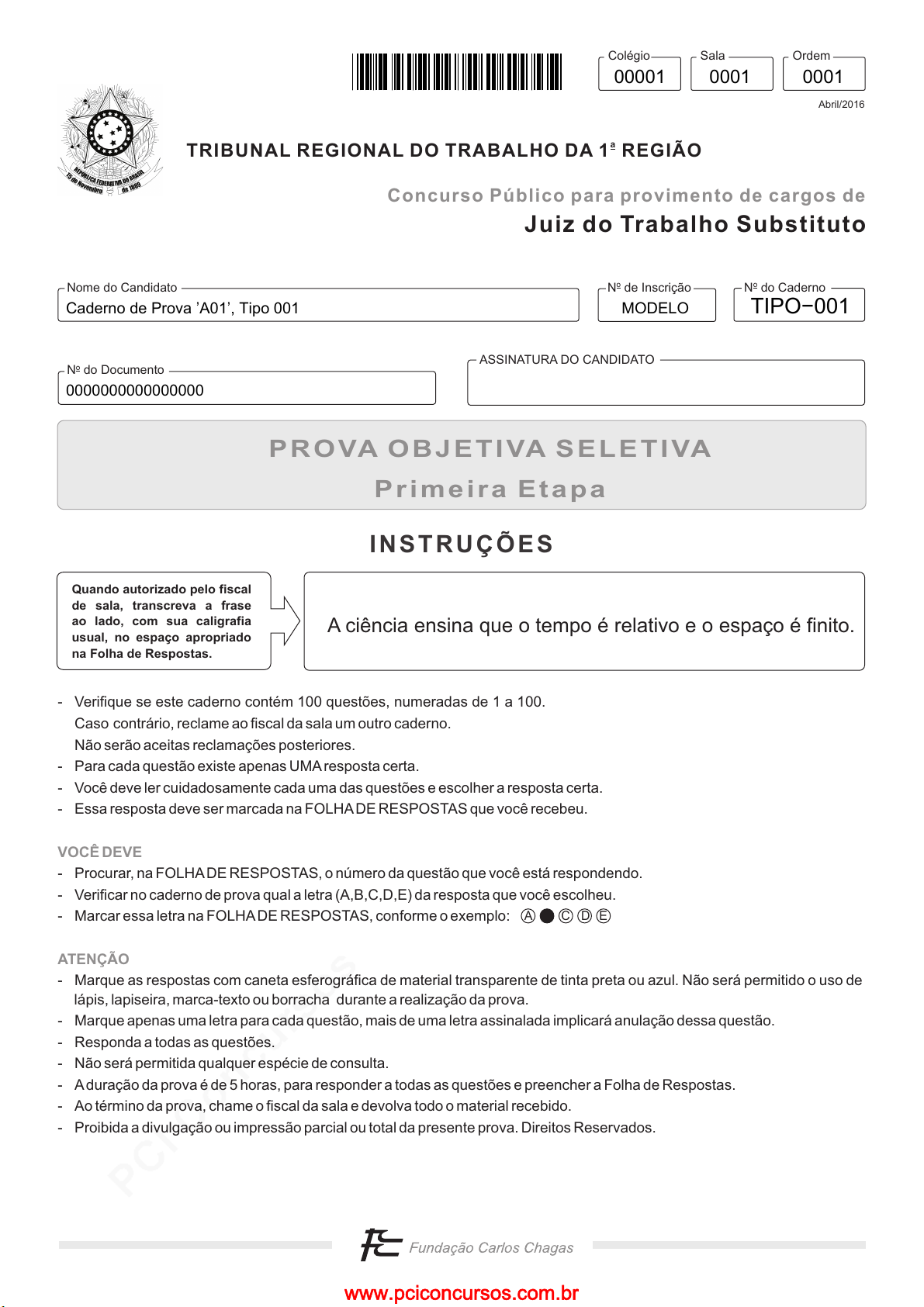 pcimarkpci MDAwMDowMDAwOjAwMDA6MDAwMDowMDAwOmZmZmY6YjViZjozZTlj:U3VuLCAyMyBNYXIgMjAyNSAwNTowNzozNSAtMDMwMA== www.pciconcursos.com.br N do CadernooN de Inscriçãoo ASSINATURA DO CANDIDATO N do Documentoo Nome do Candidato Juiz do Trabalho Substituto Concurso Público para provimento de cargos de TRIBUNAL REGIONAL DO TRABALHO DA 1 REGIÃOa Abril/2016 Colégio Sala Ordem Quando autorizado pelo fiscal de sala, transcreva a frase ao lado, com sua caligrafia usual, no espaço apropriado na Folha de Respostas. INSTRUÇÕES PROVA OBJETIVA SELETIVA Primeira Etapa A C D E - Verifique se este caderno contém 100 questões, numeradas de 1 a 100. Caso contrário, reclame ao fiscal da sala um outro caderno. Não serão aceitas reclamações posteriores. - Para cada questão existe apenas UMAresposta certa. - Você deve ler cuidadosamente cada uma das questões e escolher a resposta certa. - Essa resposta deve ser marcada na FOLHADE RESPOSTAS que você recebeu. - Procurar, na FOLHADE RESPOSTAS, o número da questão que você está respondendo. - Verificar no caderno de prova qual a letra (A,B,C,D,E) da resposta que você escolheu. - Marcar essa letra na FOLHADE RESPOSTAS, conforme o exemplo: - Marque as respostas com caneta esferográfica de material transparente de tinta preta ou azul. Não será permitido o uso de lápis, lapiseira, marca-texto ou borracha durante a realização da prova. - Marque apenas uma letra para cada questão, mais de uma letra assinalada implicará anulação dessa questão. - Responda a todas as questões. - Não será permitida qualquer espécie de consulta. - Aduração da prova é de 5 horas, para responder a todas as questões e preencher a Folha de Respostas. - Ao término da prova, chame o fiscal da sala e devolva todo o material recebido. - Proibida a divulgação ou impressão parcial ou total da presente prova. Direitos Reservados. VOCÊ DEVE ATENÇÃO A ciência ensina que o tempo é relativo e o espaço é finito. Caderno de Prova ’A01’, Tipo 001 MODELO 0000000000000000 TIPO−001 00001 0001 0001 www.pciconcursos.com.br pcimarkpci MDAwMDowMDAwOjAwMDA6MDAwMDowMDAwOmZmZmY6YjViZjozZTlj:U3VuLCAyMyBNYXIgMjAyNSAwNTowNzozNSAtMDMwMA== www.pciconcursos.com.br 2 TRT1R-Primeira Etapa-Prova Objetiva Seletiva BLOCO I Direito Individual do Trabalho 1. São direitos do atleta profissional, decorrentes do contrato especial de atleta desportivo: I. Repouso semanal remunerado de 24 horas ininterruptas. II. Não obrigação de atuar em eventos, oficiais ou amistosos, que não respeitem o intervalo mínimo de 66 horas entre o término do primeiro e o início do segundo. III. Férias anuais de 30 dias, acrescidas de abono, que, a critério do empregador, podem coincidir com o período de recesso das atividades desportivas. IV. Previsão obrigatória no contrato de cláusula compensatória, devida pela rescisão decorrente de inadimplemento sala- rial por culpa do empregador, pela rescisão indireta na forma da legislação trabalhista ou pela dispensa imotivada do atleta. Está correto o que se afirma em (A) II e IV, apenas. (B) II e III, apenas. (C) I e III, apenas. (D) I e IV, apenas. (E) I, II, III e IV. 2. De acordo com a Lei n o 12.690/2012, as cooperativas de trabalho devem garantir aos seus sócios, no mínimo: I. Duração normal do trabalho de 8 horas diárias, ressalvada a necessidade de trabalho por meio de plantão ou escala. II. Assistência médica por meio de serviço próprio ou convênio. III. Retirada para o trabalho noturno superior à daquele diurno. IV. Adicional sobre a retirada para as atividades insalubres, perigosas ou penosas. Está correto o que se afirma em (A) II e IV, apenas. (B) II e III, apenas. (C) I e III, apenas. (D) I e IV, apenas. (E) I, II, III e IV. 3. Considere a Lei n o 11.788/2008 que regula o estágio: I. A carga horária da atividade do estagiário nunca pode ultrapassar a 20 horas semanais, sendo 4 horas diárias, sempre compatíveis com as atividades escolares. II. A duração do estágio para a mesma parte concedente, exceto para os portadores de deficiência, é de, no máximo, 2 anos. III. Na hipótese de estágio não obrigatório, a atividade do estagiário deve necessariamente ser remunerada, com a concessão de, pelo menos, bolsa e auxílio-transporte. IV. Nos estágios com duração superior a um ano, o estagiário tem direito a recesso por período de 30 dias, preferencialmente coincidente com as férias escolares, sendo a bolsa devida neste período acrescida de um terço. Está correto o que se afirma em (A) II e IV, apenas. (B) II e III, apenas. (C) I e III, apenas. (D) I e IV, apenas. (E) I, II, III e IV. 4. De acordo com a Consolidação das Leis do Trabalho e o entendimento sumulado pelo TST, são hipóteses de interrupção do contrato de trabalho: I. O afastamento do empregado, por até 15 dias consecutivos, por força de auxílio-doença. II. O período de afastamento de até 9 dias em que o empregado professor se afasta em consequência do falecimento de filho. III. O período em que o empregado exercer cargo de diretor da empresa, desde que não permaneça existindo subordinação. IV. O período em que o empregado permanece afastado, por até 30 dias, cumprindo sanção disciplinar. Está correto o que se afirma em (A) II e IV, apenas. (B) II e III, apenas. (C) I e III, apenas. (D) I e II, apenas. (E) I, II, III e IV. Caderno de Prova ’A01’, Tipo 001 www.pciconcursos.com.br pcimarkpci MDAwMDowMDAwOjAwMDA6MDAwMDowMDAwOmZmZmY6YjViZjozZTlj:U3VuLCAyMyBNYXIgMjAyNSAwNTowNzozNSAtMDMwMA== www.pciconcursos.com.br TRT1R-Primeira Etapa-Prova Objetiva Seletiva 3 5. Em relação exclusivamente à Constituição Federal, no que diz respeito aos direitos dos empregados, considere: I. jornada de seis horas para o trabalho realizado em turnos ininterruptos de revezamento. II. proteção do mercado de trabalho da mulher. III. adicional para exercício de atividades penosas. IV. assistência gratuita aos dependentes de até 5 a