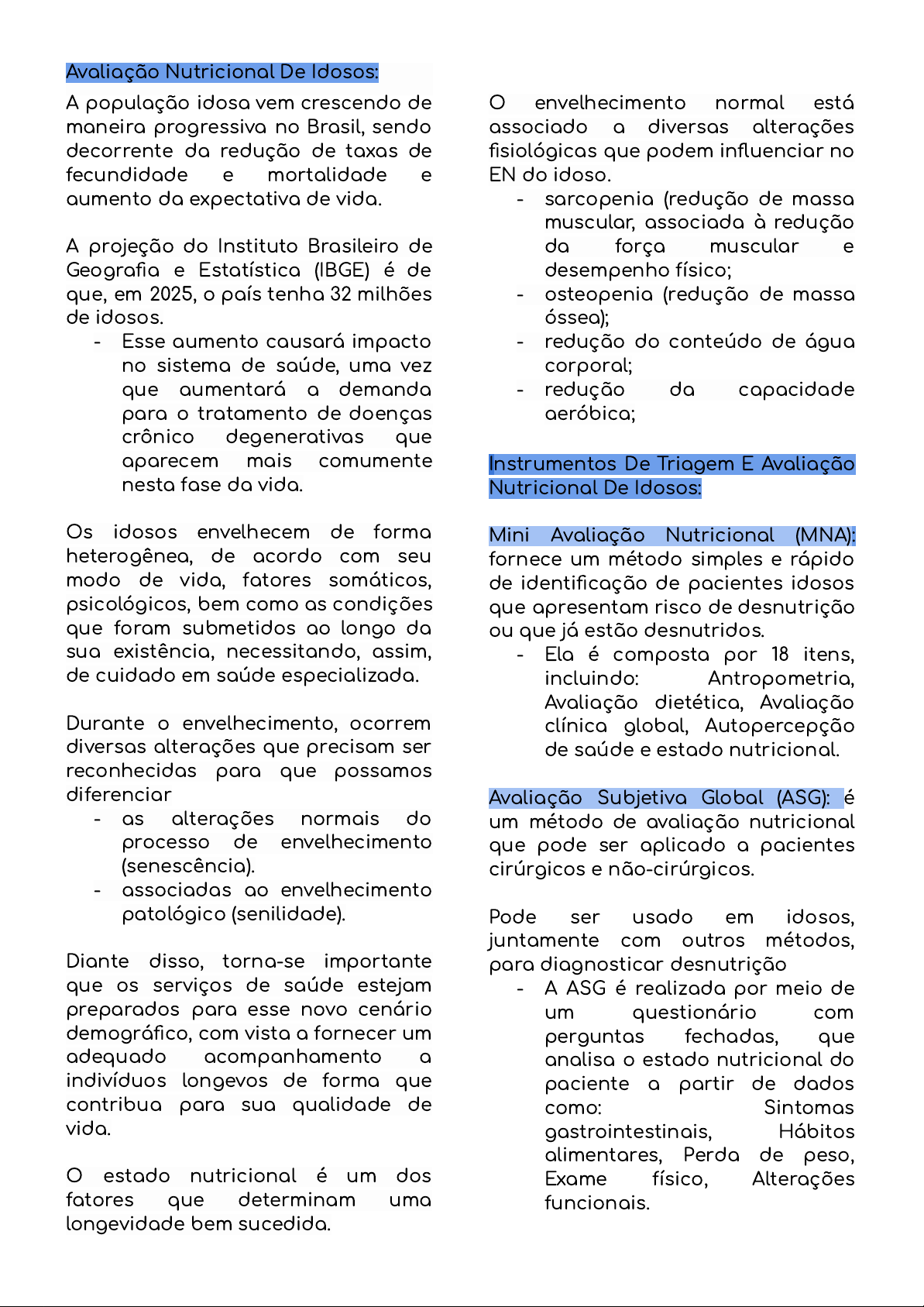 Avaliação Nutricional De Idosos: A população idosa vem crescendo de maneira progressiva no Brasil, sendo decorrente da redução de taxas de fecundidade e mortalidade e aumento da expectativa de vida. A projeção do Instituto Brasileiro de Geografia e Estatística (IBGE) é de que, em 2025, o país tenha 32 milhões de idosos. - Esse aumento causará impacto no sistema de saúde, uma vez que aumentará a demanda para o tratamento de doenças crônico degenerativas que aparecem mais comumente nesta fase da vida. Os idosos envelhecem de forma heterogênea, de acordo com seu modo de vida, fatores somáticos, psicológicos, bem como as condições que foram submetidos ao longo da sua existência, necessitando, assim, de cuidado em saúde especializada. Durante o envelhecimento, ocorrem diversas alterações que precisam ser reconhecidas para que possamos diferenciar - as alterações normais do processo de envelhecimento (senescência). - associadas ao envelhecimento patológico (senilidade). Diante disso, torna-se importante que os serviços de saúde estejam preparados para esse novo cenário demográfico, com vista a fornecer um adequado acompanhamento a indivíduos longevos de forma que contribua para sua qualidade de vida. O estado nutricional é um dos fatores que determinam uma longevidade bem sucedida. O envelhecimento normal está associado a diversas alterações fisiológicas que podem influenciar no EN do idoso. - sarcopenia (redução de massa muscular, associada à redução da força muscular e desempenho físico; - osteopenia (redução de massa óssea); - redução do conteúdo de água corporal; - redução da capacidade aeróbica; I nstrumentos De Triagem E Avaliação Nutricional De Idosos: Mini Avaliação Nutricional (MNA) : fornece um método simples e rápido de identificação de pacientes idosos que apresentam risco de desnutrição ou que já estão desnutridos. - Ela é composta por 18 itens, incluindo: Antropometria, Avaliação dietética, Avaliação clínica global, Autopercepção de saúde e estado nutricional. Avaliação Subjetiva Global (ASG): é um método de avaliação nutricional que pode ser aplicado a pacientes cirúrgicos e não-cirúrgicos. Pode ser usado em idosos, juntamente com outros métodos, para diagnosticar desnutrição - A ASG é realizada por meio de um questionário com perguntas fechadas, que analisa o estado nutricional do paciente a partir de dados como: Sintomas gastrointestinais, Hábitos alimentares, Perda de peso, Exame físico, Alterações funcionais. Mini Exame do Estado Mental (MEEN): é usado por profissionais de saúde antes de aplicar a triagem nutricional. - Ele pode ser utilizado para avaliar a função cognitiva do idoso, pois investiga vários domínios (orientação espacial, temporal, memória imediata e de evocação, cálculo, linguagem-nomeação, repetição, compreensão, escrita e cópia de desenho), podendo complementar avaliação nutricional, visto que é de fácil aplicação. Alterações Orgânicas Do Envelhecimento: COMPOSIÇÃO CORPORAL: Água corpórea: no idoso, há uma redução em torno de 20%, principalmente, relacionada ao conteúdo intracelular. - Enquanto no adulto jovem a relação de água intracelular: extracelular é 2:1, no idoso, essa relação é de 1:1,5. Essa redução ocorre em consequência à reduzida massa celular no idoso. Esse grupo pode ser considerado como “desidratado crônico”, entretanto, a reposição de líquidos deverá ser feita de maneira cautelosa para evitar sobrecarga cardiocirculatória, pois o compartimento extracelular também é reduzido. Massa muscular: A redução de algum grau de massa muscular faz parte do processo de envelhecimento. - Essa perda pode ser gradual, com a perda da qualidade e da força muscular, o que é chamado de sarcopenia. É estimado que cerca de 30% das pessoas com mais de 60 anos apresentam algum grau de sarcopenia, comprometendo a sua autonomia, maior risco de acidentes com sequelas e, consequentemente, menor qualidade de vida. - Causas: sedentarismo, alteração no estado hormonal, má nutrição, estresse oxidativo, contudo, a principal causa possa ser a perda de fibras musculares. Diminuição de massa magra → redução de água corporal Tecido adiposo: o tecido adiposo aumenta e tende a se distribuir de forma central, especificamente, como gordura visceral. - No sexo feminino, a gordura tende a ser mais concentrada na região dos quadris. - Nos homens, localiza-se mais na região abdominal. PESO: o peso corporal nessa fase da vida tende a reduzir após os 60 anos de idade. ESTATURA: por volta dos 40 anos, ocorre uma redução de 1 cm por década, sendo essa redução acentuada aos 70 anos. - Isso ocorre devido às alterações da coluna vertebral, em consequência a redução dos discos intervertebrais e cifose dorsal, do arqueamento dos membros inferiores e do achatamento do arco plantar, sendo mais acentuado no sexo feminino. Uma das formas de avaliar a altura de idosos é por meio da envergadura do braço ou estimada a partir da altura do joelho. Avaliação Antropométrica E De Composição Corporal De Idosos: Em idosos, a interpretação do diagnóstico nutricional deverá ser associada à clínica, visto que, no idoso, além das modificações corporais, há frequentemente a presença de morbidades, como doenças crônicas não transmissíveis, fragilidade, hábitos de vida não saudável e inatividade física. AFERIÇÃO DO PESO: Alguns idosos podem apresentar dificuldade de locomoção e/ou, até mesmo, para se equilibrar. - Dessa maneira, a solução é empregar balanças de base larga com o examinador sempre próximo ao idoso para que este se sinta seguro durante a aferição do peso. Caso não seja possível pesá-lo, podemos estimar a altura: Homens Peso(kg)=(0,98 ×CP)+(1,16 ×AJ)+(1,73 ×CB) +(0,37×PCSE)-81,69 Mulheres Peso (kg)=(1,27 ×CP)+(0,87 ×AJ)+(0,98 ×CB)+(0,4 ×PCSE)-62,35 A mudança de peso em um