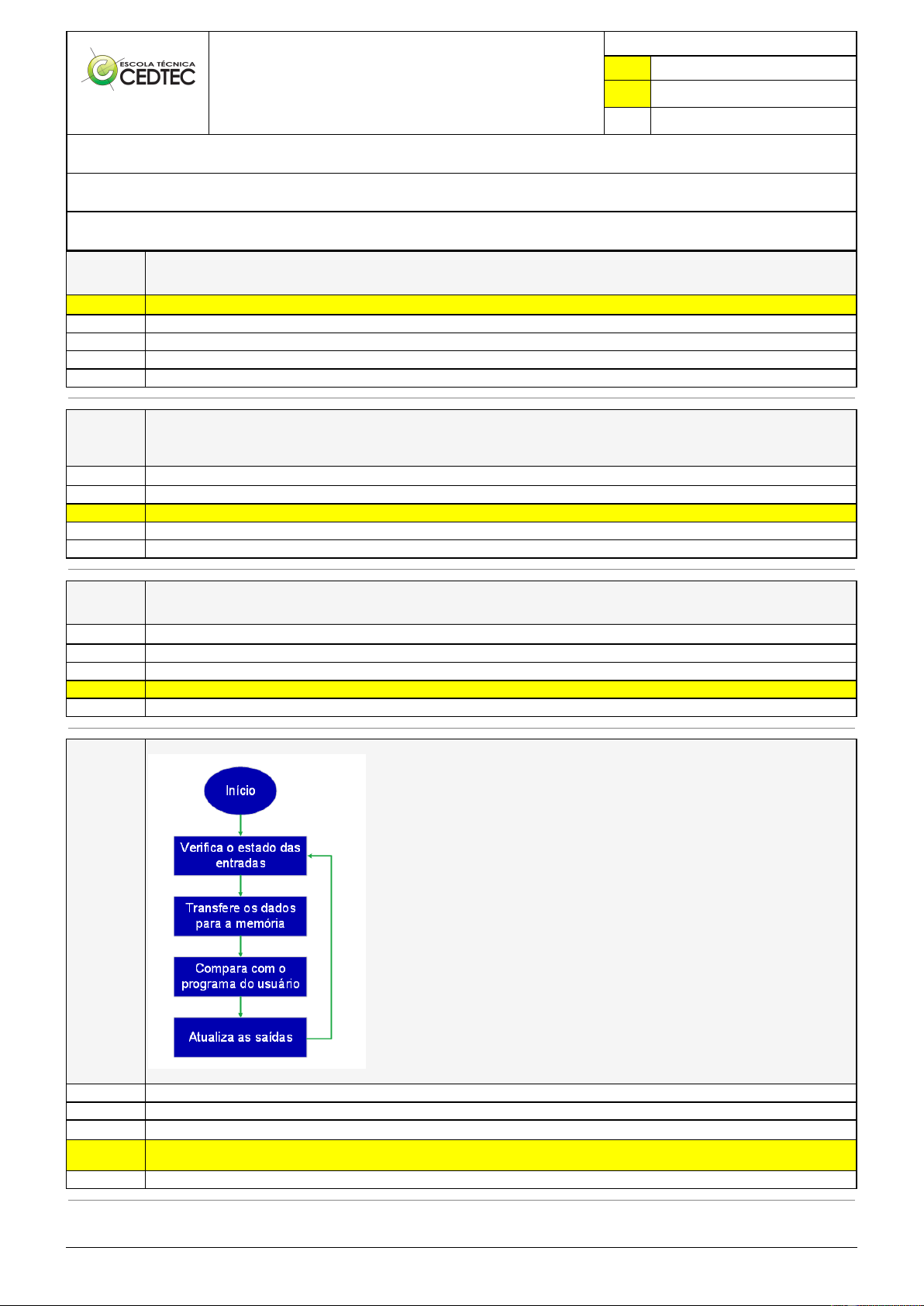 Pincel Atômico - 24/03/2025 10:24:37 1/5 MÁRIO CIPRIANO DE SOUZA Avaliação Presencial (EAD) Atividade finalizada em 03/08/2024 10:35:53 (2360317 / 1) LEGENDA Resposta correta na questão # Resposta correta - Questão Anulada X Resposta selecionada pelo Aluno Disciplina: CONTROLADOR LÓGICO PROGRAMÁVEL [994554] - Avaliação com 20 questões, com o peso total de 51,00 pontos [capítulos - Todos] Turma: Curso Técnico: Eletrotécnica - Grupo: EAD - 01/24 - EAD ELE [108907] Aluno(a): 91549936 - MÁRIO CIPRIANO DE SOUZA - Respondeu 4 questões corretas, obtendo um total de 10,20 pontos como nota [350097_1978] Questão 001 Quais das alternativas abaixo podemos classificar como dispositivos para interligação em um cartão de entrada digital? X Botoeira de emergência, chava bóia, pressostato Transmissor de temperatura, transmissor de nível e ultra som Nenhuma das alternativas Transmissor de vazão, botoeira de acionamento de emergência, lâmpada de sinalização Inversor de frequência e válvula de controle [350097_1268 91] Questão 002 Qual opção não é uma entrada ou saída digital: X Botoeira Relé Sensor de deformação (strain gauges) Lâmpada de sinalização Chave fim-de-curso [350097_348] Questão 003 Stdio.h e stdlib.h são tipos de: X Operações Funções Tags Bibliotecas Métodos [350097_1268 95] Questão 004 Dada a seguinte figura do funcionamento de um CLP: É característica de comparar com o programa do usuário: O CLP armazena os resultados obtidos em uma região chamada de Imagem das Entradas e Saídas. O CLP escreve o valor contido na Memória das Saídas, atualizando as interfaces. X O CLP realiza um processo de varredura que recebe o nome de Ciclo de Varredura (Scan) e normalmente é de alguns microssegundos (scan time). Após consultar a Memória Imagem das Entradas, atualiza o estado da Memória Imagem das Saídas, de acordo com as instruções definidas pelo usuário em seu programa. O CLP executa uma série de operações pré-programadas, gravadas em seu Programa Monitor. Pincel Atômico - 24/03/2025 10:24:37 2/5 [350097_9986] Questão 005 São característica do PLC, EXCETO: Pode ser instalado em cabines reduzidas devido ao pequeno espaço físico exigido X Operam com reduzido grau de proteção, pelo fato de não serem geradores de faiscamentos Fácil diagnóstico de funcionamento ainda em fase de projeto do sistema e/ou reparos que venham a ocorrer em sua operação Facilmente reprogramado sem a necessidade de interromper o processo produtivo (programação on-line) Flexibilidade da expansão apenas do número de entradas a serem controladas [350097_1269 68] Questão 006 O diagrama abaixo demonstra uma lógica de repetição, qual das alternativas representa um comportamento adequado da lógica? Se no começo do programa o valor de “i” for 70, no final o valor de “i” será 50. Se no começo do programa o valor de “i” for 70, o valor final de “i” será 71. X Independentemente do valor inicial de “i”, no final o valor de “i” será 50. Se no começo do programa o valor de “i” for 20, no final o valor de “i” será 50. Se no começo do programa o valor de “i” for 20, no final o valor de “i” será 21. [350097_1275 05] Questão 007 Dado o Ladder abaixo, qual opção corresponde mais fielmente ao comportamento do circuito abaixo? O:2/0 só se energizará se a entrada I:1/0 estiver energizada e I:1/2 estiver desenergizada. O:2/0 só se energizará se as entradas I:1/0 e I:1/2 estiverem energizadas. A única forma de desenergizar a saída O:2/0 após ela ter sido energizada é através da desenergização da entrada I:1/2. O:2/0 só se energizará se a entrada I:1/0 estiver desenergizada e I:1/2 estiver energizada. X A única forma de desenergizar a saída O:2/0 após ela ter sido energizada é através da desenergização da entrada I:1/0. [350097_355] Questão 008 Qual a função da inserção de bibliotecas em um programa em C? X Permitir que o programa seja interpretado Possibilitar o uso de funções durante o código Possibilitar a criação das variáveis Não há necessidade de colocar bibliotecas nos códigos, sendo assim não tem função alguma Permitir que o programa seja compilado [350097_352] Questão 009 Quais desses operadores de comparação, está com a referência de uso errada para o uso na função If? > Maior X = Maior ou igual [350097_5670 5] Questão 010 Qual expressão representa melhor o diagrama a seguir? A e B ou C e D aciona Z X A ou B e C ou D aciona Z Apenas A e B ou apenas C e D aciona Z A ou B ou C ou D aciona Z Apenas A e B e C e D aciona Z Pincel Atômico - 24/03/2025 10:24:37 3/5 [350098_1001 3] Questão 011 Qual dos blocos abaixo representada um Temporizador TON? X [350098_361] Questão 012 A função Leia() do portugol se equivale a que função da linguagem C? Printf() Print() Scanf() X If() Scan() [350098_1269 58] Questão 013 Qual dispositivo circulado na figura a seguir: X Saídas digitais Entradas analógicas Saídas analógicas Entradas digitais Alimentação Pincel Atômico - 24/03/2025 10:24:37 4/5 [350098_9997] Questão 014 São Tipos de endereços da programação do PLC, EXCETO: Q = DIGITAL OUTPUT IQ = Digital PUT I = DIGITAL INPUT X AQW =ANALOG OUTPUT AIW = ANALOG IMPUT [350098_1000 7] Questão 015 Qual das alternativas abaixo corresponde ao endereçamento de uma entrada digital? T0.0 C0.0 I0.0 M0.0 X Q0.0 [350098_1269 91] Questão 016 O diagrama Ladder abaixo representa uma: Associação do tipo “SELO” X Associação com saídas em paralelo Associação do tipo “E” Associação do tipo “NÃO” Associação do tipo “OU” [350096_1268 87] Questão 017 São características de sinais analógicos serem: X Contínuos no tempo e contínuos na amplitude. Discretos no tempo e discretos na amplitude. Contínuos no tempo, não importando a variação na amplitude. Contínuos no tempo e discretos na amplitude. Discretos no tempo e contínuos na amplitude. [350096_4262]