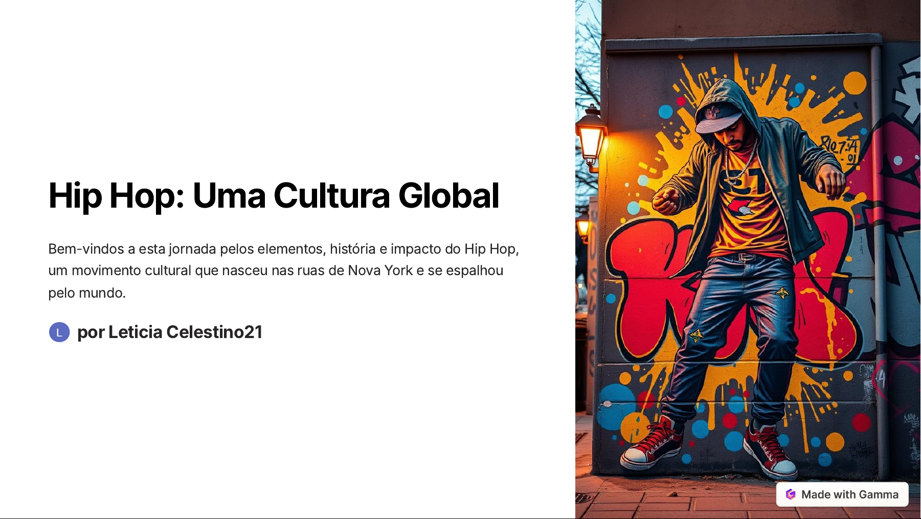 Hip Hop: Uma Cultura Global Bem-vindos a esta jornada pelos elementos, história e impacto do Hip Hop, um movimento cultural que nasceu nas ruas de Nova York e se espalhou pelo mundo. por Leticia Celestino21 https://gamma.app/?utm_source=made-with-gamma As Raízes do Hip Hop Um Movimento Coletivo O Hip Hop surgiu nos anos 1970 nas comunidades afro- americanas e latinas de Nova York, como uma forma de expressão e resistência. Unindo Diferentes Artes Ele engloba música, dança, artes visuais e moda, refletindo a criatividade e a energia dessas comunidades. https://gamma.app/?utm_source=made-with-gamma Música e Dança 1 1. Rap Rap é a arte de rimar e contar histórias, combinando ritmo e poesia. 2 2. DJing DJing é a arte de manipular discos e criar batidas, um elemento fundamental do Hip Hop. 3 3. Breakdance Breakdance é uma dança de rua que envolve movimentos acrobáticos, força e criatividade. https://gamma.app/?utm_source=made-with-gamma Artes Visuais e Moda Grafite O grafite é uma forma de arte urbana que se manifesta em paredes e espaços públicos. Moda A moda do Hip Hop reflete a cultura urbana, com roupas, acessórios e estilos que representam o movimento. https://gamma.app/?utm_source=made-with-gamma Hip Hop: Uma História de Evolução 1 Os anos 1970 viram o nascimento do Hip Hop em festas de rua com DJs como Kool Herc. 2 A década de 1980 trouxe popularização com artistas como Run-D.M.C., Grandmaster Flash e The Sugarhill Gang. 3 A década de 1990 testemunhou a diversificação com o surgimento do gangsta rap e artistas como Tupac e Notorious B.I.G. 4 A partir dos anos 2000, o Hip Hop se tornou global, influenciando a música e a cultura em todo o mundo. https://gamma.app/?utm_source=made-with-gamma Bruno Mars e o Hip Hop 1 Colaborações Bruno Mars colaborou com vários artistas do Hip Hop, como Cardi B em "Finesse" e Mark Ronson em "Uptown Funk". 2 Influência Musical Embora conhecido por sua música pop e R&B, Bruno Mars incorpora elementos do Hip Hop em seu estilo musical. https://gamma.app/?utm_source=made-with-gamma Impacto Cultural do Hip Hop 1 Influência Global O Hip Hop transformou a moda, a linguagem e as artes visuais em todo o mundo. 2 Consciência Social Aborda temas como racismo, desigualdade e violência, dando voz a comunidades marginalizadas. 3 Plataforma para Vozes Criou uma plataforma para expressar ideias e promover mudanças sociais. https://gamma.app/?utm_source=made-with-gamma O Legado do Hip Hop O Hip Hop é um movimento cultural em constante evolução, que inspira, transforma e une pessoas em todo o mundo. https://gamma.app/?utm_source=made-with-gamma