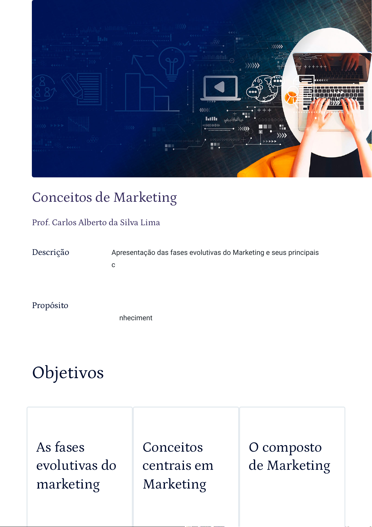Conceitos de Marketing Prof. Carlos Alberto da Silva Lima Descrição Apresentação das fases evolutivas do Marketing e seus principais conceitos e estratégias. Noções sobre o composto de Marketing, suas definições e análise. Propósito Compreender os fundamentos e as premissas básicas do Marketing, conhecimentos essenciais para definir as ações e o posicionamento de uma empresa. Objetivos Módulo 1 As fases evolutivas do marketing Módulo 2 Conceitos centrais em Marketing Módulo 3 O composto de Marketing Reconhecer o Composto de Marketing. Identificar as fases evolutivas do Marketing. Identificar os conceitos centrais em Marketing. Introdução É muito comum ouvir o termo Marketing na TV, na internet e nas organizações. Mas, afinal, o que realmente é Marketing? O que vem a ser “Mix de Marketing”? Vamos discutir esses assuntos, bem como aprender como as organizações desenvolvem metas e planos em relação à função Marketing, ou seja, as suas estratégias. Conhecer os fundamentos do Marketing é importante tanto para o pequeno empresário como para o gestor de uma grande organização. Mas antes, vamos conferir a professora Cecília Mattoso neste vídeo, que nos contará um pouco mais sobre o conceito de Marketing. 1 - As fases evolutivas do marketing Ao final deste módulo, você será capaz de identificar as fases evolutivas do Marketing. Ligando os pontos No cenário 4.0 do Marketing, constatamos que as empresas estão focadas no fortalecimento da relação da organização com o cliente, por meio da comunicação. Para compreender melhor esse cenário, vamos estudar o case do Nubank. Nubank O Nubank é uma organização fintech que desenvolve serviços financeiros, a partir de recursos avançados de tecnologia de informação, para diminuir o ritual burocrático, reduzir as taxas cobradas e apresentar serviços de qualidade aos usuários dos serviços dos bancos tradicionais. Fundado em 2013, o Nubank é uma das referências em bom atendimento ao cliente por se manter em estado permanente de comunicação com suas demandas. Sua abordagem garantiu uma posição de destaque entre instituições financeiras que atuam de forma digital em todo o mundo. Essa posição vem sendo mantida com base na oferta de diversos produtos, destacando-se, entre eles, a utilização de cartão de crédito e conta digital, sem custos de manutenção e de transferência de recursos financeiros, a disponibilização de programa de milhagem sem expiração de pontos e investimentos sem valores mínimos. A comunicação entre a organização e seus clientes é permanente, durante 24 horas por dia, por meio de atendimento via telefone, chat, e-mail e redes sociais. Em sua forma inclusiva de atuação, promoveu, em 2021, a terceira edição do programa Yes, She Codes para incentivar a contratação de mulheres na área de engenharia de software da organização. Ainda nessa linha, a organização quebrou paradigmas ao convidar a cantora Anitta para participar do conselho de administração. Essa medida de aproximação com artistas alinha-se com a diversidade, que contribui para uma maior proximidade com seus clientes. Após a leitura do case, é hora de aplicar seus conhecimentos! Vamos ligar esses pontos? Questão 1 Para você, quais são os diferenciais da fintech Nubank em sua forma de atuação no mercado de serviços financeiros? Digite sua resposta aqui Chave de resposta A Nubank atua desenvolvendo soluções que visam apenas atender às necessidades e à expectativa dos clientes, de modo permanente, por meio de diversos canais de comunicação. De maneira singular, atende às suas solicitações 24 horas por dia. Essa forma de atuação, integrada aos meios digitais, posicionam o Nubank como empresa de destaque no segmento financeiro. Questão 2 De acordo com o case apresentado, constatamos diversas abordagens do Nubank para atender melhor a seus clientes. Pensando em termos de Marketing, qual delas você não atribuiria a essa empresa? Parabéns! A alternativa A está correta. Foco no produto é uma abordagem adotada no cenário 2.0, em que a organização desenvolve produtos de acordo com sua expertise, sem a preocupação de atender às necessidades e expectativas dos clientes. Henry Ford é o representante mais emblemático desse cenário, por ter afirmado que os A Produtos desenvolvidos a partir do conhecimento de especialistas financeiros. B Comunicações 24 horas por dia com os clientes por diversos canais de comunicações. C Ofertas de produtos financeiros sem custos de forma digital. D Atuação inclusiva na sociedade, com quebra de paradigmas. E Processos organizacionais simplificados para maior aproximação com o cliente. compradores poderiam comprar qualquer carro de qualquer cor de sua fábrica, desde que fossem pretos. Questão 3 O Nubank desenvolve diversas estratégias que contemplam o atendimento ao cliente. Com base em sua análise sobre a empresa, assinale a alternativa que apresenta uma característica do cenário 4.0 de Marketing adotado pelo Nubank: Parabéns! A alternativa C está correta. Uma das características típicas do cenário 4.0 é a ampla utilização de redes sociais, além de outras ferramentas digitais. O que é Marketing? Existem diversas definições sobre o que é Marketing e qual a sua função. De acordo com Kotler (2013), as primeiras definições apontavam para a vertente financeira da ferramenta de Marketing, definindo-a como uma forma da empresa suprir necessidades gerando lucro. Porém, à medida que os mercados foram se sofisticando, os conceitos de Marketing foram aprimorados e A Foco no consumo de produtos. B Preocupação social com os consumidores. C Comunicação por redes sociais. D Marketing centrado nos valores. E Marketing voltado para o consumidor. atualizados. Dessa maneira, muitas empresas verificaram que o Marketing não se aplicava apenas ao simples objetivo de venda direta, e sim à criação e manutenção de uma im