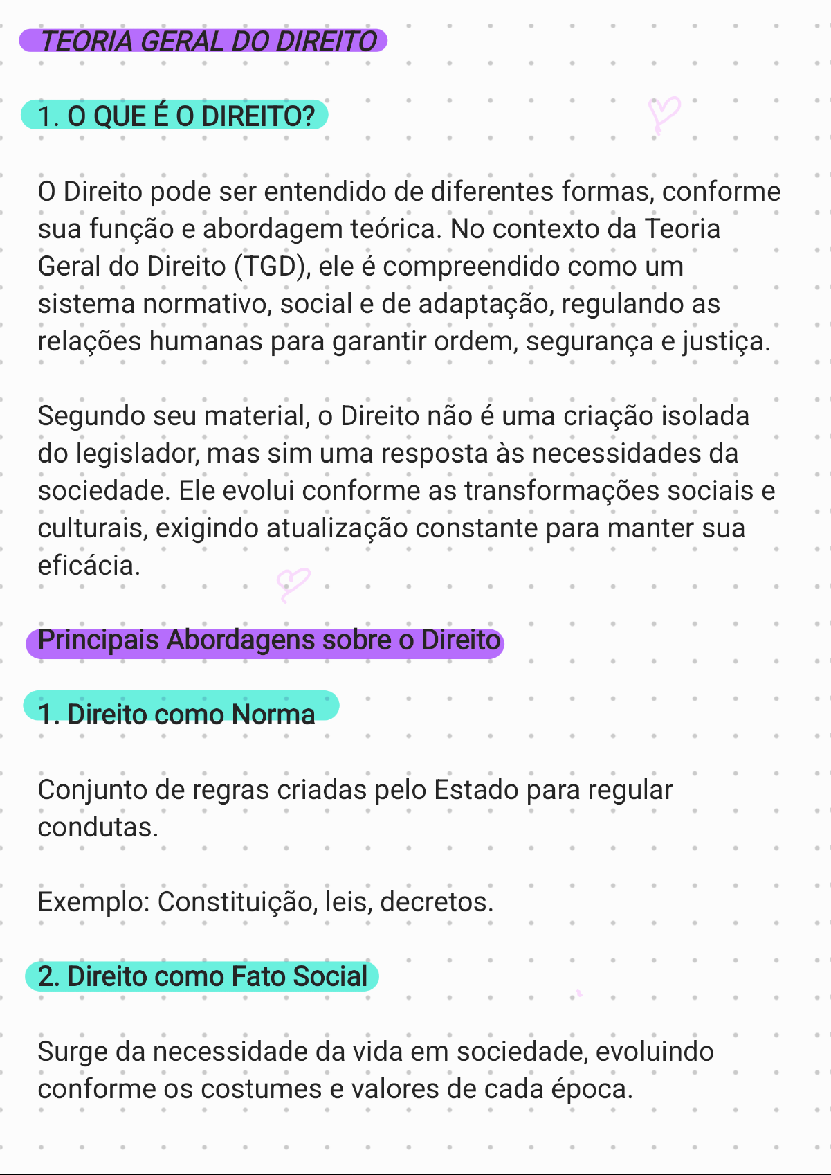 TEORIA GERAL DO DIREITO 1.0 QUE É DIREITO? Direito pode ser entendido de diferentes formas, conforme sua função e abordagem teórica. No contexto da Teoria Geral do Direito (TGD), ele é compreendido como um sistema normativo, social e de adaptação, regulando as relações humanas para garantir ordem, segurança e justiça. Segundo seu material, o Direito não uma criação isolada do legislador, mas sim uma resposta às necessidades da sociedade. Ele evolui conforme as transformações sociais e culturais, exigindo atualização constante para manter sua eficácia. Principais Abordagens sobre o Direito 1. Direito como Norma Conjunto de regras criadas pelo Estado para regular condutas. Exemplo: Constituição, leis, decretos. 2. Direito como Fato Social Surge da necessidade da vida em sociedade, evoluindo conforme os costumes e valores de cada época.Exemplo: A proibição do trabalho infantil se consolidou conforme a sociedade reconheceu sua importância. 3. Direito como Ideal de Justiça Deve garantir valores como liberdade, equidade e dignidade. Exemplo: Direitos fundamentais como o direito à vida e à liberdade. Direito Natural X Direito Positivo Direito Natural: Baseado na moral e na justiça, existindo independentemente da legislação. Direito Positivo: Criado pelo Estado, imposto por normas e sujeito a mudanças. Direito não é um fim em si mesmo, mas um instrumento de organização e equilíbrio social, garantindo que as relações humanas ocorram de maneira ordenada e justa.2. CONCEITOS ELEMENTARES DA TEORIA GERAL DO DIREITO A Teoria Geral do Direito (TGD) organiza conceitos fundamentais que estruturam o Direito, auxiliando na compreensão dos seus elementos essenciais. Segundo seu material, a TGD não cria novas normas, mas sistematiza princípios e ideias de diferentes areas jurídicas, como: Filosofia do Direito Ciência do Direito Sociologia Jurídica História do Direito Direito Comparado A TGD busca entender o Direito como um todo, analisando sua estrutura e função dentro da sociedade. Principais Conceitos da Teoria Geral do Direito Norma Jurídica: Regras que regulam comportamentos sociais. Ordenamento Jurídico: Conjunto organizado de normas jurídicas, hierarquizado conforme a Constituição.Direito Objetivo e Direito Subjetivo: Direito Objetivo: Conjunto de normas vigentes em um Estado. Direito Subjetivo: Direito de um indivíduo dentro do sistema jurídico. Fato Jurídico, Ato Jurídico e Negócio Jurídico: Fato Jurídico: Qualquer acontecimento relevante para o Direito (exemplo: nascimento, morte). Ato Jurídico: Ação voluntária que gera efeitos jurídicos (exemplo: assinatura de um contrato). Negócio Jurídico: Ato que cria, modifica ou extingue direitos (exemplo: contrato de compra e venda)3. FUNDAMENTOS HISTÓRICOS DA TEORIA GERAL DO DIREITO A TGD surgiu no século XIX como uma resposta ao pensamento abstrato e metafísico da Filosofia Jurídica. Ela adotou uma abordagem mais objetiva e prática, influenciada pelo positivismo jurídico. Principais Momentos da Evolução do Direito 1. Código de Hamurabi (1750 a.C.) - Primeira codificação de leis escritas. Direito Romano - Desenvolvimento de conceitos fundamentais como contratos e propriedade. 2. Idade Média Direito Canônico dominava a Europa, mesclando religião e normas jurídicas. 3. Idade Moderna fortalecimento do Estado Moderno levou à codificação do Direito.Filósofos como Hobbes, Locke e Montesquieu influenciaram o pensamento jurídico, introduzindo a separação de poderes e os direitos individuais. 4. Século XIX e XX Desenvolvimento do positivismo jurídico (Hans Kelsen) Surgimento do jusnaturalismo (Direito baseado na moral e na justiça) Consolidação do realismo jurídico, que foca na aplicação prática do Direito. A TGD foca na estrutura e funcionamento do Direito, sem se preocupar com a moral ou o conteúdo específico das leis.4. EPISTEMOLOGIA JURÍDICA E o DIREITO COMO CIÊNCIA SOCIAL A epistemologia jurídica estuda a forma como o conhecimento do Direito é estruturado e sua relação com as ciências sociais. Direito como Ciência Social Direito é um fenômeno social e, como tal, se adapta às mudanças da sociedade. Essa adaptação ocorre de duas formas: 1.0 Direito se ajusta à sociedade, criando novas normas conforme mudanças sociais. 2. A sociedade se ajusta ao Direito, adaptando comportamentos às novas normas. Direito deve ser dinâmico e atualizado, pois, se se tornar obsoleto, perde sua função de organizar e equilibrar as relações sociais.5. CORRENTES DOGMÁTICAS E ZETÉTICAS DO DIREITO A TGD pode ser analisada a partir de duas abordagens: 1. Dogmática Jurídica Trata o Direito como um sistema fechado e normativo. Segue a lógica do positivismo jurídico (Hans Kelsen) Tem um caráter técnico e objetivo. Exemplo: Juízes aplicando a lei exatamente como está escrita. 2. Questiona e investiga criticamente o Direito. Relaciona-se com a Filosofia do Direito e a Sociologia Jurídica. Busca compreender se as normas são justas e adequadas. Exemplo: Discussões filosóficas sobre justiça e direitos humanos.Comparação Entre as Correntes Dogmática Jurídica Zetética Jurídica Direito como sistema fechado Direito como sistema aberto Baseia-se na interpretação e Questiona a validade e a justiça aplicação das normas das normas Aplicação técnica e objetiva das Reflexão crítica sobre o Direito leis Exemplo: Tribunais aplicando leis Exemplo: Juristas debatendo a sem questioná-las necessidade de mudanças nas leis A dogmática jurídica é essencial para a segurança jurídica, enquanto a zetética contribui para a evolução e aprimoramento do Direito. CONCLUSÃO A Teoria Geral do Direito fornece os conceitos essenciais para compreender o Direito, sua evolução e suas diferentes abordagens. Seus principais pontos são: Definição do Direito como norma, fato social e ideal de justiça. Fundamentos históricos e a evolução da Teoria do Direito. Direito