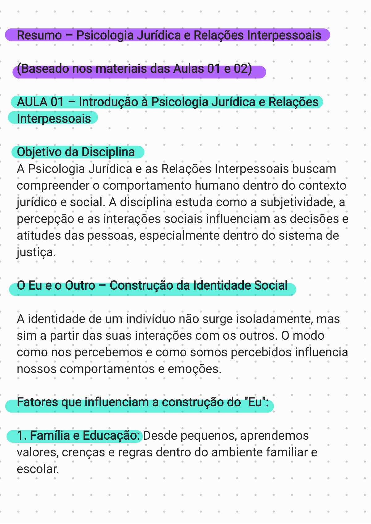 Resumo - Psicologia Jurídica e Relações Interpessoais (Baseado nos materiais das Aulas 01 e 02) AULA 01 - Introdução à Psicologia Jurídica e Relações Interpessoais Objetivo da Disciplina A Psicologia Jurídica e as Relações Interpessoais buscam compreender o comportamento humano dentro do contexto jurídico e social. A disciplina estuda como a subjetividade, a percepção e as interações sociais influenciam as decisões e atitudes das pessoas, especialmente dentro do sistema de justiça. Eu e o Outro - Construção da Identidade Social A identidade de um indivíduo não surge isoladamente, mas sim a partir das suas interações com os outros. modo como nos percebemos e como somos percebidos influencia nossos comportamentos e emoções. Fatores que influenciam a construção do "Eu": 1. Família e Educação: Desde pequenos, aprendemos valores, crenças e regras dentro do ambiente familiar e escolar.2. Cultura e Sociedade: Tradições e normas culturais moldam nossa identidade e visão de mundo. 3. Experiências Individuais: Nossas vivências e desafios pessoais afetam quem somos e como agimos. 4. Relacionamentos Interpessoais: contato com amigos, colegas e parceiros também molda a forma como nos enxergamos. A Psicologia Social e a Psicologia Jurídica estudam como essas influências impactam nossas decisões e comportamentos, especialmente no contexto da justiça. Percepção e Programação Neurolinguística (PNL) A percepção do mundo é subjetiva. que vemos, ouvimos e sentimos passa por um filtro pessoal, baseado em nossas experiências e crenças. A Programação Neurolinguística (PNL) explica que processamos a realidade por meio de três sistemas representacionais: Visual: Foco na aparência e imagens. Pessoas predominantemente visuais observam detalhes estéticos e lembram-se mais de rostos e cores.Auditivo: Sensibilidade aos sons e tons de VOZ. Essas pessoas costumam ser mais comunicativas e processam informações melhor por meio da audição. Cinestésico: Valorização de sensações e conforto físico. Pessoas cinestésicas são movidas por emoções e preferem aprender por meio da experiência. Exemplo do Material: Quando três amigos visitam um café, cada um percebe o ambiente de forma diferente: Maria (Visual) vê a beleza do local e o design moderno. João (Cinestésico) percebe o conforto do ambiente. Carla (Auditiva) sente incômodo com o som alto. Isso mostra como cada indivíduo pode interpretar a mesma situação de maneira única, com base em seu sistema representacional predominante. SISTEMAS REPRESENTACIONAIS A base da PNL é que nós estruturamos os pensamentos de maneiras diferentes. Esta forma de os pensamentos é o que chamamos de sistemas representacionais. VISUAL AUDITIVO CINESTÉSICO 24/30Pirâmide de Maslow - Hierarquia das Necessidades Humanas PIRÂMIDE DE MASLOW Teoria da Hierarquia das Necess Abraham Maslow foi um psicólogo norte americano Criatividade, talento, REALIZAÇÃO desenvolvimento pessoal que estudou e demonstrou a PESSOAL relação entre o comportamento motivacional ESTIMA status, autoestima das pessoas e um conjunto Amor, de necessidades SOCIAL família, comunidade Segurança SEGURANÇA de da família FISIOLOGIA abrigo, descanso A teoria de Abraham Maslow sugere que os seres humanos possuem uma hierarquia de e só avançamos para um nível superior quando o nível está atendido. 1. Necessidades Fisiológicas - Alimentação, água, sono, abrigo. 2. Necessidades de Segurança - Proteção física, saúde, estabilidade financeira. 3. Necessidades Sociais - Relacionamentos, pertencimento a grupos. 4. Necessidades de Estima - Autoestima, respeito. 5. Necessidade de Autorrealização - Crescimento pessoal, criatividade, realização de potenciais.Essa teoria é aplicada na Psicologia Jurídica para entender, por exemplo, como indivíduos privados de segurança ou pertencimento podem se envolver em comportamentos problemáticos, influenciando até mesmo o sistema criminal. 6 9 "Todo ponto de vista é a vista de um ponto." Leonardo Boff 29/30 Psicologia Jurídica - o Indivíduo no Contexto Legal A Psicologia Jurídica estuda como as pessoas se comportam dentro do ambiente Isso inclui: Testemunhos e memória: O cérebro humano pode distorcer lembranças, afetando depoimentos. Influência da sociedade na justiça: Preconceitos sociais podem impactar julgamentos. Mediação de conflitos: Técnicas psicológicas auxiliam na resolução pacífica de disputas. Estresse e saúde mental de profissionais do Direito: Juízes,AULA 02 - Psicologia Social e Relações Interpessoais Psicologia Social - Como o Meio Influencia o Indivíduo A Psicologia Social investiga como o ambiente e as interações sociais afetam o comportamento humano. Diferentes fatores influenciam nossa percepção do mundo de mesmos, como: Cultura e normas sociais. Grupos de pertencimento. Influência da mídia e da política. Psicologia social é "o estudo cientifico" Do pensamento social Da influência social Das relações sociais Como percebemos a nós Cultura Preconceito mesmos e aos outros Pressões para se conformar Agressão Em que acreditamos Persuasão Atração e intimidade Julgamentos que fazemos Grupos de pessoas Ajuda Nossas atitudesTemas Importantes da Psicologia Social: 1. Preconceitos e estereótipos: Como criamos julgamentos sobre os outros. 2. Influência social: Como o comportamento de um grupo pode modificar a atitude de um indivíduo. 3. Identidade social: Como nos identificamos dentro de grupos e comunidades. 4. Conflitos e violência: As raízes psicológicas da agressão e do crime. Eu e a Subjetividade A subjetividade se refere à forma única como cada pessoa vê e interpreta o mundo. Construída por meio da linguagem e da cultura. Influenciada por experiências pessoais e sociais. Determina nossas emoções, opiniões e comportamentos. A Psicologia Jurídica considera a subjetividade ao analisar casos criminais, testemunhos e julgamentos, pois 