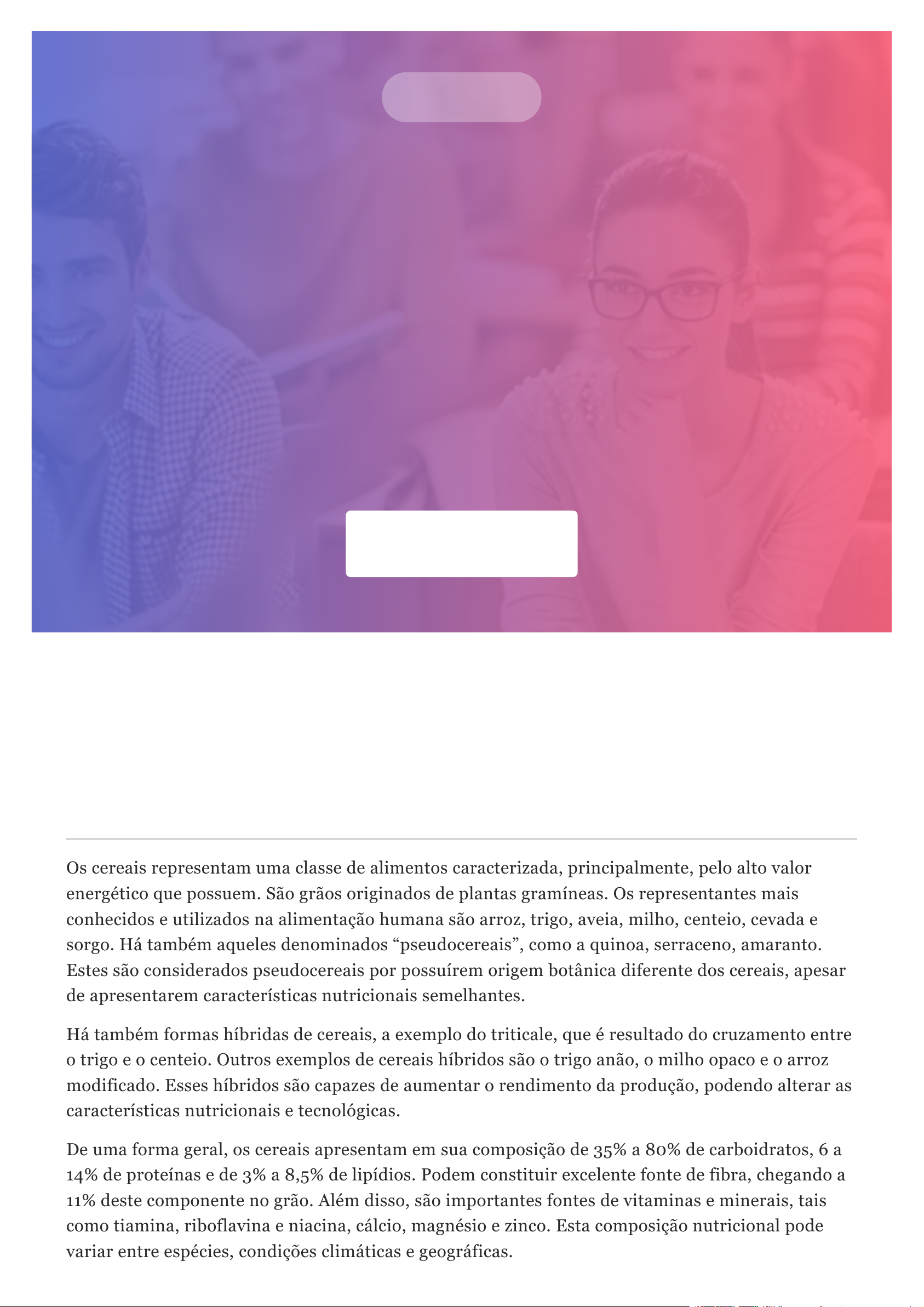25/03/2020 Composição de Grãos: Cereais https://cead.uvv.br/graduacao/conteudo.php?aula=composicao-de-graos-cereais&dcp=composicao-dos-alimentos&topico=5 1/12 Lição 05 Composição de Grãos: Cereais Composição dos Alimentos Começar a aula 1. CEREAIS: Conceitos e caracterização nutricional Os cereais representam uma classe de alimentos caracterizada, principalmente, pelo alto valor energético que possuem. São grãos originados de plantas gramíneas. Os representantes mais conhecidos e utilizados na alimentação humana são arroz, trigo, aveia, milho, centeio, cevada e sorgo. Há também aqueles denominados “pseudocereais”, como a quinoa, serraceno, amaranto. Estes são considerados pseudocereais por possuírem origem botânica diferente dos cereais, apesar de apresentarem características nutricionais semelhantes. Há também formas híbridas de cereais, a exemplo do triticale, que é resultado do cruzamento entre o trigo e o centeio. Outros exemplos de cereais híbridos são o trigo anão, o milho opaco e o arroz modificado. Esses híbridos são capazes de aumentar o rendimento da produção, podendo alterar as características nutricionais e tecnológicas. De uma forma geral, os cereais apresentam em sua composição de 35% a 80% de carboidratos, 6 a 14% de proteínas e de 3% a 8,5% de lipídios. Podem constituir excelente fonte de fibra, chegando a 11% deste componente no grão. Além disso, são importantes fontes de vitaminas e minerais, tais como tiamina, riboflavina e niacina, cálcio, magnésio e zinco. Esta composição nutricional pode variar entre espécies, condições climáticas e geográficas. 25/03/2020 Composição de Grãos: Cereais https://cead.uvv.br/graduacao/conteudo.php?aula=composicao-de-graos-cereais&dcp=composicao-dos-alimentos&topico=5 2/12 Os modismos alimentares mais comuns na atualidade “demonizam” os alimentos ricos em carboidratos, dentre os quais os cereais se destacam. Mas como veremos, os cereais são importantes fontes de outros nutrientes e configuram alimentos importantes para uma dieta balanceada nutricionalmente e adequada culturalmente. Um fator extremamente determinante da caracterização nutricional dos cereais é seu grau de polimento e beneficiamento. Cereais polidos apresentarão menor teor de fibras, vitaminas e minerais, uma vez que tais componentes são encontrados nas porções externas do grão de cereal, conforme veremos adiante. Podemos simplificar a anatomia do grão do cereal em três partes principais, que terão, respectivamente, características de composição nutricional diferentes: o farelo, o endosperma e o germe. PARA REFLETIR O fato de os cereais serem ricos em carboidratos os fazem alimentos vilões? Anatomia do Grão de Cereal. https://cead.uvv.br/conteudo/wp-content/uploads/2018/08/aula_comali_top05_img01-768x768.jpg 25/03/2020 Composição de Grãos: Cereais https://cead.uvv.br/graduacao/conteudo.php?aula=composicao-de-graos-cereais&dcp=composicao-dos-alimentos&topico=5 3/12 A casca e película do grão são duas subestruturas que formam o farelo, representando aproximadamente 15% do peso do grão. A depender do cereal, estas subestruturas se desprendem com maior ou menor facilidade do grão. De forma geral, o farelo é rico em fibras, vitaminas e minerais. O endosperma corresponde à parte mais volumosa do grão, podendo representar até 82% do peso do grão. É composto basicamente por amido e, em menor proporção, por proteínas. O germe representa não mais do que 3% do peso do grão, sendo constituído principalmente por lipídios e vitaminas lipossolúveis. Vale ressaltar que os cereais polidos apresentam basicamente o endosperma, sendo, portanto, mais pobres em nutrientes quando comparados aos grãos integrais que contém parte da película. Além disso, é importante destacar que há variação na composição nutricional entre um cereal e outro, de forma que a aveia, o centeio e a cevada, por exemplo, se destacam por seus elevados teores de proteína e ferro quando comparada aos demais, conforme apresentado na tabela 1 abaixo. Tabela 1: Composição nutricional de diferentes cereais. Cereal Umidade(%) CHO(g) PTN(g) LIP(g) FA(g) Ca(mg) Fe(mg) Vit. B1(mg) Vit. B3(mg) Arroz Integral Cru 12,2 77,5 7,3 1,9 4,8 8 0,9 0,26 4,2 Aveia Flocos Crua 9,1 66,5 13,9 8,5 9,1 48 4,4 0,55 4,5 Farinha de Milho 11,8 79,0 7,2 1,5 5,5 1 2,2 0,25 Tr Farinha de Trigo integral 15,4 70,1 11,6 1,3 12,8 22 3,4 0,48 4,7 Cevada Crua 9,6 72,4 13,8 2,4 15,1 26,7 2,4 0,17 5,5 Centeio, Farinha Integral 10,8 73,3 12,6 1,8 15,5 34 4,7 0,29 - Quinoa, Crua 13,3 64,2 14,2 6,1 7,0 47 4,6 0,36 1,5 Fonte: TACO (2011) e TBCA (2018) CHO: Carboidrato; PTN: Proteína; LIP: Lipídio; FA: Fibra Alimentar; Ca: Cálcio; Fe: Ferro; Vit. B1: Vitamina B1 (tiamina); Vit. B3: Vitamina B3 (niacina) Tr: Traços 25/03/2020 Composição de Grãos: Cereais https://cead.uvv.br/graduacao/conteudo.php?aula=composicao-de-graos-cereais&dcp=composicao-dos-alimentos&topico=5 4/12 2. Especificidades dos cereais Como citamos anteriormente, os cereais apresentam semelhanças que os caracterizam no mesmo grupo de alimentos. Porém, é importante ressaltar que os diferentes tipos de cereais podem se comportar com algumas especificidades, seja no seu conteúdo nutricional, seja nas diversas possibilidades de intervenções tecnológicas a que são submetidos. Desta forma, passaremos agora a apresentar, mesmo que de maneira sucinta, as principais características dos principais cereais: arroz, trigo, milho e aveia. Em seguida, daremos um panorama mais geral sobre outros cereais. 2.1. Arroz O arroz é, inquestionavelmente, um alimento muito estimado pela cultura alimentar do brasileiro, sendo consumido por todas as classes sociais. Aliado às leguminosas, em especial o feijão, contribuem de forma importante para a ingestão adequada de proteínas. Como todo cereal, o arroz é rico em amido e é livre de glúten, sendo, portanto, indicado para pessoas com sensibi