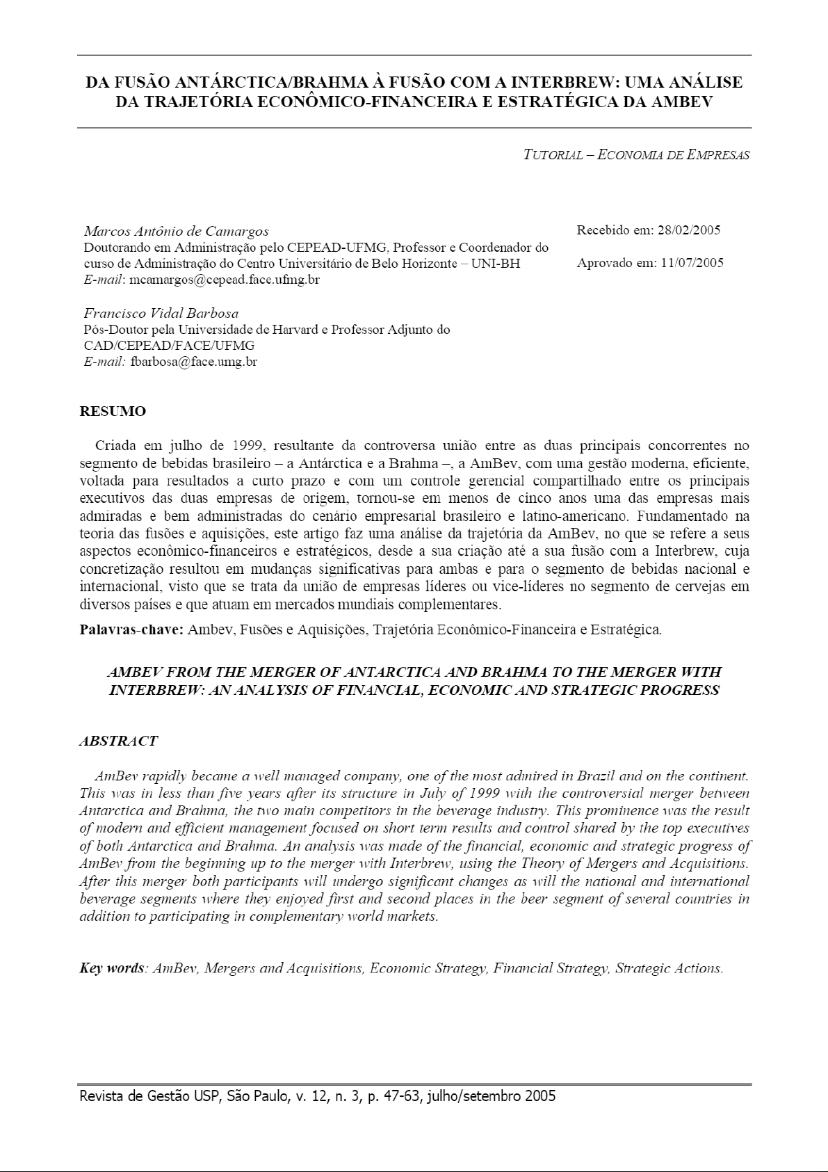 DA FUSÃO ANTÁRCTICA/BRAHMA À FUSÃO COM A INTERBREW: UMA ANÁLISE DA TRAJETÓRIA E ESTRATÉGICA DA AMBEV TUTORIAL ECONOMIA DE EMPRESAS Marcos Antônio de Camargos Recebido em: 28/02/2005 Doutorando em Administração pelo Professor e Coordenador do curso de Administração do Centro Universitário de Belo Horizonte UNI-BH Aprovado em: 11/07/2005 E-mail: Francisco Vidal Barbosa Pós-Doutor pela Universidade de Harvard e Professor Adjunto do CAD/CEPEAD/FACE/UFMG E-mail: fbarbosa@face.umg.br RESUMO Criada em julho de 1999, resultante da controversa união entre as duas principais concorrentes no segmento de bebidas brasileiro a Antárctica e a Brahma a AmBev, com uma gestão moderna, eficiente, voltada para resultados a curto prazo e com um controle gerencial compartilhado entre os principais executivos das duas empresas de origem, tornou-se em menos de cinco anos uma das empresas mais admiradas e bem administradas do cenário empresarial brasileiro e Fundamentado na teoria das fusões e aquisições, este artigo faz uma análise da trajetória da AmBev, no que se refere a seus aspectos econômico-financeiros e estratégicos, desde a sua criação até a sua fusão com a Interbrew, cuja concretização resultou em mudanças significativas para ambas e para o segmento de bebidas nacional e internacional, visto que se trata da união de empresas líderes ou vice-líderes no segmento de cervejas em diversos países e que atuam em mercados mundiais complementares. Palavras-chave: Ambev, Fusões e Aquisições, Trajetória Econômico-Financeira e AMBEV FROM THE MERGER OF ANTARCTICA AND BRAHMA TO THE MERGER WITH INTERBREW: AN ANALYSIS OF FINANCIAL, ECONOMIC AND STRATEGIC PROGRESS ABSTRACT AmBev rapidly became a well managed company, one of the most admired in Brazil and on the continent. This was in less than five years after its structure in July of 1999 with the controversial merger between Antarctica and Brahma, the two main competitors in the beverage industry. This prominence was the result of modern and efficient management focused on short term results and control shared by the top executives of both Antarctica and Brahma. An analysis was made of the financial, economic and strategic progress of AmBev from the beginning up to the merger with Interbrew, using the Theory of Mergers and Acquisitions. After this merger both participants will undergo significant changes as will the national and international beverage segments where they enjoyed first and second places in the beer segment of several countries in addition to participating in complementary world markets. Key words: AmBev, Mergers and Acquisitions, Economic Strategy, Financial Strategy, Strategic Actions. Revista de Gestão USP, São Paulo, V. 12, n. 3, p. 47-63, julho/setembro 2005Marcos Antônio de Camargos e Francisco Vidal Barbosa 1. INTRODUÇÃO é as F&As representarem atualmente uma das mais importantes fontes de Investimento Direto O avanço dos meios de transporte e da Estrangeiro (IDE) tecnologia, principalmente dos meios de O anúncio da fusão da Antárctica com a Brahma comunicação e da informática, tem contribuído para em 1999, criando a AmBev, teve uma grande a internacionalização do capital financeiro e repercussão na mídia e foi bastante controverso para produtivo, a reestruturação patrimonial e societária os seus diversos stakeholders, principalmente para e a desregulamentação da atividade econômica por os órgãos governamentais que a analisaram, para os meio da redução de barreiras alfandegárias e do concorrentes, funcionários e a opinião pública, pois aumento da competição, resultando num ambiente se tratava na época de uma união de duas empresas de mercado volátil, que tem exigido das empresas líderes do segmento de bebidas, cujo efeito um novo posicionamento competitivo. multiplicador foi considerável para a economia Nesse cenário, assiste-se atualmente a uma brasileira. A complexa união das duas empresas foi estruturação produtiva em todos os seus níveis, que permeada de dificuldades e batalhas judiciais contra se apresenta sob várias formas de parcerias e concorrentes e, no final, o prazo e as restrições alianças empresariais, entre elas as fusões e foram maiores que os esperados, mas não aquisições. inviabilizaram a sua criação. O atual cenário empresarial é caracterizado pela Neste artigo, faz-se uma análise da trajetória da crescente internacionalização das empresas e por AmBev nos seus aspectos econômico-financeiros e um ambiente incerto de negócios, de acirrada estratégicos, desde a sua criação até a sua união com a Interbrew. competição, o qual, a longo prazo, devido aos rearranjos econômicos, premia as empresas mais eficientes e que têm poder de mercado. Uma 2. ASPECTOS TEÓRICOS maneira rápida de uma empresa conquistar novos mercados e se consolidar no mercado é a sua A Lei das Sociedades Anônimas (Lei n. combinação com outra empresa, por meio dos 6404/76), em seu artigo 227, conceitua aquisição processos conhecidos como fusões e aquisições, ou (incorporação) como "operação pela qual uma ou simplesmente F&As. mais sociedades são absorvidas por outra, que lhes sucede em todos os direitos e E em seu Os processos de F&A que ocorrem atualmente artigo 228, propõe a seguinte definição para fusão: visam basicamente o acesso a novos mercados, "operação pela qual se unem duas ou mais tecnologias e competências, maior poder econômico sociedades para formar sociedade nova, que lhes e de competição, sinergias e melhoria de eficiências sucederá em todos os direitos e Isto é. administrativas e operacionais, diminuição do risco o processo de fusão resulta no desaparecimento das operacional e financeiro, proteção de mercado duas firmas anteriormente existentes e no contra a entrada de concorrentes estrangeiros, surgimento de uma nova firma, o que na literatura aquisições indesejadas ou a simples sobrevivência. internac