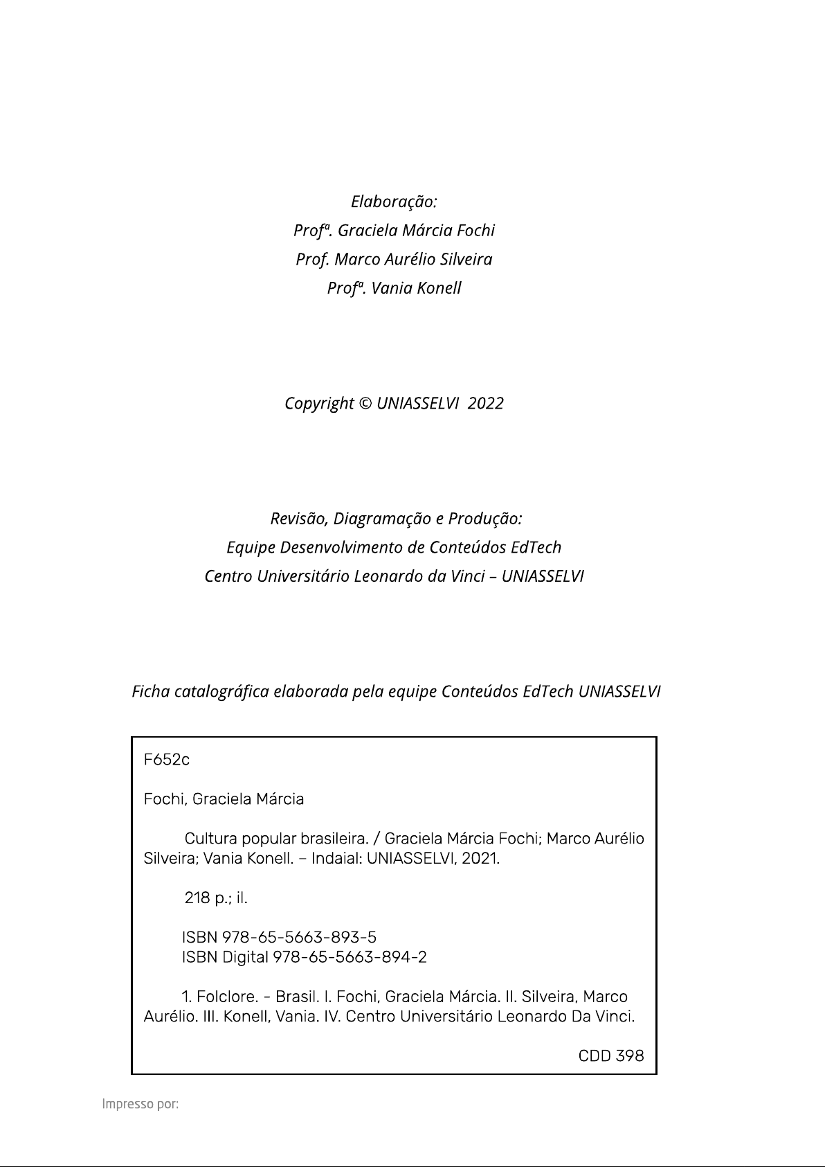 Elaboração: Profa. Graciela Márcia Fochi Prof. Marco Aurélio Silveira Profa. Vania Konell Copyright UNIASSELVI 2022 Revisão, Diagramação e Produção: Equipe Desenvolvimento de Conteúdos EdTech Centro Universitário Leonardo da Vinci - UNIASSELVI Ficha catalográfica elaborada pela equipe Conteúdos EdTech UNIASSELVI F652c Fochi, Graciela Márcia Cultura popular brasileira. / Graciela Márcia Fochi; Marco Aurélio Silveira; Vania Konell. - Indaial: UNIASSELVI, 2021. 218 il. ISBN 978-65-5663-893-5 ISBN Digital 978-65-5663-894-2 1. Folclore. - Brasil. I. Fochi, Graciela Márcia. II. Silveira, Marco Aurélio. III. Vania. IV. Centro Universitário Leonardo Da Vinci. CDD 398 Impresso por:GIO Olá, eu sou a Gio! No livro didático, você encontrará blocos com informações adicionais muitas vezes essenciais para seu entendimento acadêmico como um todo. Eu ajudarei você a entender melhor que são essas informações adicionais e por que você poderá se beneficiar ao fazer a leitura dessas informações durante estudo do livro. Ela trará informações adicionais e outras fontes de conhecimento que complementam o assunto estudado em questão. Na Educação a Distância, livro impresso, entregue a todos os acadêmicos desde 2005, é material-base da disciplina. A partir de 2021, além de nossos livros estarem com um novo visual com um formato mais prático, que cabe na bolsa e facilita a leitura -, prepare-se para uma jornada também digital, em que você pode acompanhar os recursos adicionais disponibilizados através dos QR Codes ao longo deste livro. O conteúdo continua na íntegra, mas a estrutura interna foi aperfeiçoada com uma nova diagramação no texto, aproveitando ao máximo o espaço da página - que também contribui para diminuir a extração de árvores para produção de folhas de papel, por exemplo. Preocupados com impacto de ações sobre meio ambiente, apresentamos também este livro no formato digital. Portanto, acadêmico, agora você tem a possibilidade de estudar com versatilidade nas telas do celular, tablet ou computador. Preparamos também um novo layout. Diante disso, você verá frequentemente novo visual adquirido. Todos esses ajustes foram pensados a partir de relatos que recebemos nas pesquisas institucionais sobre os materiais impressos, para que você, nossa maior prioridade, possa continuar os seus estudos com um material atualizado e de qualidade. OR CODE Olá, acadêmico! Para melhorar a qualidade dos materiais ofertados a você e dinamizar, ainda mais os seus estudos -, nós disponibilizamos uma diversidade de QR Codes completamente gratuitos e que nunca expiram. O QR Code é um código que permite que você acesse um conteúdo interativo relacionado ao tema que você está estudando. Para utilizar essa ferramenta, acesse as lojas de aplicativos e baixe um leitor de QR Code. Depois, é só aproveitar essa facilidade para aprimorar os seus estudos.SUMÁRIO UNIDADE 1 - CULTURA E PATRIMÔNIO CULTURAL 1 TÓPICO 1 - SOBRE CONCEITO DE CULTURA 3 1 INTRODUÇÃO 3 2 QUE É CULTURA? 3 2.1 CIVILIZAÇÃO 4 2.2 BARBÁRIE 6 2.3 IDENTIDADE 7 3 CULTURA ERUDITA 11 4 CULTURA POPULAR 12 5 CULTURA DE MASSA 14 5.1 CULTURA POP 16 5.2 APROPRIAÇÃO CULTURAL 18 RESUMO DO TÓPICO 1 19 AUTOATIVIDADE 21 TÓPICO 2 - FORMAÇÃO CULTURAL DO POVO BRASILEIRO 23 1 INTRODUÇÃO 23 2 ESTRUTURAS POLÍTICAS E ECONÔMICAS DO BRASIL 23 3 PRIMEIROS HABITANTES DO BRASIL 26 4 IMIGRAÇÃO PORTUGUESA E OCUPAÇÃO DO TERRITÓRIO 29 5 POPULAÇÕES CIGANAS 32 6 POPULAÇÃO AFRICANA 32 7 IMIGRAÇÃO MODERNA E INDUSTRIALIZAÇÃO NO BRASIL 35 8 DIÁSPORA BRASILEIRA 38 RESUMO DO TÓPICO 2 39 AUTOATIVIDADE 41 TÓPICO 3 - PATRIMÔNIO CULTURAL DO BRASIL 43 1 INTRODUÇÃO 43 2 o QUE É PATRIMÔNIO CULTURAL? 43 3 PATRIMÔNIOS CULTURAIS COM EVIDÊNCIAS MATERIAIS/TANGÍVEIS 46 4 PATRIMÔNIOS CULTURAIS COM EVIDÊNCIAS 49 4.1 FESTAS POPULARES 51 4.2 PAISAGEM CULTURAL 52 5 PATRIMÔNIOS DA HUMANIDADE NO BRASIL 53 5.1 PATRIMÔNIOS CULTURAIS 54 5.2 PATRIMÔNIO MUNDIAL NATURAL 56 5.3 PATRIMÔNIO MUNDIAL MISTO (CULTURAL E NATURAL) 56 6 ASPECTOS FINAIS 57 LEITURA COMPLEMENTAR 59 RESUMO DO TÓPICO 3 63 AUTOATIVIDADE 65 REFERÊNCIAS 67UNIDADE 3 - CULTURA POPULAR BRASILEIRA: ENTRE A TRADIÇÃO EA TRANSFORMAÇÃO 157 TÓPICO 1 - FOLCLORE BRASILEIRO 159 1 INTRODUÇÃO 159 2 o QUE É FOLCLORE 159 3 ESTUDO DO FOLCLORE BRASILEIRO 161 3.1 CANTIGAS DE RODA 163 3.1.1 Cantiga: lagarta pintada 164 3.1.2 Cantiga: passa, passa, gavião 165 3.1.3 Cantiga: Sur le pont D'avignon 166 3.2 CANÇÕES DE NINAR 167 3.3 DANÇAS FOLCLÓRICAS 169 3.4 RITOS DE PASSAGEM 173 3.5 MITOS E LENDAS 174 RESUMO DO TÓPICO 1 177 AUTOATIVIDADE 178 TÓPICO 2 - EDUCAÇÃO E CULTURA POPULAR 179 1 INTRODUÇÃO 179 2 CULTURA POPULAR NA ESCOLA 179 2.1 PROJETO POLÍTICO PEDAGÓGICO COMO INSTRUMENTO DE IDENTIDADE COLETIVA E MATERIALIZAÇÃO DA CULTURA POPULAR NA ESCOLA 180 2.2 PROPOSTAS PEDAGÓGICAS QUE ENVOLVEM CULTURA POPULAR BRASILEIRA 181 2.2.1 Importância da pesquisa sobre cultura popular nas comunidades 181 2.2.2 Portfólio como recurso de registros textual e visual da cultura popular 182 2.2.3 Fotografia como registro da memória dos espaços culturais 183 3 EDUCAÇÃO PATRIMONIAL: CONHECIMENTO CONSTRUÍDO COLETIVAMENTE 185 RESUMO DO TÓPICO 2 190 AUTOATIVIDADE 191 TÓPICO 3 - PERSPECTIVAS ATUAIS DA CULTURA POPULAR BRASILEIRA 193 1 INTRODUÇÃO 193 2 PLANO NACIONAL DA CULTURA (PNC) 194 3 LEIS DE INCENTIVO À CULTURA NO BRASIL 196 4 IMPORTÂNCIA DO DESENVOLVIMENTO DA CULTURA POPULAR NA ATUALIDADE 200 4.1 CULTURA COMO PROPULSORA DE GERAÇÃO DE RENDA 201 4.2 TURISMO CULTURAL 204 5 ARTESANATO SUSTENTÁVEL 206 LEITURA COMPLEMENTAR 208 RESUMO DO TÓPICO 3 212 AUTOATIVIDADE 214 REFERÊNCIAS 216CONFIRA A TRILHA DA UNIDADE 1! Acesse QR Code abaixo:Segundo Cuche (2002), na Europa dos séculos XVIII e XIX, consolidou-se a noção de cultura em torno do que era produzido e consumido nos meios intelectuais e artísticos, sendo que foram utilizados os termos "cul