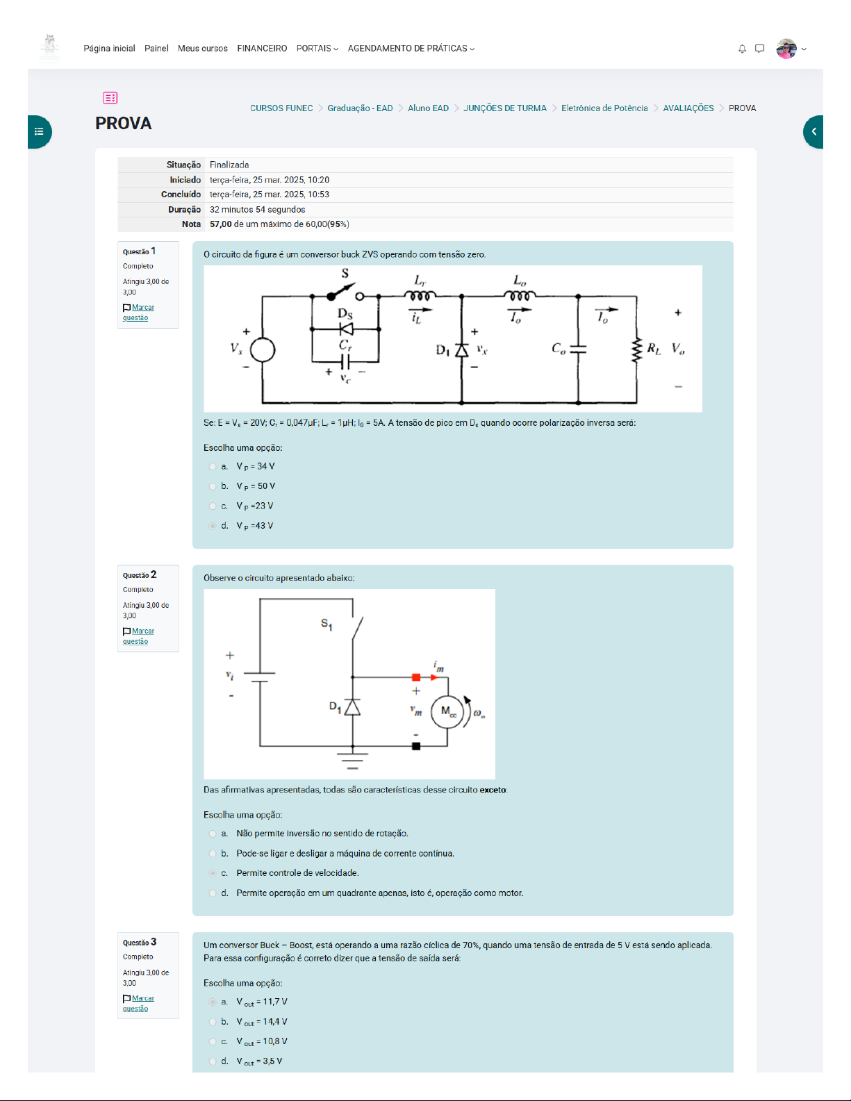 Página inicial Painel Meus cursos FINANCEIRO PORTAIS AGENDAMENTO DE PRÁTICAS CURSOS FUNEC Graduação EAD Aluno EAD JUNÇÕES DE TURMA Eletrônica de Potência AVALIAÇÕES PROVA PROVAQuestão 4 Um conversor Boost, está operando com uma razão de 90% quando alimentado por uma tensão de entrada de 12V.Nestas Completo condições a tensão medida na saída será: Atingiu de 3.00 Escolha uma opção: Marcar a. V out = 14,4 questão b. V out = 100 C. V out = d. V out = 120 V Questão 5 o circuito da figura é um conversor buck ZVS operando com tensão zero. Completo S Atingiu 3,00 de L, 3,00 000 Marcar questão Ds is 10 + + + C, D1 Vx Co - + e são, respectiamente: Escolha uma opção: b. rad d. Questão 6 o dispositivo representado abaixo é conhecido como: Completo Atingiu 3,00 de A2(MT2) Marcar questão G Escolha uma opção: a. tiristor. b. transistor. amplificador d. triac. Questão 7 Segundo as definições dos circuitos de disparo de tiristores e circuitos de controle de potência, qual das opções abaixo está correta? Completo Atingiu 3,00 de Escolha uma opção: 3,00 a. o objetivo do estágio de ataque de um circuito de disparo de tiristores é atacar o tiristor com características de fonte de Marcar tensão e impedir que uma tensão positiva atinja a junção gatilho-catodo. questão b. A ponte trifásica completa é empregada quando se deseja a atuação em quatro quadrantes, em que a emissão de distorção harmônica depende da relação direta entre o torque resistente e o entreferro da máquina elétrica Na sincronização do retificador monofásico de onda completa, a cada semiciclo um pulso de comando é levado aos quatrotiristores, sendo que somente aquele que estiver inversamente polarizado entrará em d. A ponte trifásica completa é empregada quando se deseja a atuação em dois quadrantes, sendo que esta opera como retificador para ângulos de disparo compreendidos entre 0 e 90° e opera como inversor entre os ângulos de 90° e Questão 8 Marque a alternativa correta, sabendo que, um tiristor do tipo SCR, ou seja, retificador controlado de silício: Completo Atingiu 3,00 de Escolha uma opção: 3,00 a. é utilizado com mais frequência em circuitos de baixas correntes. Marcar questão b. em condição normal de operação, pode ser atravessado por correntes de mesma magnitude nos dois sentidos. não pode ter sua corrente bloqueada por ação própria após ser polarizado diretamente e disparado. d. normalmente possui quatro terminais. Questão 9 Um resistor de carga de 10W, está acoplado na saída de um circuito retificador de meia onda, que está sendo alimentado por uma Completo tensão eficaz de 12V. Nestas condições a tensão é correto afirmar que a corrente eficaz na saída será: Atingiu 3,00 de 3,00 Escolha uma opção: Marcar a. out 0,38 A questão b. Lout 0,85 A C. out 85 mA d. out 0,60 A Questão 10 A capacidade de chaveamento de corrente e a velocidade de comutação dos dispositivos semicondutores de potência varia Completo conforme a sua construção e aplicação. Com relação a frequência de comutação típica de alguns tipos de tiristores, a ordem Atingiu 3,00 de crescente da frequência é: 3,00 Marcar Escolha uma opção: questão a. MOSFET, IGBT, SCR e GTO. b. GTO, IGBT, MOSFET e SCR. C. IGBT, GTO, SCR e MOSFET. d. SCR, GTO, IGBT e MOSFET. Questão 11 Analise o circuito abaixo: Completo Atingiu 3,00 de 3,00 Marcar questão VRG VL1 220V 60Hz D1 VAK TIC VGK Considerando o circuito, é correto afirmar que: Escolha uma opção: a. o tiristor utilizado no controle da lâmpada é unidirecional em relação à passagem da corrente elétrica. b. o controle do ângulo de disparo é proporcionado pelo diodo e o quanto maior o ângulo de disparo, maior a tensão média sobre a carga. d. é possível variar o ângulo de disparo do tiristor até 180°. Questão 12 Analise o circuito abaixo: Completo +12V Atingiu 3,00 de Relê 3,00 Circuito LP1 LP2 LP3 de alarme Marcar questão Reset10k 10k 10k In 1 In 2 In 3 A denominação dada aos tiristores presentes no sistema de alarme é: Escolha uma opção: a. TRIAC b. Diodo Schockley C. DIAC d. SCS Questão 13 Com relação ao SCR, considere: Completo É um tiristor unidirecional. Atingiu 3,00 de 3,00 o terminal gate pode ser usado para dispará- lo, fazendo com que o SCR entre em condução. Marcar Após o disparo e a retirada da corrente de gate, o SCR permanece em condução desde que a corrente de anodo não seja nula. questão É correto o que consta em: Escolha uma opção: a. I, apenas. b. II, apenas. C. II, apenas. d. I, III. Questão 14 Analise o circuito mostrado na figura. Completo Atingiu 3,00 de 3,00 Marcar + C Vcc cc Vi + Vo o circuito é: Escolha uma opção: a. Um conversor Buck ZVS b. Um Inversor pseudo-ressonante C. Um conversor Buck ZCS d. Um conversor pseudo-ressonante Questão 15 Considere um conversor Buck quase-ressonante, ZCS como apresentado na figura. Completo Atingiu 3,00 de 3,00 Marcar i, questão + + + V. C, R1Se a corrente de comutação do circuito for zero. Os valores para e são, respectivamente: Escolha uma opção: rad rad rad Questão 16 Enumere a coluna relacionando os dispositivos semicondutores de potência com as respectivas características indicadas a seguir: Completo 1. Dispositivo de três terminais que apresenta entrada em condução controlada por gatilho e bloqueio não controlado. Atingiu 3,00 de 3,00 2. Tiristor bidirecional. Marcar 3. Transistor de potência que conjuga vantagens dos transistores de junção e de efeito de campo. questão 4. Tiristor com bloqueio controlado por gatilho. ( TRIAC. ( SCR. ( GTO. ( IGBT. Assinale a alternativa que apresenta a numeração correta na coluna anterior, de cima para baixo. Escolha uma opção: a. 1-4-2-3 b. 2-1-4-3 1-2-3-4 d. 2-1-3-4 Questão 17 Considere um conversor de meia ponte onda quadrada que está operando à uma razão de quando uma tensão de entra Completo de 48 V está sendo aplicada por cada fonte de a
