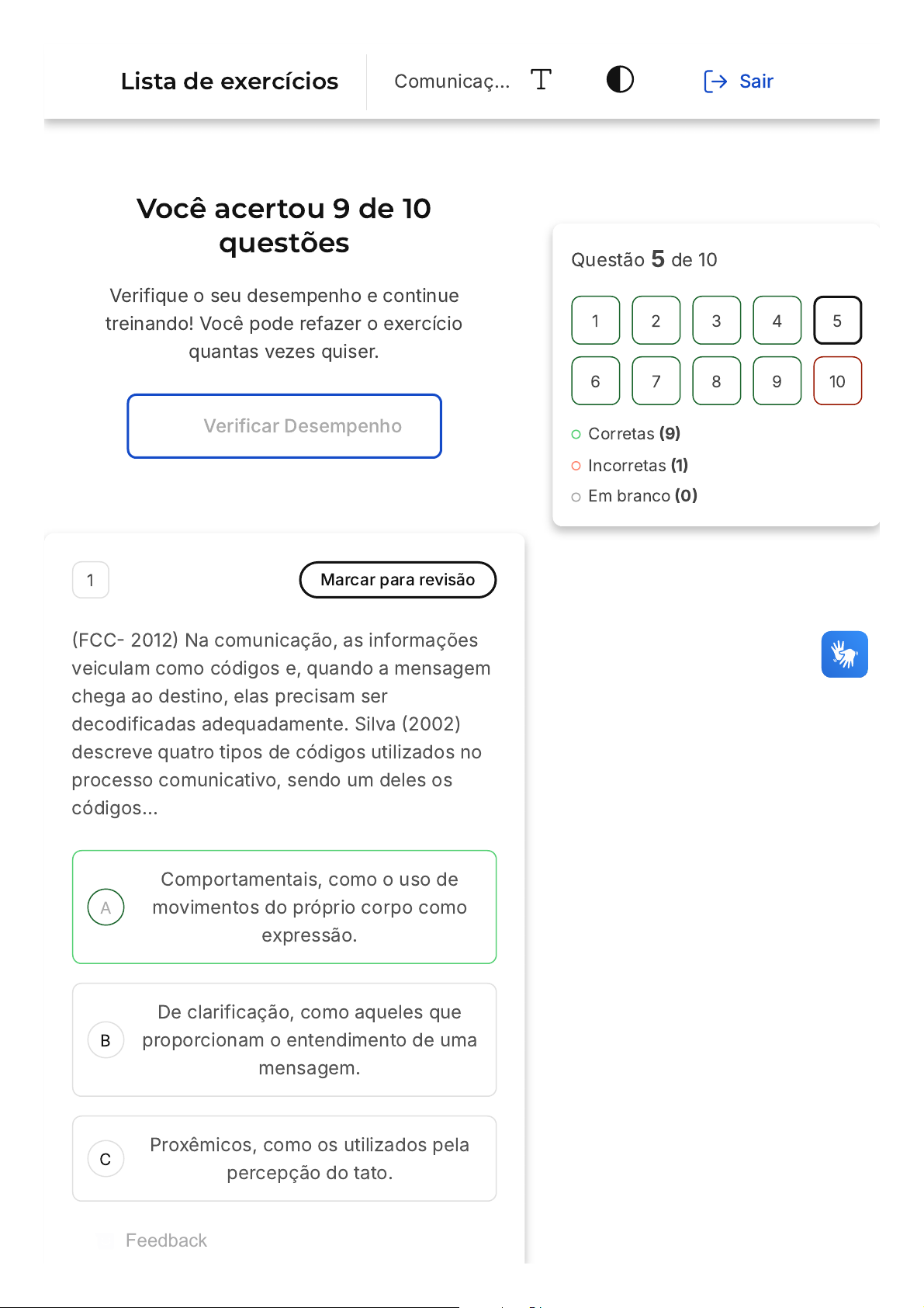 Você acertou 9 de 10 questões Verifique o seu desempenho e continue treinando! Você pode refazer o exercício quantas vezes quiser. Verificar Desempenho A B C 1 Marcar para revisão (FCC- 2012) Na comunicação, as informações veiculam como códigos e, quando a mensagem chega ao destino, elas precisam ser decodificadas adequadamente. Silva (2002) descreve quatro tipos de códigos utilizados no processo comunicativo, sendo um deles os códigos... Comportamentais, como o uso de movimentos do próprio corpo como expressão. De clarificação, como aqueles que proporcionam o entendimento de uma mensagem. Proxêmicos, como os utilizados pela percepção do tato. Questão 5 de 10 Corretas (9) Incorretas (1) Em branco (0) 1 2 3 4 5 6 7 8 9 10 Lista de exercícios Comunicaç… Sair Feedback D E Tacêsicos, como aqueles que revelam a distância estabelecida pelos interlocutores. Da paralinguagem, como expressões da face e formas de olhar. Resposta correta Parabéns, você selecionou a alternativa correta. Confira o gabarito comentado! Gabarito Comentado De acordo com Silva (2002), um dos tipos de códigos utilizados no processo comunicativo são os códigos comportamentais. Esses códigos são expressos por meio de movimentos do próprio corpo. Portanto, a alternativa correta é "Comportamentais, como o uso de movimentos do próprio corpo como expressão". 2 Marcar para revisão (Adaptada de: TSE/2006) Um profissional de enfermagem, durante o plantão, ouviu que um paciente gemia. Resolveu verificar o que estava acontecendo e percebeu que ele se movia no leito, estava inquieto e com uma expressão facial de dor. Nessa situação, a comunicação não verbal de gemidos, movimentos corporais e expressões faciais que transmitiram a mensagem de dor envolveram respectivamente as técnicas de: A B C D E Paralinguagem, cinestesia e cinestesia. Cinestesia, paralinguagem e proxemia. Proxemia, toque e proxemia. Paralinguagem, cinestesia e paralinguagem. Linguagem verbal e distância íntima. Resposta correta Parabéns, você selecionou a alternativa correta. Confira o gabarito comentado! Gabarito Comentado A alternativa correta é a letra A, que indica "Paralinguagem, cinestesia e cinestesia". A paralinguagem se refere a aspectos não verbais da comunicação, como o tom de voz, a entonação e outros sons que não formam palavras, como os gemidos do paciente. A cinestesia se refere à percepção do movimento e da posição do corpo, que neste caso, é representada pelos movimentos corporais e expressões faciais do paciente. Portanto, a comunicação não verbal do paciente envolveu essas duas técnicas. A B C D E 3 Marcar para revisão Em um hospital, João, um estudante de enfermagem oriundo de uma comunidade de baixa renda, enfrenta o desafio de se comunicar de maneira efetiva com pacientes de diversas origens sociais e culturais. Ele reconhece que aprimorar suas habilidades de comunicação é vital tanto para o cuidado dos pacientes quanto para seu próprio desenvolvimento profissional. Qual seria a melhor abordagem para João melhorar suas habilidades de comunicação com os pacientes, promovendo um cuidado mais eficiente e empático? Concentrar-se exclusivamente no desenvolvimento de habilidades técnicas. Comunicar-se utilizando apenas termos técnicos. Esforçar-se para entender a linguagem corporal e as preocupações dos pacientes, adaptando sua comunicação. Desconsiderar as diferenças culturais, adotando uma abordagem padronizada. Restringir a comunicação ao mínimo necessário para acelerar o atendimento. Resposta correta Parabéns, você selecionou a alternativa correta. Confira o gabarito comentado! Gabarito Comentado Na enfermagem, as habilidades técnicas são fundamentais, mas a comunicação eficaz é o que realmente facilita o cuidado integral do paciente. Utilizar termos técnicos pode demonstrar conhecimento, porém, é crucial que a comunicação seja adaptada para garantir a compreensão do paciente, criando uma atmosfera de confiança. Compreender a linguagem corporal e as preocupações dos pacientes, além de adaptar a comunicação para ser mais acessível e empática, é essencial para estabelecer uma relação terapêutica eficaz, promovendo a recuperação e o bem-estar. Embora reconhecer e respeitar as diferenças culturais seja importante, uma abordagem de comunicação não deve ser uniformizada, mas sim personalizada para cada paciente. Limitar a comunicação pode enfraquecer a relação enfermeiro- paciente e não contribui para um cuidado eficiente e empático. Portanto, a capacidade de João de ajustar sua comunicação, mostrando empatia e compreensão, não apenas melhorará os resultados do paciente, mas também facilitará seu crescimento profissional no ambiente hospitalar. 4 Marcar para revisão (Semad - 2007) A comunicação não verbal é importante na relação entre o enfermeiro e o A B C D E paciente. A cinestesia é uma técnica de comunicação não verbal que se refere a: Choros, risos e gemidos. Sons emitidos pela boca, como um estalar da língua. Expressões faciais, postura, gestos e movimentos corporais. Uso e relação do espaço para a comunicação. Estímulo tátil com o objetivo de contato. Resposta correta Parabéns, você selecionou a alternativa correta. Confira o gabarito comentado! Gabarito Comentado A cinestesia é uma técnica de comunicação não verbal que se refere às expressões faciais, postura, gestos e movimentos corporais. Esses elementos são essenciais na comunicação, especialmente na relação entre o enfermeiro e o paciente, pois podem transmitir informações importantes sobre o estado emocional e físico do paciente, além de demonstrar empatia e compreensão por parte do profissional de saúde. Portanto, a alternativa correta é a C: A B C D E "Expressões faciais, postura, gestos e movimentos corporais". 5 Marcar para revisão Carlos é um aluno universitário que frequentemente se sente sobrecarregado p