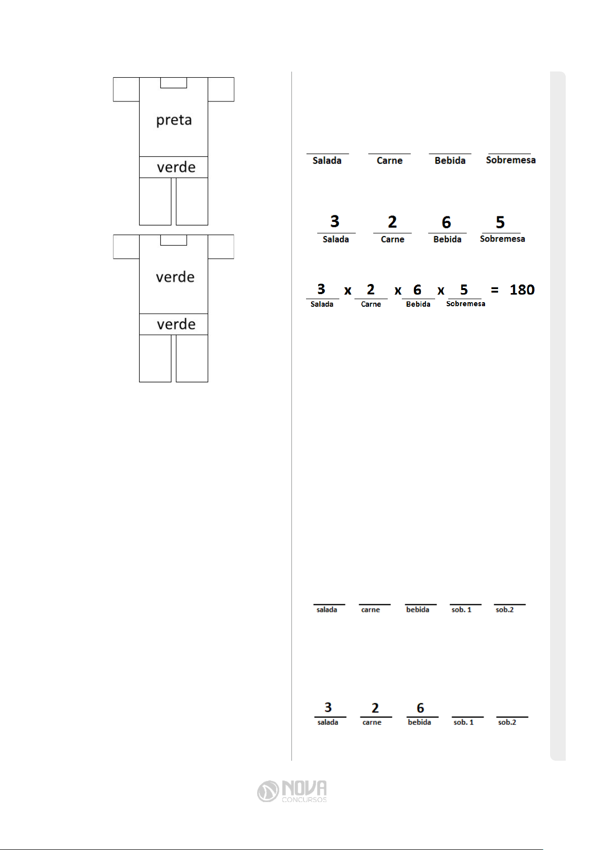 37 RA CI O CÍ N IO L Ó G IC O Como são 3 casos para cada bermuda, temos um to- tal de 6 possibilidades. Até este ponto, o leitor acha que contagem é fácil, mas agora, vamos “complicar” um pouco. Imagine que agora você tenha 5 camisetas diferentes, 3 bermudas diferentes, além de 3 tênis diferentes, quan- tas maneiras distintas você poderá se vestir? É possível resolver este problema com o procedimen- to anterior mas levará um bom tempo para contar todas as soluções. Mas, se nós queremos apenas a quantidade total, sem a necessidade de lista-las, será que não tem um meio mais fácil? A resposta é sim e você verá a seguir. PRINCÍPIO MULTIPLICATIVO O princípio fundamental da contagem permite quan- tificar situações ou casos de uma determinada situação ou evento. Em outras palavras, é uma maneira sistemáti- ca de “contar” a quantidade de “coisas”. A base deste princípio se dá pela separação de ca- sos e quantificação dos mesmos. Após isso, uma mul- tiplicação de todos estes números é feita para achar a quantidade total de possibilidades. O exemplo a seguir irá ilustrar isso. “ João foi almoçar em um restaurante no centro da cidade, ao chegar no local, percebeu que oferecem 3 ti- pos de saladas, 2 tipos de carne, 6 bebidas diferentes e 5 sobremesas diferentes. De quantas maneiras distintas ele pode fazer um pedido, pegando apenas 1 tipo de cada alimento? ” Resolução: O princípio da contagem depende forte- mente de uma organização do problema. A sugestão é sempre organizar cada caso em traços e preenchendo a quantidade de possibilidades. Como temos 4 casos dis- tintos (salada, carne, bebida e sobremesa), iremos fazer 4 traços: Agora, preencheremos a quantidade de possibilida- des de cada caso: Finalmente, multiplicamos os números: Assim, João tem 180 possibilidades diferentes de se montar um prato. Agora que aprendeu o princípio multiplicativo, você consegue resolver o exemplo das camisetas, bermudas e tênis da seção anterior? Se temos 5 camisetas, 3 bermudas e 3 tênis distintos, a quantidade de jeitos de se vestir será 5𝑥3𝑥3 = 45 . Os problemas de princípio multiplicativo são simples quando os grupos são fáceis de se identificar e se retira apenas 1 elemento de cada grupo. Agora, vamos apro- fundar um pouco mais, considerando que podemos tirar mais de um elemento por grupo. Veja o exemplo do res- taurante novamente, mas com uma pergunta diferente: “João foi almoçar em um restaurante no centro da cidade, ao chegar no local, percebeu que oferecem 3 ti- pos de saladas, 2 tipos de carne, 6 bebidas diferentes e 5 sobremesas diferentes. De quantas maneiras distintas ele pode fazer um pedido, pegando 1 salada, 1 carne, 1 bebida e 2 sobremesas diferentes? ” Resolução: Agora, a montagem do problema ganha uma atenção especial pois não iremos retirar apenas 1 elemento do grupo sobremesa, e sim 2. Neste caso, a montagem fica desta maneira: Temos que adicionar uma linha, referente a segunda sobremesa e diferenciar da primeira, já que o enunciado fala que são sobremesas diferentes. Em relação aos valo- res a serem colocados, os grupos salada, carne e bebida seguem a mesma linha do exercício anterior, tirando 1 elemento de cada, logo: Para a primeira sobremesa, temos a 5 disponíveis, logo: 38 RA CI O CÍ N IO L Ó G IC O Já para a segunda sobremesa, devemos ficar atentos ao enunciado pois ele trata as mesmas como diferentes, ou seja, a que foi retirada anteriormente não pode entrar na contagem, assim, ao invés de 5 possibilidades, a se- gunda sobremesa terá 4, logo: Com tudo organizado, basta aplicar o princípio mul- tiplicativo: Ou seja, 720 maneiras de se montar um prato. Outra variação dos problemas de princípio multipli- cativo são os que possuem alguma restrição, ou seja, al- guns casos devem ser descartados por não atenderem algum critério dado no enunciado. Veja o exemplo: “Uma empresa de propaganda pretende criar panfle- tos coloridos para divulgar certo produto. O papel pode ser laranja, azul, preto, amarelo, vermelho ou roxo, en- quanto o texto é escrito no panfleto em preto, vermelho ou branco. De quantos modos distintos é possível esco- lher uma cor para o fundo e uma cor para o texto se, por uma questão de contraste, as cores do fundo e do texto não podem ser iguais? ” Resolução: O problema parece seguir o mesmo pa- drão do princípio multiplicativo, onde se separa os gru- pos e faz a multiplicação. Porém temos uma restrição onde não podemos ter papel e letra do texto iguais. Para resolver este problema a estratégia é simples: Calcula- -se o total de casos, sem restrições, depois quantifica a quantidade de casos que não podem ser contabilizados e realiza-se a subtração. Veja como fica: Sem restrições, temos 18 possibilidades. Olhando as cores dos papéis e dos textos, percebe-se que não se pode escolher o papel preto com o texto preto e o papel vermelho e o texto vermelho, o que totaliza 2 restrições. Logo, o número de casos possíveis será o total subtraído das restrições: 18-2=16. FATORIAL Antes de definirmos casos particulares de contagem, iremos definir uma operação matemática que será uti- lizada nas próximas seções: o fatorial. Define-se o sinal de fatorial pelo ponto de exclamação, ou seja, “!“. Assim, quando encontrarmos 2! Significa que estaremos calcu- lando o “fatorial de 2” ou “2 fatorial”. A definição de fato- rial está apresentada a seguir: n! = n ⋅ n − 1 ⋅ n − 2 ⋅ n − 3 … 3 ⋅ 2 ⋅ 1 Ou seja, o fatorial de um número é caracterizado pelo produto deste número e seus antecessores, até se chegar ao número 1. Vejam os exemplos abaixo: 3! = 3 ⋅ 2 ⋅ 1 = 6 5! = 5 ⋅ 4 ⋅ 3 ⋅ 2 ⋅ 1 = 120 Assim, basta ir multiplicando os números até se che- gar ao número 1. Observe que os fatoriais aumentam muito rápido, veja quanto é 10!: 10! = 10 ⋅ 9 ⋅ 8 ⋅ 7 ⋅ 6 ⋅ 5 ⋅ 4 ⋅ 3 ⋅ 2 ⋅