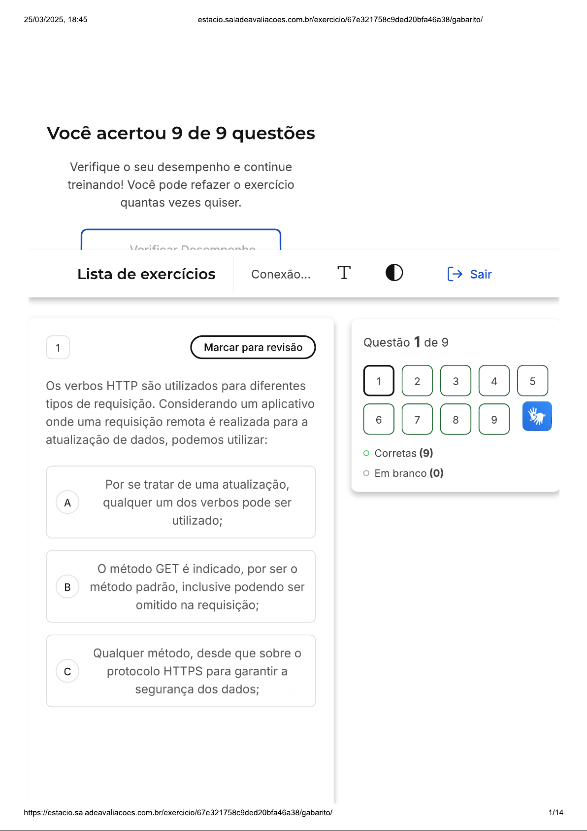 25/03/2025, 18:45 Você acertou 9 de 9 questões Verifique o seu desempenho e continue treinando! Você pode refazer o exercício quantas vezes quiser. Lista de exercícios Conexão... T Sair Marcar para revisão Questão 1 de 9 1 Os verbos HTTP são utilizados para diferentes 1 2 3 4 5 tipos de requisição. Considerando um aplicativo onde uma requisição remota é realizada para a 6 7 8 9 atualização de dados, podemos utilizar: Corretas (9) Em branco (0) Por se tratar de uma atualização, A qualquer um dos verbos pode ser utilizado; método GET é indicado, por ser o B método padrão, inclusive podendo ser omitido na requisição; Qualquer método, desde que sobre o C protocolo HTTPS para garantir a segurança dos dados; 1/1425/03/2025, 18:45 Podem ser usados os verbos POST ou PUT, sendo este último o mais D recomendado, além de utilizado para esse fim; Podem ser usados os verbos GET ou E POST; Resposta correta Parabéns, você selecionou a alternativa correta. Confira o gabarito comentado! Gabarito Comentado Os verbos HTTP são métodos de requisição que indicam a ação a ser realizada para um determinado recurso. Neste caso, estamos falando sobre a atualização de dados em um aplicativo. Para isso, os verbos mais adequados são POST e PUT. verbo POST é geralmente usado para enviar dados para serem processados por um recurso, enquanto o PUT é usado para atualizar um recurso existente. Embora o POST possa ser usado em algumas situações para atualizar dados, o PUT é o método mais recomendado para essa finalidade, pois ele foi projetado especificamente para atualizar recursos existentes. Portanto, a alternativa correta é a D. 2 Marcar para revisão A utilização de conteúdo externo, disponível através de APIs de terceiros, ou de nossas 2/1425/03/2025, 18:45 próprias APIs, permite incrementar as funcionalidades disponíveis em um aplicativo mobile. Dentre os recursos disponíveis em React Native para a realização dessa comunicação, podemos afirmar: Novas bibliotecas precisam ser instaladas para permitir que nosso A aplicativo se comunique com outras APIs. framework React Native dispõe de B recursos nativos para a realização de conexão remota. As requisições realizadas são sempre, C e somente, síncronas. As requisições entre o aplicativo e o D servidor remoto utilizam um protocolo proprietário. Os dados transferidos precisam ser criptografados no aplicativo, já que E não podem transitar sobre conexões seguras. Resposta correta Parabéns, você selecionou a alternativa correta. Confira o gabarito comentado! Gabarito Comentado React Native possui, de forma nativa, um componente chamado Fetch API que permite a conexão com recursos remotos. Isso significa que não é necessário instalar 3/1418:45 novas bibliotecas para permitir que o aplicativo se comunique com outras APIs, como afirmado na alternativa A. Além disso, as requisições não são sempre síncronas, como mencionado na alternativa C, e não utilizam um protocolo proprietário, como sugerido na alternativa D. Por fim, os dados transferidos não precisam ser necessariamente criptografados no aplicativo, pois podem transitar sobre conexões seguras, contrariando a alternativa E. Portanto, a alternativa correta é a B, que afirma que o framework React Native dispõe de recursos nativos para a realização de conexão remota. 3 Marcar para revisão O HTTP é um protocolo da camada de Aplicação do modelo OSI (acrônimo do inglês Open System Interconnection). O HTTP, base para a comunicação Web, define em sua estrutura um conjunto de métodos de requisição. Marque a opção abaixo que corresponda a um dos métodos HTTP: A PUT B IMAP C STP 4/1425/03/2025, 18:45 D POP E RSTP Resposta correta Parabéns, você selecionou a alternativa correta. Confira o gabarito comentado! Gabarito Comentado O protocolo HTTP, que é a base para a comunicação na Web, define uma série de métodos de requisição que são usados para realizar ações específicas. Entre esses métodos, temos o PUT, que é usado para atualizar recursos existentes ou criar novos. Outros métodos comuns incluem GET, que é usado para solicitar dados de um recurso específico, e POST, que é usado para enviar dados para serem processados por um recurso específico. Nesse caso, a alternativa correta é a "A", que menciona o método PUT, um dos métodos de requisição definidos pelo protocolo HTTP. 4 Marcar para revisão Assinale, dentre as opções abaixo, a alternativa que representa o conjunto de elementos normalmente presentes em requisições realizadas com controle de acesso utilizando o framework OAuth2: 5/1425/03/2025, 18:45 Aplicativo cliente, Servidor de Recurso A externo/API, Servidor de autorização, Token; B Usuário, senha, e-mail; C LDAP, HTTPS, SSL; SSO, Servidor de Criptografia, D Algoritmo de Criptografia; Chave Privada, Chave Pública, E Aplicativo Cliente, Servidor de Aplicação. Resposta correta Parabéns, você selecionou a alternativa correta. Confira o gabarito comentado! Gabarito Comentado framework OAuth2 utiliza um conjunto de elementos para realizar requisições com controle de acesso. Nesse contexto, o Aplicativo Cliente é o software que faz a requisição, o Servidor de Recurso Externo/API é o sistema que disponibiliza os recursos que serão acessados, o Servidor de Autorização é o componente que autentica o cliente e emite o Token, que é uma credencial de acesso. Portanto, a alternativa correta é a A, que menciona todos esses elementos. 6/1425/03/2025, 18:45 5 Marcar para revisão Dentre os elementos-chave em uma conexão remota, considerando o lado cliente, ou seja, o aplicativo, encontram-se: XMLHttpRequest, JSON (ou XML), A Flatlist B WSDL, SOAP, Rest C HTML, CSS, Javascript D Java, PHP, ASP.Net E Webservice, API, Restful Resposta correta Parabéns, você selecionou a alternativa correta. Confira o gabarito comentado! Gabarito Comentado Na alternativa correta, temos três elementos funda