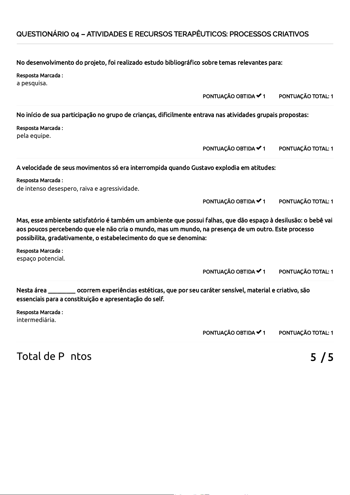 5 / 5 QUESTIONÁRIO 04 – ATIVIDADES E RECURSOS TERAPÊUTICOS: PROCESSOS CRIATIVOS PONTUAÇÃO TOTAL: 1PONTUAÇÃO OBTIDA 1 No desenvolvimento do projeto, foi realizado estudo bibliográfico sobre temas relevantes para: Resposta Marcada : a pesquisa. PONTUAÇÃO TOTAL: 1PONTUAÇÃO OBTIDA 1 No início de sua participação no grupo de crianças, dificilmente entrava nas atividades grupais propostas: Resposta Marcada : pela equipe. PONTUAÇÃO TOTAL: 1PONTUAÇÃO OBTIDA 1 A velocidade de seus movimentos só era interrompida quando Gustavo explodia em atitudes: Resposta Marcada : de intenso desespero, raiva e agressividade. PONTUAÇÃO TOTAL: 1PONTUAÇÃO OBTIDA 1 Mas, esse ambiente satisfatório é também um ambiente que possui falhas, que dão espaço à desilusão: o bebê vai aos poucos percebendo que ele não cria o mundo, mas um mundo, na presença de um outro. Este processo possibilita, gradativamente, o estabelecimento do que se denomina: Resposta Marcada : espaço potencial. PONTUAÇÃO TOTAL: 1PONTUAÇÃO OBTIDA 1 Nesta área _________ ocorrem experiências estéticas, que por seu caráter sensível, material e criativo, são essenciais para a constituição e apresentação do self. Resposta Marcada : intermediária. Total de Pontos