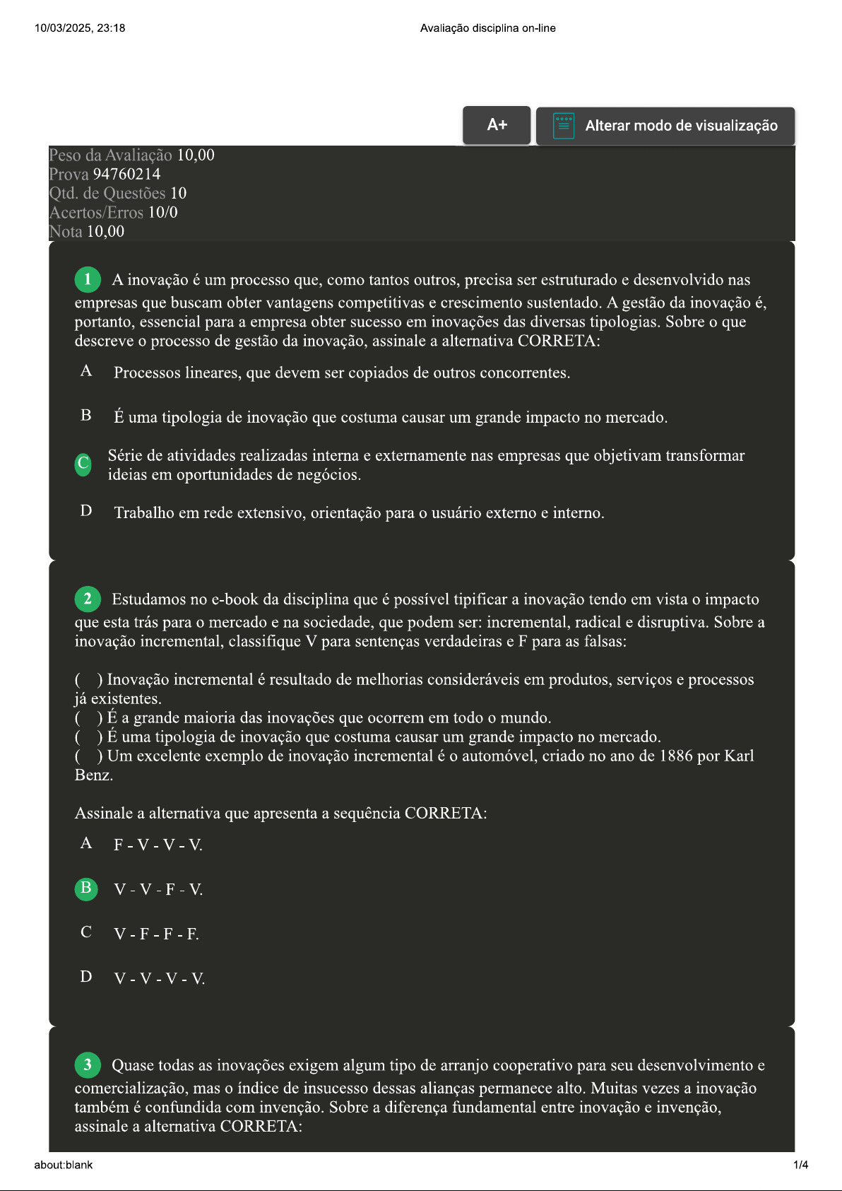 10/03/2025. 23:18 Avaliação disciplina on-line A+ Alterar modo de visualização Peso da Avaliação 10,00 Prova 94760214 Qtd. de Questões 10 Acertos/Erros 10/0 Nota 10,00 1 A inovação é um processo que, como tantos outros, precisa ser estruturado e desenvolvido nas empresas que buscam obter vantagens competitivas e crescimento sustentado. A gestão da inovação é, portanto, essencial para a empresa obter sucesso em inovações das diversas tipologias. Sobre que descreve processo de gestão da inovação, assinale a alternativa CORRETA: A Processos lineares, que devem ser copiados de outros concorrentes. B É uma tipologia de inovação que costuma causar um grande impacto no mercado. Série de atividades realizadas interna e externamente nas empresas que objetivam transformar ideias em oportunidades de negócios. D Trabalho em rede extensivo, orientação para usuário externo e interno. 2 Estudamos no e-book da disciplina que é possível tipificar a inovação tendo em vista impacto que esta trás para mercado e na sociedade, que podem ser: incremental, radical e disruptiva. Sobre a inovação incremental, classifique V para sentenças verdadeiras e F para as falsas: ( ) Inovação incremental é resultado de melhorias consideráveis em produtos, serviços e processos já existentes. ( ) É a grande maioria das inovações que ocorrem em todo mundo. ( ) É uma tipologia de inovação que costuma causar um grande impacto no mercado. ( ) Um excelente exemplo de inovação incremental é automóvel, criado no ano de 1886 por Karl Benz. Assinale a alternativa que apresenta a sequência CORRETA: A B V-V-F-V C D 3 Quase todas as inovações exigem algum tipo de arranjo cooperativo para seu desenvolvimento e comercialização, mas índice de insucesso dessas alianças permanece alto. Muitas vezes a inovação também é confundida com invenção. Sobre a diferença fundamental entre inovação e invenção, assinale a alternativa CORRETA: about:blank 1/410/03/2025, 23:18 Avaliação disciplina on-line A Invenções trazem competitividade para as organizações. B A maioria das empresas geram valor a partir das invenções. C Inovação proporciona valor e retorno financeiro para as organizações. D Invenção não resulta em valor e retorno financeiro para as organizações. 4 O economista e professor de Harvard e Berkeley (EUA), Henry Chesbrough, afirma que as organizações devem adaptar-se a um novo ambiente, e tentar fazer bom uso dos conhecimentos externos para inovar, sendo muito importante, portanto, não utilizar apenas conhecimentos internos que estão disponíveis na organização. Sobre termo cunhado por Chesbrough em 2003 para designar a tipologia de inovação que utiliza basicamente conhecimentos externos, assinale a alternativa CORRETA: FONTE: CHESBROUGH, H. W. Open Innovation: The New Imperative for Creating and Profiting from Technology. Brighton, Massachussets (USA): Harvard Business Press, 2003. A Inovação disruptiva. B Open knowledge. C Open innovation. D Inovação sustentável. 5 No nosso e-book, verificamos que a inovação é um processo repleto de incertezas e de difícil execução, sendo muito importante que haja recursos humanos bem capacitados e uma liderança que apoia e estimula a aprendizagem e conhecimento. além de uma estratégia de inovação bem definida. Para melhor compreender a dificuldade que envolve a inovação, utilizamos uma metáfora, figura de linguagem que utiliza uma comparação para melhor compreender um conceito ou fato. Sobre essa metáfora, assinale a alternativa CORRETA: A Metáfora do computador. B Metáfora do avião. Metáfora do foguete. D Metáfora do submarino. 6 Um ótimo exemplo de inovação é a NETFLIX, que com avanço da tecnologia de streaming pela internet estabeleceu um novo mercado para consumidores de filmes e séries, causando uma grande mudança na forma como as pessoas se divertem em frente à Televisão. Sobre exposto, qual é a tipologia correta desta inovação, frequentemente confundida com a inovação radical? A Inovação incremental. about:blank 2/410/03/2025, 23:18 Avaliação disciplina on-line B Inovação de marketing. C Inovação organizacional. D Inovação disruptiva. 7 A Inovação aberta ou Open Innovation (CHESBROUGH, 2003) é uma tipologia de inovação bastante interativa. Sobre exposto, assinale a alternativa CORRETA: FONTE: H. W. Open Innovation: The New Imperative for Creating and Profiting from Brighton, Massachussets (USA): Harvard Business Press, 2003. A Não é mais utilizado pelas empresas para inovar. B Privilegia a colaboração da empresa com outros atores do ecossistema para inovar. C Desenvolve-se a partir dos conhecimentos internos. D Foca no conhecimento interno e competências dos funcionários. 8 Empresas inovadoras devem estar em constante evolução em processos diversos, como comunicação e aprendizagem. Além disso, uma característica fundamental, é a estrutura apropriada que está relacionada a algumas ações. Sobre as ações para que a empresa inovadora desenvolva uma estrutura apropriada, assinale a alternativa CORRETA: A Incentivar a centralização e tolerância zero ao erro. B Deverá manter foco no modelo linear e pouca tolerância ao erro. Estimular a criatividade, aprendizado e a interação, encontrar equilíbrio entre modelo orgânico e mecânico. D Estimular a centralização e modelo linear. 9 A inovação "é passível de ser apresentada como uma disciplina, passível de ser aprendida, passível de ser praticada" (DRUCKER, 1987, p. 86). Ampliando a definição de Drucker, a inovação pode ser compreendida a partir dos modelos, que evoluíram ao longo do tempo. Acerca do exposto, classifique V para as sentenças verdadeiras e F para as falsas: ( ) As inovações eram "empurradas" pelas indústrias até a década de 1970. ( ) As TIC (Tecnologias da Informação e Comunicação) influenciaram fortemente os modelos de inovação antes da década de 1