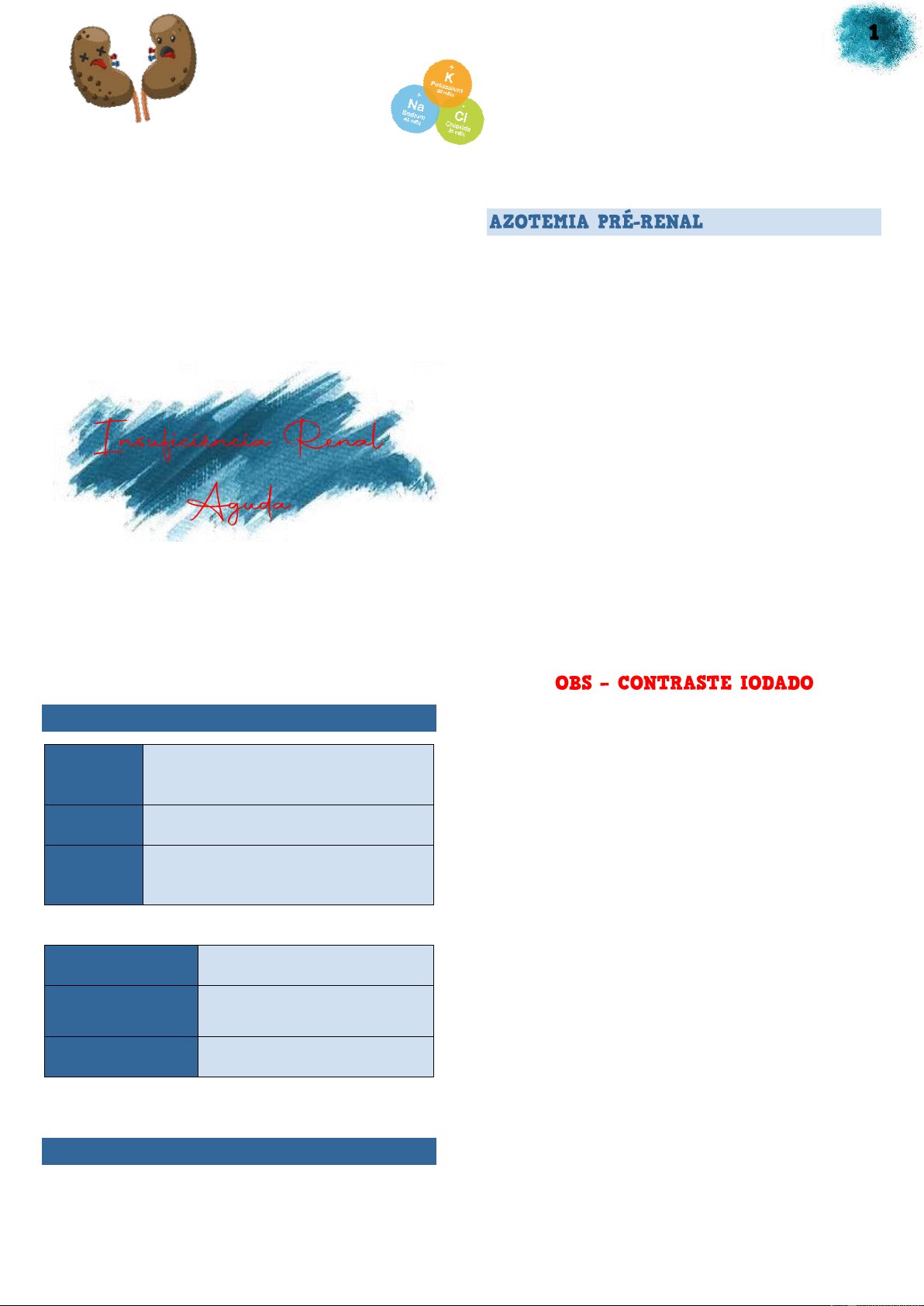 Beatriz Guimarães Junqueira – ASE13P04 – 2019.2 Objetivos 1. Compreender etiologia, fisiopatologia, etiopatogenia, quadro clínico, diagnóstico, diagnóstico diferencial e tratamento da Insuficiência Renal Aguda. 2. Compreender os distúrbios hidroeletrolíticos (sódio e potássio). Causas, quadro clínico, diagnóstico e tratamento. 3. Entender fisiopatologia, quadro clínico, diagnóstico e tratamento dos distúrbios do equilíbrio ácido básico (acidoses metabólica e respiratória e alcaloses metabólica e respiratória). O grupo AKIN (Acute Kidney Injury Network) define LRA como um aumento abrupto da creatinina sérica de 0,3 mg/dL ou aumento da creatinina sérica > 50%, ou o desenvolvimento de oliguria. Oligúria: débito urinário 400-500 ml/24 horas IRA Anúrica Débito Urináriopois tem um gasto energético maior e recebe menor vascularização. As partes mais suscetíveis são: parte reta do túbulo proximal e a porção ascendente espessa da alça de Henle. A NTA isquêmica na verdade faz parte de um mecanismo contínuo, o paciente com isquemia renal evolui de imediato com azotemia pré-renal. Se ela não for corrigida precocemente, a tendência será a evolução para NTA isquêmica. Porque a NTA cursa com IRA? 1. Feedback tubuloglomerular: a mácula densa recebe mais sódio e cloreto, pela menor reabsorção no túbulo proximal, o que induz vasoconstrição da arteríola aferente. 2. Obstrução do sistema tubular por plugs epiteliais. 3. Vazamento de escórias nitrogenadas pela parede tubular desnuda, como retorno das mesmas ao plasma. Em resumo: 1. Alterações estruturais e bioquímicas; 2. Alterações vasculares e/ou celulares; 3. Vasoconstrição, alteração de função e morte celular, descamação do epitélio tubular e obstrução intraluminal, vazamento transtubular glomerular e inflamação. Ocorre na vigência de obstrução das vias urinárias, que pode ser observada em qualquer nível do trato urinário, porém, no acometimento de ureteres, depende da presença de obstrução bilateral. Etiologia ➔ Obstrução Uretral ▪ Congênita: valva uretral posterior, estenose e fimose. ▪ Estenose iatrogênica por cateter de Foley. ▪ Cálculo Uretral. ➔ Obstrução do Colo Vesical e Uretra Prostática ▪ HPB (causa mais comum), CA de próstata e CA de bexiga. Fisiopatologia Após a obstrução a pressão no interior dos túbulos renais aumenta de maneira súbita com produção inicial excessiva de prostaglandinas pelo parênquima renal e aumento da TFG nas primeiras horas. Essas substâncias promovem a vasodilatação da arteríola aferente, aumentando a pressão hidrostática no tufo glomerular e aumentando a filtração. Depois de 12 a 24 horas de obstrução, ocorre síntese progressiva de substâncias vasoconstrito- ras como angiotensina II que levam a redução da TFG. A obstrução persistente provoca a liberação de substâncias quimiotáxicas que atraem células inflamatórias para o epitélio tubular sob efeito da maior pressão luminal. Resultado: nefrite tubulointersticial crônica e fibrose tecidual provocada pelos monócitos e macrófagos infiltrantes. Quadro Clínico Em geral, os sinais e sintomas são devidos à condição clínica causal, como hipovolemia, insuficiência cardíaca, sepse, e outras, não à injúria renal em si. Nas Azotemias mais graves, aparecem sinais e sintomas de insuficiência renal que compõem a chamada Síndrome Urêmica Aguda, a qual é composta por: 1. Acúmulo de toxinas dialisáveis; 2. Hipervolemia; 3. Desequilíbrio hidroeletrolítico e acidobásico. Na IRA, para se desenvolver a síndrome urêmica, geralmente a creatinina está acima de 4 mg/dl e a ureia acima de 120 mg/dl. ➔ Hipertensão Arterial; Beatriz Guimarães Junqueira – ASE13P04 – 2019.2 ➔ Edema Pulmonar, Síndrome de Desconforto Respiratório Agudo (SDRA); ➔ Distúrbio da hemostasia com sangramentos; ➔ Encefalopatia, crise convulsiva, coma; ➔ Hiper-reflexia, asterixis, mioclônus; ➔ Síndrome das pernas inquietas, neuropatia periférica; ➔ Distúrbios eletrolíticos e acidobásico; ➔ Náuseas, vômitos, diarreia e soluços incoercíveis; ➔ Pericardite e tamponamento cardíaco. Manifestações Cardiopulmonares: causados pela hipervolemia aguda, geram HAS, Edema Agudo de Pulmão e Edema Periférico. A HAS é encontrada na IRA oligúrica ou anúrica e pode ser grave e refratária ao tratamento medicamentoso, só respondendo à diálise. A retenção hidrossalina também promove congestão e edema pulmonar cardiogênico, levando à dispneia, ortopneia ou até insuficiência respiratória, as toxinas urêmicas podem aumentar a permeabilidade capilar pulmonar, levando a um componente não cardiogênico de edema pulmonar do tipo SDRA (pulmão urêmico). Manifestações Hematológicas: a uremia aguda cursa com um distúrbio da hemostasia devido à disfunção plaquetária. As plaquetas no paciente urêmico têm menor capacidade de adesão e agregação, com maior tempo de sangramento, disfunção do fator de von willebrand (adesão plaquetária ao colágeno) e depleção do fator III. Como consequência, há maior predisposição ao sangramento. Manifestações Neurológicas: A encefalopatia urêmica aguda caracteriza-se pelo estado de confusão mental, agitação psicomotora, associado à mioclonia (abalos musculares repetitivos), asterixis, hiper-reflexia tendinosa e sinal de Babinski bilateral. O quadro pode evoluir para crise convulsiva tônico-clônica, torpor, coma e óbito por edema cerebral grave. A irritação do nervo frênico propicia o aparecimento de soluços incoercíveis, comuns na uremia aguda. Melhoram com a diálise. Manifestações Gastrointestinais: A uremia provoca inflamação nas mucosas e disfunção na motilidade. Surgem então sintomas como: anorexia, náuseas e vômitos (como consequência à gastroparesia), diarreia ou íleo metabólico. Distúrbios Hidroeletrolíticos e Acidobási- cos: Hipercalemia: s
