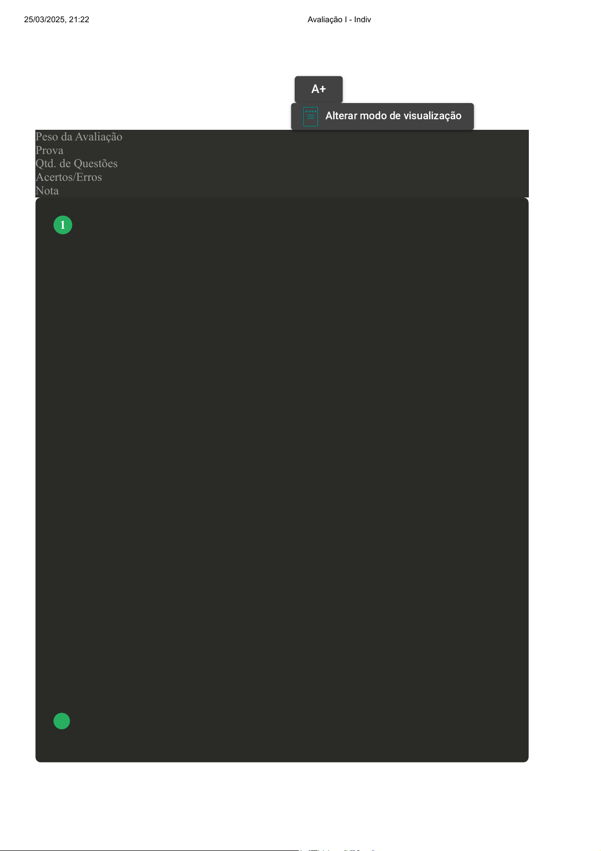 Prova Impressa GABARITO | Avaliação I - Individual (Cod.:987191) Peso da Avaliação 2,00 Prova 89216660 Qtd. de Questões 10 Acertos/Erros 10/0 Nota 10,00 A anemia falciforme é uma doença caracterizada pela alteração no formato dos glóbulos vermelhos. Devido a essa alteração, os glóbulos vermelhos se tornam menos capazes de transportar o oxigênio, além de aumentarem o risco de obstrução dos vasos sanguíneos. Com base no exposto, avalie as asserções a seguir e a relação proposta entre elas: I- A hemoglobina “F” contida na hemácia, colocada em ambiente pobre em oxigênio, cristaliza-se de tal maneira que a hemácia toma forma de uma foice. Utilizamos o teste de falcização auxilia no diagnóstico da anemia falciforme. PORQUE II- Consiste em diluir uma medida metabissulfito de sódio em 5 mL de água destilada, colocar sobre a lâmina de microscopia 1 parte de sangue para 2 partes de metabissulfito de sódio, misturar, adicionar uma lamínula e vedar com esmalte e realizar a leitura no microscópio com objetiva de 40x após 1 hora Assinale a alternativa CORRETA: A As asserções I e II são proposições verdadeiras, mas a II não é uma justificativa da I. B A asserção I é uma proposição verdadeira, e a II é uma proposição falsa. C As asserções I e II são proposições falsas. D A asserção I é uma proposição falsa, e a II é uma proposição verdadeira. VOLTAR A+ Alterar modo de visualização 1 25/03/2025, 21:22 Avaliação I - Individual about:blank 1/8 Essa glicoproteína é produzida pelos rins mais especificamente pelas células adjacentes aos túbulos proximais renais (90%), e pelo fígado também, porém, em menor quantidade (10%). Ela é responsável pela regulação de eritropoeise no homem e animais. Assinale a alternativa CORRETA que corresponde ao nome da glicoproteína mencionada: A Hormônio de Crescimento eritrocitário. B Hormônio do Crescimento. C Eritropoetina. D Calcitriol. Os exames hematológicos, que analisam o sangue, são fundamentais para o monitoramento da saúde, porque mostram a situação dos órgãos hematopoiéticos e as doenças que podem surgir no sangue. O principal exame realizado é o hemograma, que pode detectar as a mais comuns doenças no estudo da hematologia. Sobre os exames que são empregados no setor de hematologia, analise as sentenças a seguir: I- O hemograma completo é o exame mais solicitado na medicina humana, pois avalia as três linhagens celulares em um nível qualitativo e quantitativo no sangue periférico. II- A dosagem do índice eritrocitário hematócrito tem como principal objetivo, junto ao eritrograma avaliar o percentual das hemácias em um volume total de sangue. III- O teste de falcização auxilia no diagnóstico da anemia falciforme. IV- Os reticulócitos carregarem DNA e são liberadas para a corrente sanguínea de maneira precoce pela medula óssea. Assinale a alternativa CORRETA: 2 3 25/03/2025, 21:22 Avaliação I - Individual about:blank 2/8 A As sentenças I, II e III estão corretas. B As sentenças I, II e IV estão corretas. C Somente a sentença II está correta. D As sentenças II, III e IV estão corretas. O sangue é responsável por transportar oxigênio para os tecidos, impedindo o metabolismo anaeróbio da glicose. Ele transporta esse gás principalmente ligado à hemoglobina, constituinte primário das células sanguíneas. Assinale a alternativa CORRETA que corresponde à denominação dessa célula: A Eritrócitos. B Leucócitos. C Plaquetas. D Monócitos. O hemograma completo é o exame que avalia as células que compõem o sangue, como os leucócitos, as hemácias e as plaquetas. Em pacientes cujo quadro sugere anemia, há necessidade de efetuar exames laboratoriais para identificar um diagnóstico mais preciso dentre as diversas causas. Com base no exposto, classifique V para as sentenças verdadeiras e F para as falsas: ( ) A hemoglobina é o índice mais fidedigno para determinar a gravidade da anemia. ( ) O RDW é o índice de anisocitose, avaliando objetivamente a heterogeneidade das hemácias em relação ao seu formato. 4 5 25/03/2025, 21:22 Avaliação I - Individual about:blank 3/8 ( ) Esferócitos são encontrados na anemia hemolítica autoimune, por exemplo. ( ) Esquizócitos são eritrócitos fragmentados, irregularmente contraídos e mordidos, associados às anemias hemolíticas, como na coagulação intravascular disseminada. ( ) Dacriócitos são monócitos em forma de lágrima que aparecem em talassemias e em várias condições, como na aplasia de medula. Assinale a alternativa que apresenta a sequência CORRETA: A F - V - F - F - V. B V - F - V - V - F. C V - F - V - F - F. D V - V - F - V - V. Paciente do sexo feminino, 45 anos de idade, apresentou os seguintes resultados para o hemograma: Hemácias = 4.000.000/mm3 Hemoglobina = 10 g/dL Hematócrito = 30% V.C.M. = 75 fL H.C.M. = 25 pg C.H.C.M. = 33,3 g/dL R.D.W. = 14%. De acordo com o hemograma, classifique as alterações morfológicas dos eritrócitos dessa paciente, depois, classifique V para as sentenças verdadeiras e F para as falsas: ( ) Hemácias normociticas e normocromicas. ( ) Hemácias microciticas e hipocromicas. ( ) Hemácias macrocíticas e hipercromicas . ( ) Hemácias microciticas e hipercromicas. Assinale a alternativa que apresenta a sequência CORRETA: 6 25/03/2025, 21:22 Avaliação I - Individual about:blank 4/8 A F - V - F - F. B F - F - F - V. C F - F - V - F. D V - F - F - F. É um parâmetro laboratorial que avalia o percentual de ocupação de um eritrócito em um grau de volume total da circulação sanguínea, além de ajudar a medir um valor proporcional a molécula de hemoglobina ali circulante. Assinale a alternativa CORRETA que apresenta o parâmetro laboratorial descrito: A Índices hematimétricos. B Dosagem de hematócrito. C Hematimetria. D Contagem de reticulócitos. O sangue possui inúmeras funções, as quais estão associadas aos seus componentes, de