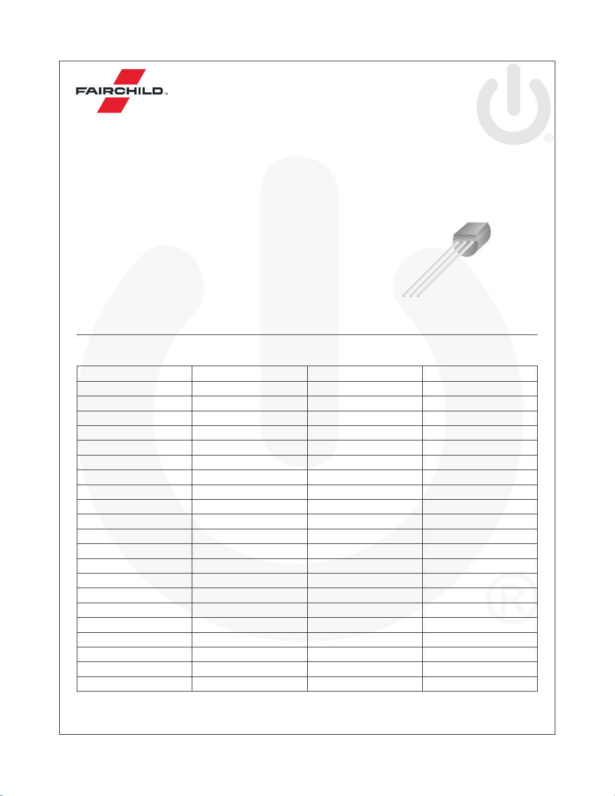 B C 546 / B C 547 / B C 548 / B C 549 / B C 550 — N P N E p itaxial S ilico n Tran sisto r © 2002 Fairchild Semiconductor Corporation www.fairchildsemi.com BC546 / BC547 / BC548 / BC549 / BC550 Rev. 1.1.1 1 November 2014 BC546 / BC547 / BC548 / BC549 / BC550 NPN Epitaxial Silicon Transistor Features • Switching and Amplifier • High-Voltage: BC546, VCEO = 65 V • Low-Noise: BC549, BC550 • Complement to BC556, BC557, BC558, BC559, and BC560 Ordering Information Part Number Marking Package Packing Method BC546ABU BC546A TO-92 3L Bulk BC546ATA BC546A TO-92 3L Ammo BC546BTA BC546B TO-92 3L Ammo BC546BTF BC546B TO-92 3L Tape and Reel BC546CTA BC546C TO-92 3L Ammo BC547ATA BC547A TO-92 3L Ammo BC547B BC547B TO-92 3L Bulk BC547BBU BC547B TO-92 3L Bulk BC547BTA BC547B TO-92 3L Ammo BC547BTF BC547B TO-92 3L Tape and Reel BC547CBU BC547C TO-92 3L Bulk BC547CTA BC547C TO-92 3L Ammo BC547CTFR BC547C TO-92 3L Tape and Reel BC548BU BC548 TO-92 3L Bulk BC548BTA BC548B TO-92 3L Ammo BC548CTA BC548C TO-92 3L Ammo BC549BTA BC549B TO-92 3L Ammo BC549BTF BC549B TO-92 3L Tape and Reel BC549CTA BC549C TO-92 3L Ammo BC550CBU BC550C TO-92 3L Bulk BC550CTA BC550C TO-92 3L Ammo 1. Collector 2. Base 3. Emitter TO-921 B C 546 / B C 547 / B C 548 / B C 549 / B C 550 — N P N E p itaxial S ilico n Tran sisto r © 2002 Fairchild Semiconductor Corporation www.fairchildsemi.com BC546 / BC547 / BC548 / BC549 / BC550 Rev. 1.1.1 2 Absolute Maximum Ratings Stresses exceeding the absolute maximum ratings may damage the device. The device may not function or be opera- ble above the recommended operating conditions and stressing the parts to these levels is not recommended. In addi- tion, extended exposure to stresses above the recommended operating conditions may affect device reliability. The absolute maximum ratings are stress ratings only. Values are at TA = 25°C unless otherwise noted. Electrical Characteristics Values are at TA = 25°C unless otherwise noted. hFE Classification Symbol Parameter Value Unit VCBO Collector-Base Voltage BC546 80 VBC547 / BC550 50 BC548 / BC549 30 VCEO Collector-Emitter Voltage BC546 65 VBC547 / BC550 45 BC548 / BC549 30 VEBO Emitter-Base Voltage BC546 / BC547 6 V BC548 / BC549 / BC550 5 IC Collector Current (DC) 100 mA PC Collector Power Dissipation 500 mW TJ Junction Temperature 150 °C TSTG Storage Temperature Range -65 to +150 °C Symbol Parameter Conditions Min. Typ. Max. Unit ICBO Collector Cut-Off Current VCB = 30 V, IE = 0 15 nA hFE DC Current Gain VCE = 5 V, IC = 2 mA 110 800 VCE(sat) Collector-Emitter Saturation Voltage IC = 10 mA, IB = 0.5 mA 90 250 mV IC = 100 mA, IB = 5 mA 250 600 VBE(sat) Base-Emitter Saturation Voltage IC = 10 mA, IB = 0.5 mA 700 mV IC = 100 mA, IB = 5 mA 900 VBE(on) Base-Emitter On Voltage VCE = 5 V, IC = 2 mA 580 660 700 mV VCE = 5 V, IC = 10 mA 720 fT Current Gain Bandwidth Product VCE = 5 V, IC = 10 mA, f = 100 MHz 300 MHz Cob Output Capacitance VCB = 10 V, IE = 0, f = 1 MHz 3.5 6.0 pF Cib Input Capacitance VEB = 0.5 V, IC = 0, f = 1 MHz 9 pF NF Noise Figure BC546 / BC547 / BC548 VCE = 5 V, IC = 200 μA, f = 1 kHz, RG = 2 kΩ 2.0 10.0 dB BC549 / BC550 1.2 4.0 BC549 VCE = 5 V, IC = 200 μA, RG = 2 kΩ, f = 30 to 15000 MHz 1.4 4.0 BC550 1.4 3.0 Classification A B C hFE 110 ~ 220 200 ~ 450 420 ~ 800 B C 546 / B C 547 / B C 548 / B C 549 / B C 550 — N P N E p itaxial S ilico n Tran sisto r © 2002 Fairchild Semiconductor Corporation www.fairchildsemi.com BC546 / BC547 / BC548 / BC549 / BC550 Rev. 1.1.1 3 Typical Performance Characteristics Figure 1. Static Characteristic Figure 2. Transfer Characteristic Figure 3. DC Current Gain Figure 4. Base-Emitter Saturation Voltage and Collector-Emitter Saturation Voltage Figure 5. Output Capacitance Figure 6. Current Gain Bandwidth Product 0 2 4 6 8 10 12 14 16 18 20 0 20 40 60 80 100 I B = 50μA I B = 100μA I B = 150μA I B = 200μA I B = 250μA I B = 300μA I B = 350μA I B = 400μA I C [m A ], C O LL E C T O R C U R R E N T VCE[V], COLLECTOR-EMITTER VOLTAGE 0.0 0.2 0.4 0.6 0.8 1.0 1.2 0.1 1 10 100 VCE = 5V I C [m A ], C O LL E C T O R C U R R E N T VBE[V], BASE-EMITTER VOLTAGE 1 10 100 1000 1 10 100 1000 VCE = 5V h F E , D C C U R R E N T G A IN IC[mA], COLLECTOR CURRENT 1 10 100 1000 10 100 1000 10000 I C = 10 I B V CE (sat) V BE (sat) V B E (s at ), V C E (s at )[ m V ], S A T U R A T IO N V O L T A G E I C [mA], COLLECTOR CURRENT 1 10 100 1000 0.1 1 10 100 f=1MHz IE = 0 C ob [p F ], C A P A C IT A N C E VCB[V], COLLECTOR-BASE VOLTAGE 0.1 1 10 100 1 10 100 1000 VCE = 5V f T , C U R R E N T G A IN -B A N D W ID T H P R O D U C T IC[mA], COLLECTOR CURRENT B C 546 / B C 547 / B C 548 / B C 549 / B C 550 — N P N E p itaxial S ilico n Tran sisto r © 2002 Fairchild Semiconductor Corporation www.fairchildsemi.com BC546 / BC547 / BC548 / BC549 / BC550 Rev. 1.1.1 4 Physical Dimensions Figure 7. 3-Lead, TO-92, JEDEC TO-92 Compliant Straight Lead Configuration, Bulk Type D B C 546 / B C 547 / B C 548 / B C 549 / B C 550 — N P N E p itaxial S ilico n Tran sisto r © 2002 Fairchild Semiconductor Corporation www.fairchildsemi.com BC546 / BC547 / BC548 / BC549 / BC550 Rev. 1.1.1 5 Physical Dimensions (Continued) Figure 8. 3-Lead, TO-92, Molded, 0.2 In Line Spacing Lead Form, Ammo, Tape and Reel Type © Fairchild Semiconductor Corporation www.fairchildsemi.com TRADEMARKS The following includes registered and unregistered trademarks and service marks, owned by Fairchild Semiconductor and/or its global subsidiaries, and is not intended to be an exhaustive list of all such trademarks. AccuPower Awinda® AX-CAP®* BitSiC Build it Now CorePLUS CorePOWER CROSSVOLT CTL Current Transfer Logic DEUXPEED® Dual Cool™ EcoSPARK® EfficientMax ESBC Fairchild® Fairchild Semiconductor® FACT Quiet Series FACT® FAST® FastvCore FETBench FPS F-PFS FRFET® Global Power ResourceSM GreenBridge Green FPS Green FPS e-Series Gmax GTO IntelliMAX ISOPLANAR Making Small Speakers Sound Louder and Better™ MegaBuck MICROCOUPLER MicroFET